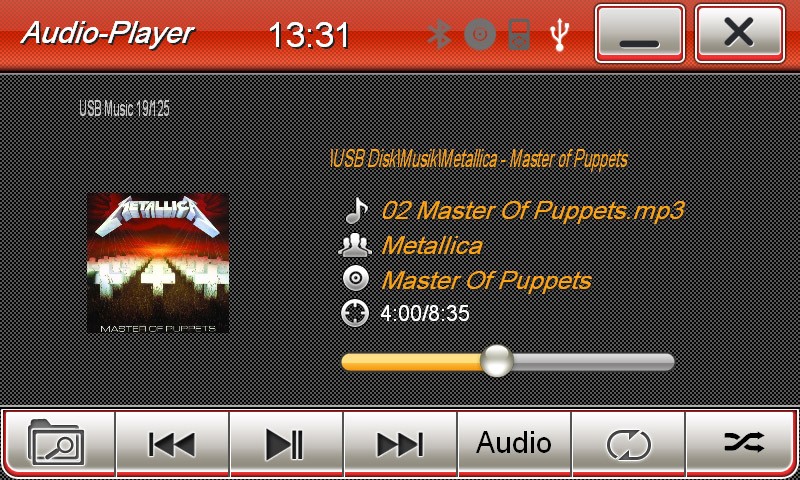 - Поддръжка на свързване с iPod, iPhone чрез USB включително показване на ID3 тагове