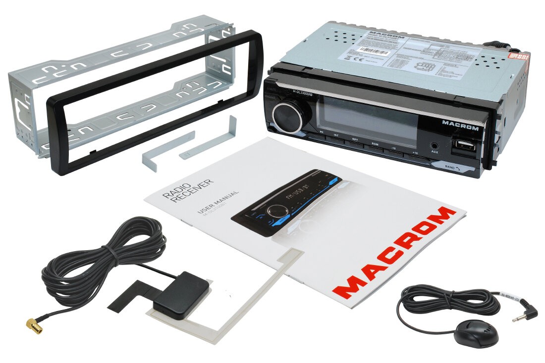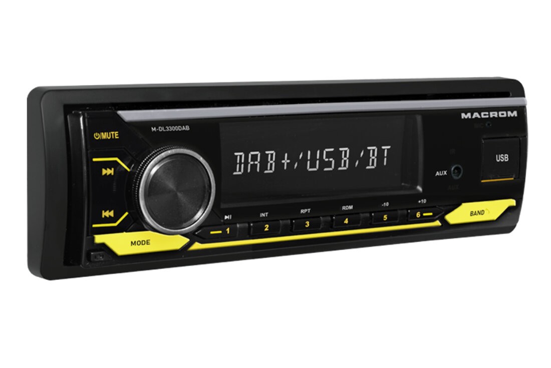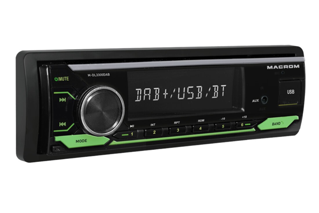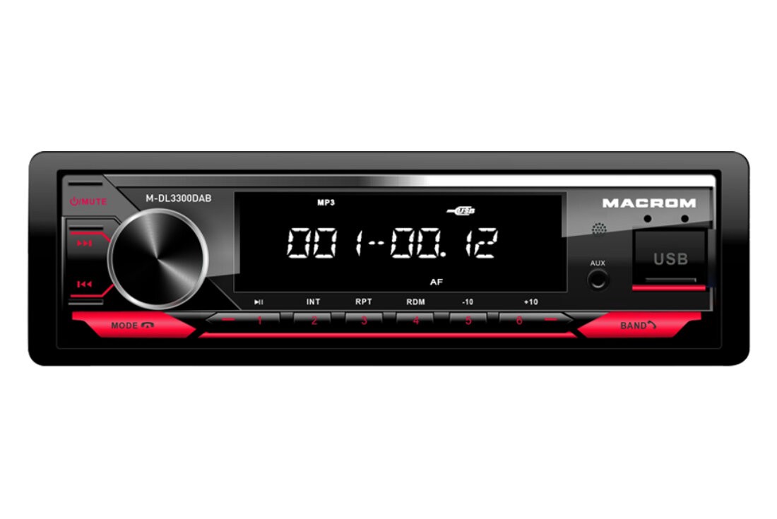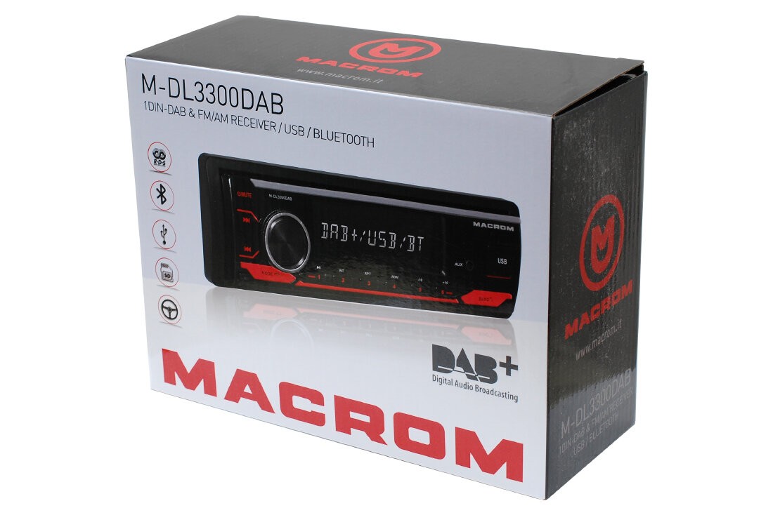MACROM M-DL3300DAB е модерен 1DIN автомобилно радио без CD механика, което комбинира цифров прием DAB/DAB+ с класически AM/FM RDS тунер. Благодарение на USB и micro SD слота на предния панел позволява лесно възпроизвеждане на музика в форматите MP3, WMA, FLAC и APE. Наличен е и AUX вход за външни устройства. Bluetooth HF комплект с външен микрофон осигурява чист звук при handsfree разговори и поддържа безжично възпроизвеждане на музика (A2DP). Радиото е оборудвано с MOSFET усилвател 4 × 50 W, четири RCA изхода за свързване на усилватели, трилентов еквалайзер и свалящ се преден панел. В комплекта е включена DAB антена за стъкло.