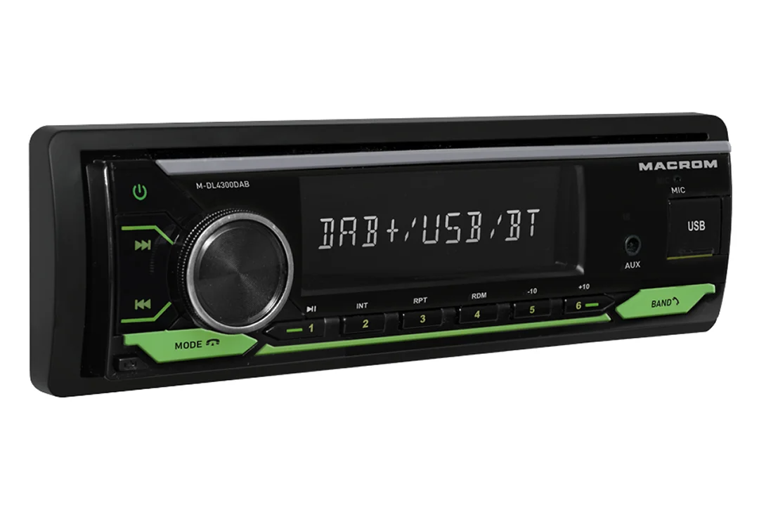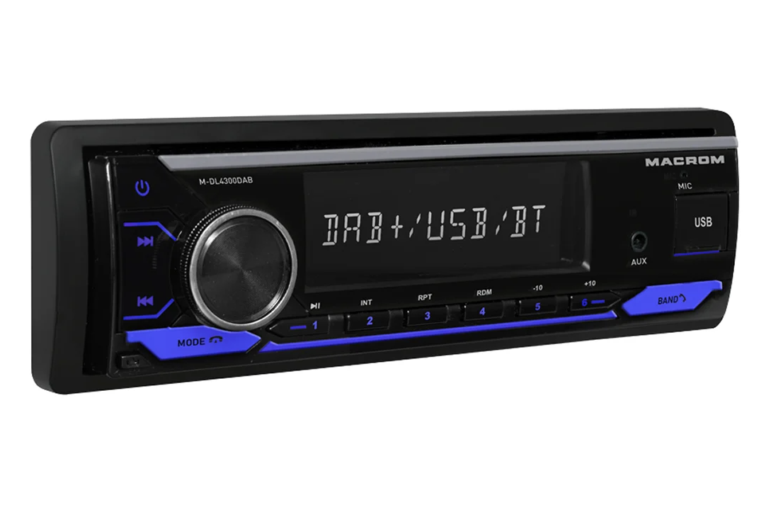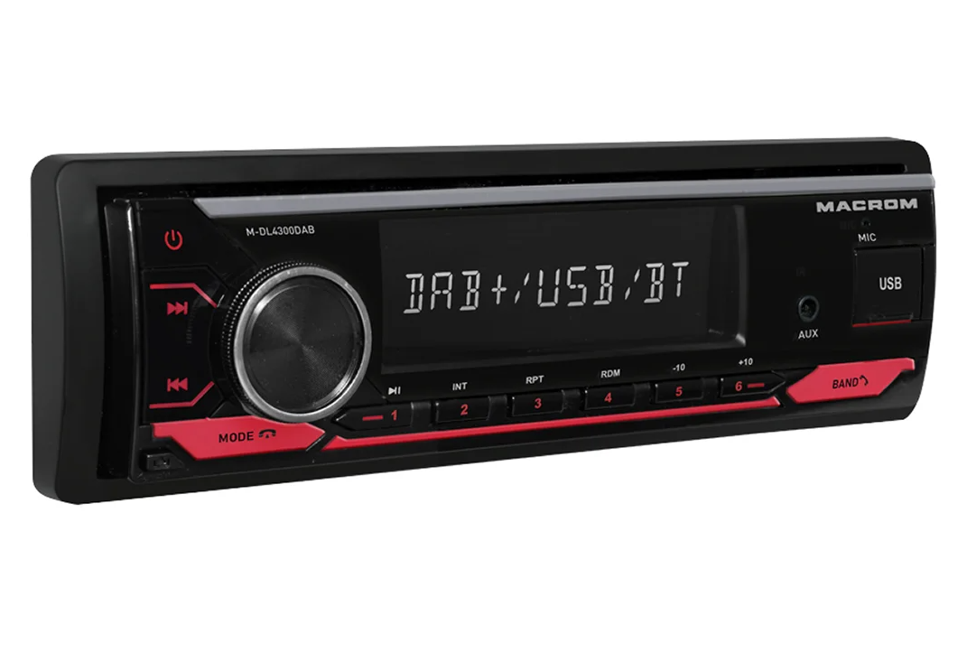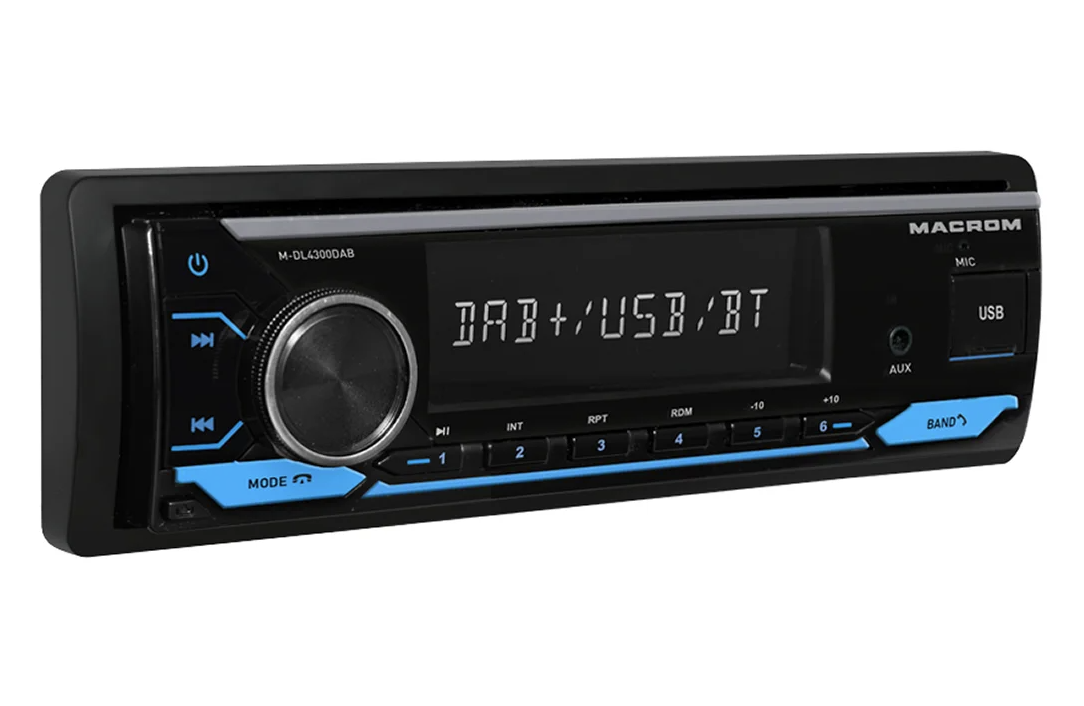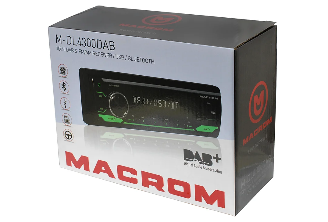 MACROM M-DL4300DAB е модерно 1DIN автомобилно радио без CD механика, което комбинира цифров и аналогов радиоприем. Освен класическия AM/FM тунер предлага и DAB/DAB+ тунер, който осигурява чист цифров звук и повече станции без шум. Благодарение на USB и micro SD слотовете на предния панел възпроизвежда музика във форматите MP3, WMA, FLAC и APE. Вградената Bluetooth HF система с микрофон в предния панел осигурява удобно handsfree провеждане на разговори и поддържа безжично възпроизвеждане на музика (A2DP). Радиото е оборудвано с MOSFET усилвател 4 × 50 W, четири RCA изхода за външни усилватели и сваляем преден панел. В комплекта е включена и DAB антена за стъкло.