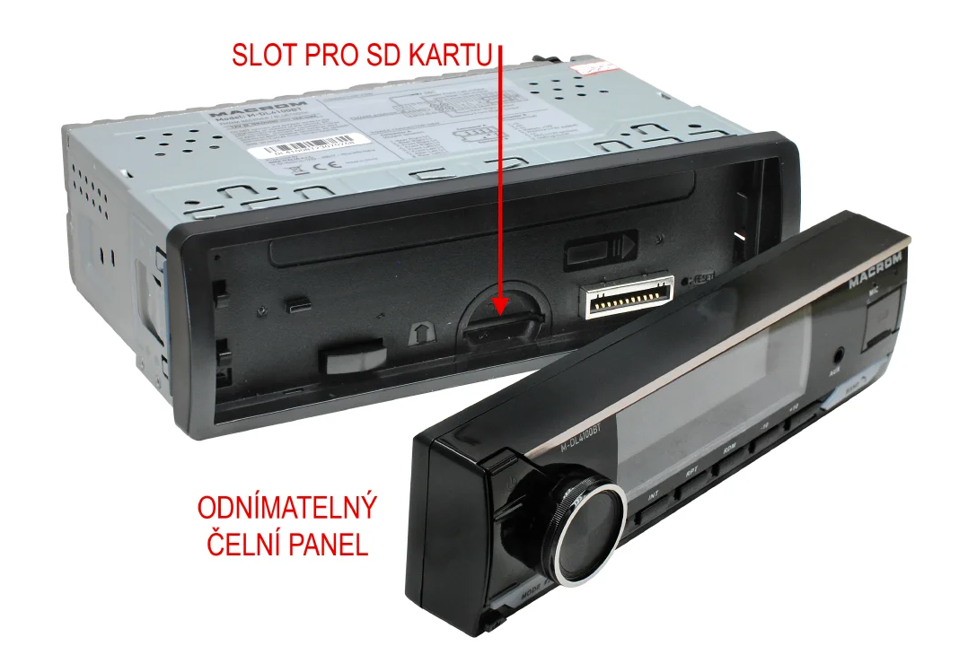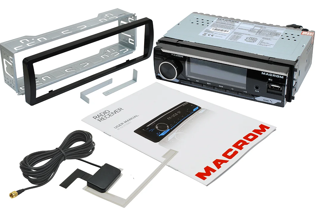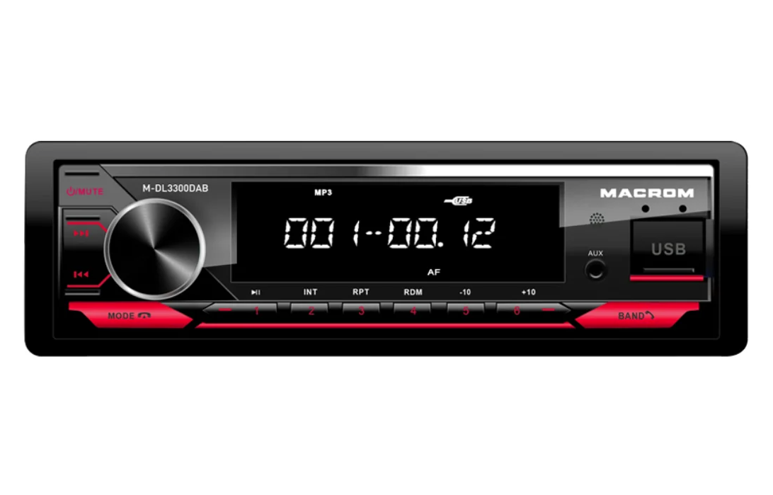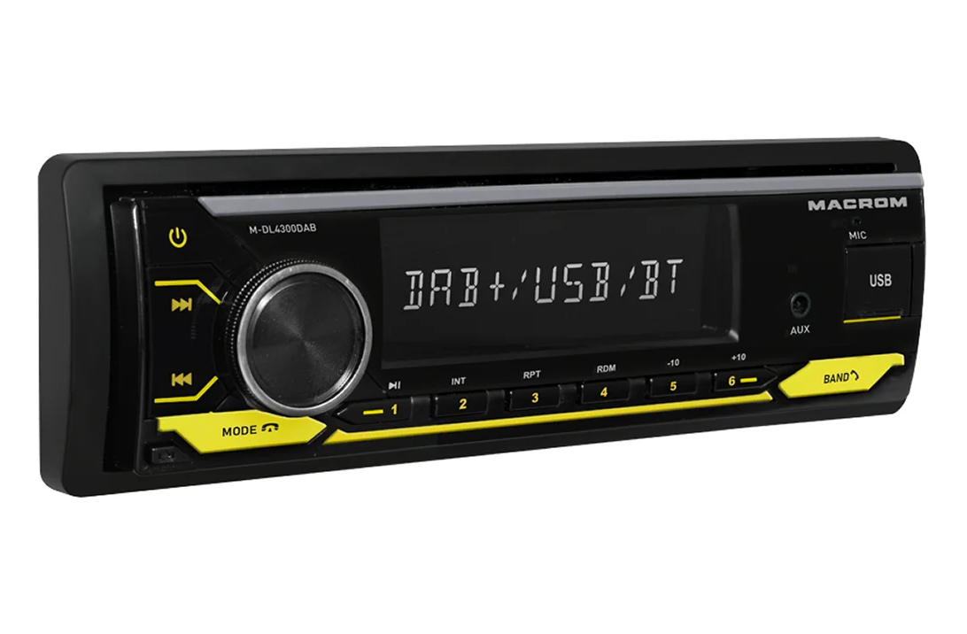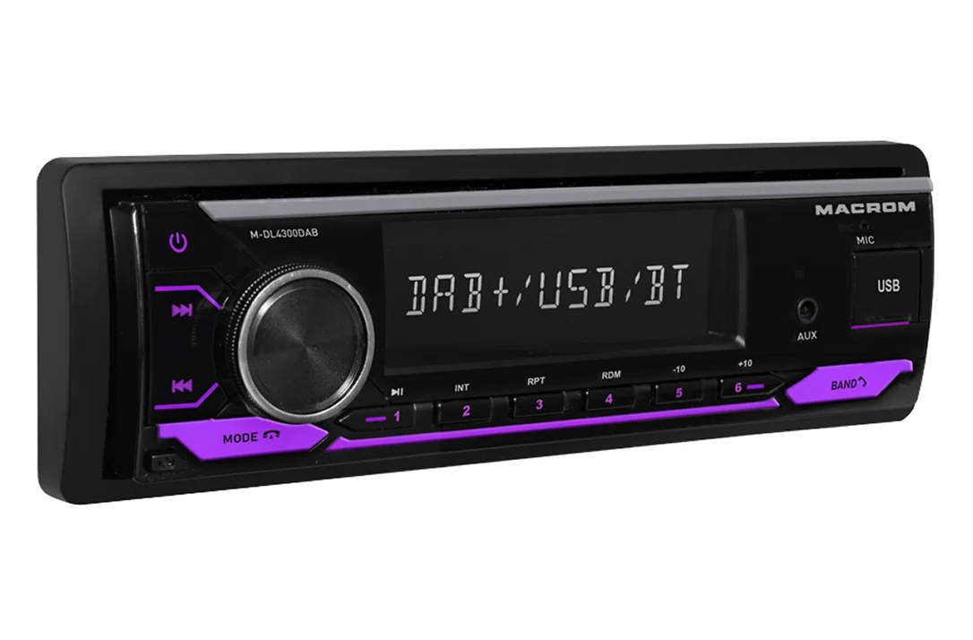 MACROM M-DL4300DAB е модерно 1DIN автомобилно радио без CD механика, което комбинира цифров и аналогов радиоприем. Освен класическия AM/FM тунер предлага и DAB/DAB+ тунер, който осигурява чист цифров звук и повече станции без шум. Благодарение на USB и micro SD слотовете на предния панел възпроизвежда музика във форматите MP3, WMA, FLAC и APE. Вградената Bluetooth HF система с микрофон в предния панел осигурява удобно handsfree провеждане на разговори и поддържа безжично възпроизвеждане на музика (A2DP). Радиото е оборудвано с MOSFET усилвател 4 × 50 W, четири RCA изхода за външни усилватели и сваляем преден панел. В комплекта е включена и DAB антена за стъкло.
