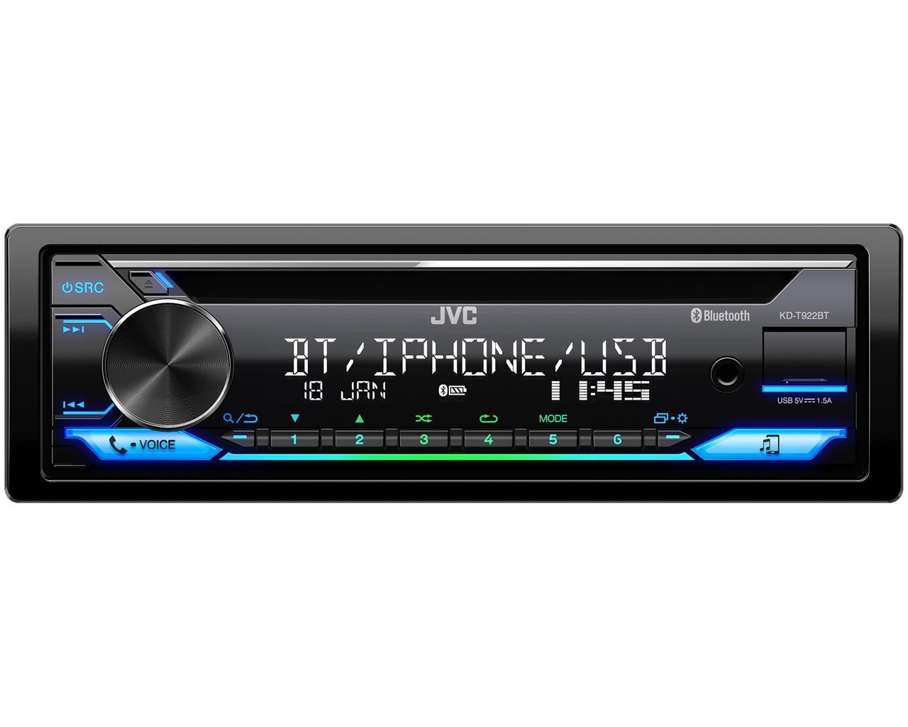 Автомобилното радио с CD плейър KD-T922BT от JVC разполага с интегрирана Bluetooth технология за hands-free разговори и безжично стриймване на музика. Доставя се с приложението Spotify и с приложението JVC Remote. Големият и лесно четим LCD дисплей ясно показва цялата информация в комбинация с променливо цветно подсветяване на клавишите за лесно управление. Мощният усилвател 4 x 50 W ще увеличи мощността на вашите говорители. Ако желаете да добавите външни усилватели, са налични три 2,5 V изхода. Качеството на звука е гарантирано от изцяло цифрова обработка на звука и времеви корекции заедно с 13-лентов графичен еквалайзер.Основни характеристики