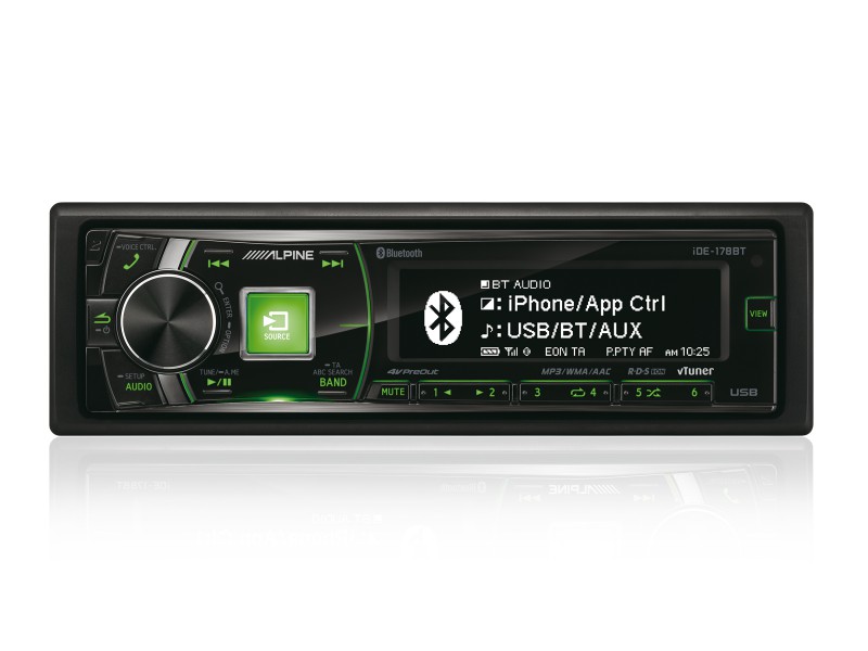 Приемник за цифрови медии Alpine IDE-178BT - безмеханична конструкция. Възпроизвеждане: MP3/WMA/AAC. 3 предусилвателни изхода (4 волта). 6-канална цифрова корекция на времевата база. 9-лентов параметричен еквалайзер. MediaXpander. Цифров кросоувър. Управление на нивото на субуфера и превключвател на фаза. Възможности за свързване: приложението TuneIt, стартиращо се на iPhone и Android. Вграден Bluetooth модул. BT Audio Streaming. vTuner съвместим с iPhone. Предназначен за iPhone и iPod. Режим App Direct. Заден USB порт с поддръжка на зареждане 1000 mA. Заден AUX вход (3,5 мм мини жак). Подготовка за свързване към интерфейс на автомобилен дисплей. Подготовка за управление от волана. Готов за дистанционно управление. Основни характеристики: LCD дисплей с висока резолюция. Непреустановим дизайн за автомобили със система start-stop. Бързо търсене. RDS тунер с поддръжка на TA и EON. Четирицветно сменяемо подсветяване (синьо/червено/зелено/жълто). Alpine IDE-178BT се доставя в комплекта с USB кабел и микрофон.