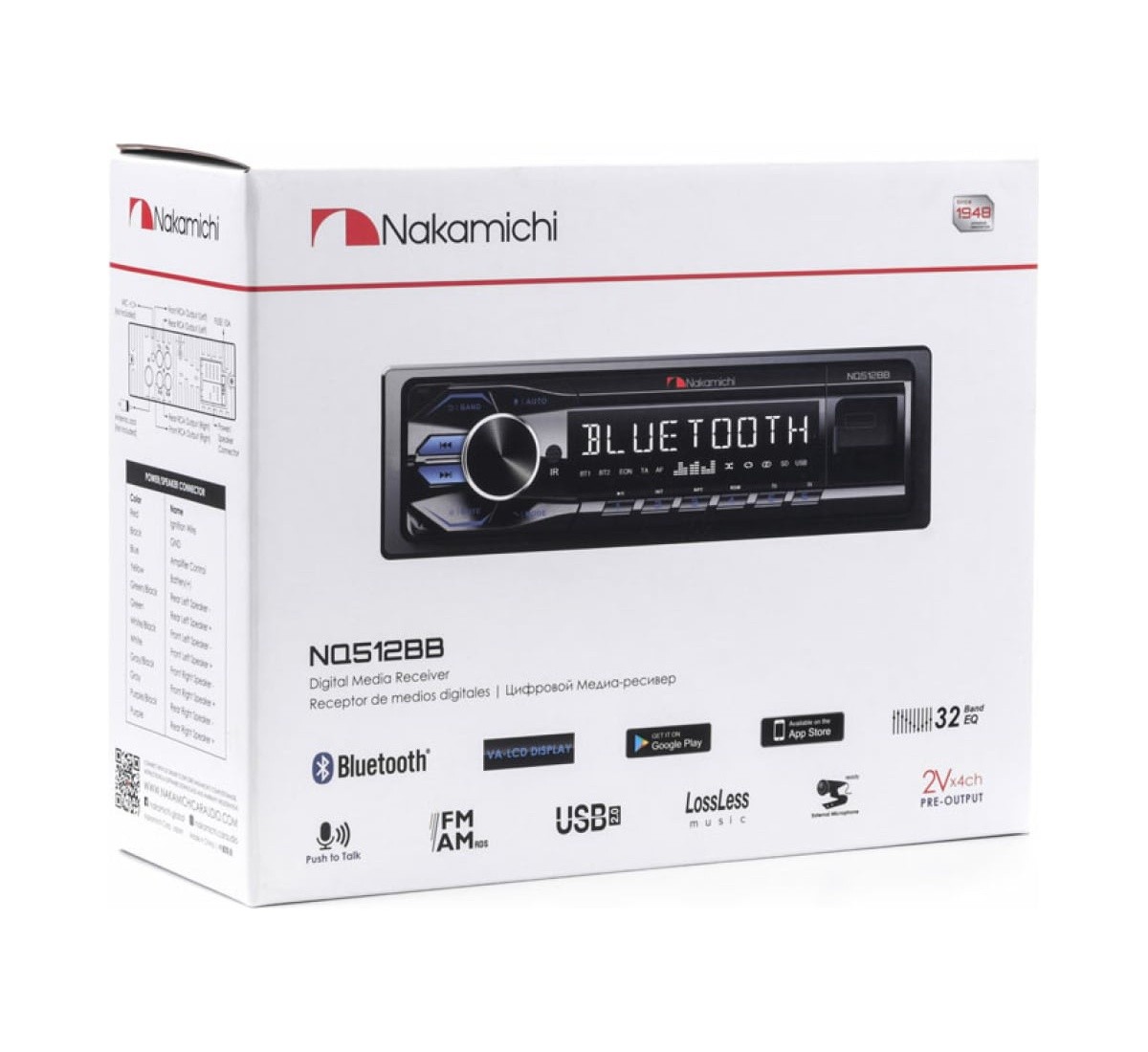 Nakamichi NQ512BB е базовият модел на този японски производител за 2023 г. със стандартно оборудване. Вземете вашия USB диск и го включете в USB порта за бързо прослушване на любимите си песни. Предният USB порт приема флаш памети до 64 GB и осигурява зареждане на мобилни устройства 5V/1A. Алтернативно можете да изберете стрийминг на песни чрез вградената функция Bluetooth. Bluetooth също позволява осъществяване и приемане на повиквания handsfree през самия приемник, вместо да се налага да отвличате вниманието към телефона. Авторадиото няма CD механика, но има преден USB вход. Поддържани формати на звуковите файлове: MP3, WAV, FLAC, WMA. NQ512BR има 2 чифта линейни изходи за свързване на външни усилватели. Корекцията на честотната характеристика се извършва от 32-лентов еквалайзер. Лицевият панел не е свалящ се.Най-интересни характеристики на авторадиото Nakamichi NQ512BB