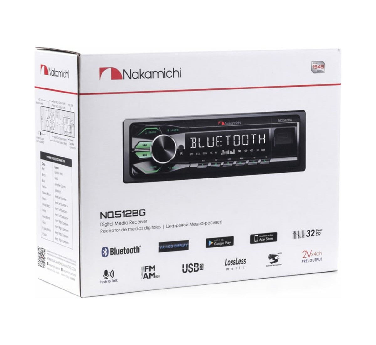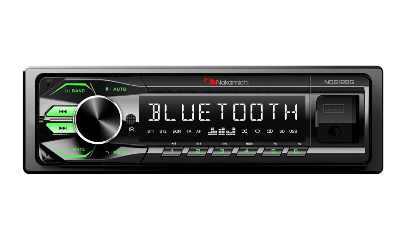Nakamichi NQ512BG е базовият модел на този японски производител за 2023 г. със стандартно оборудване. Вземете вашия USB диск и го включете в USB порта за бързо прослушване на любимите си песни. Предният USB порт приема флаш памети до 64 GB и осигурява зареждане на мобилни устройства 5V/1A. Алтернативно можете да изберете стрийминг на песни чрез вградената функция Bluetooth. Bluetooth също позволява осъществяване и приемане на повиквания handsfree през самия приемник, вместо да се налага да отвличате вниманието към телефона. Авторадиото няма CD механика, но има преден USB вход. Поддържани формати на звуковите файлове: MP3, WAV, FLAC, WMA. NQ512BR има 2 чифта линейни изходи за свързване на външни усилватели. Корекцията на честотната характеристика се извършва от 32-лентов еквалайзер. Лицевият панел не е свалящ се.Най-интересни характеристики на авторадиото Nakamichi NQ512BG