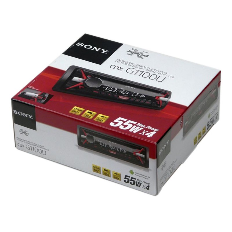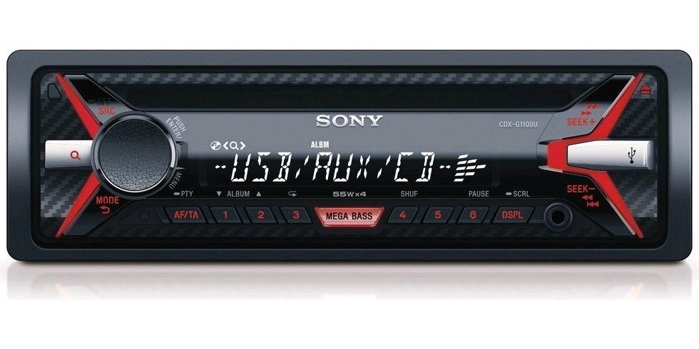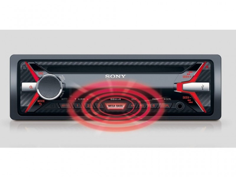 Авторадио SONY размер 1 DIN с CD плейър, USB вход, MEGA BASS EQ5 и изходна мощност 4 x 55W, червен цвят на подсветката.