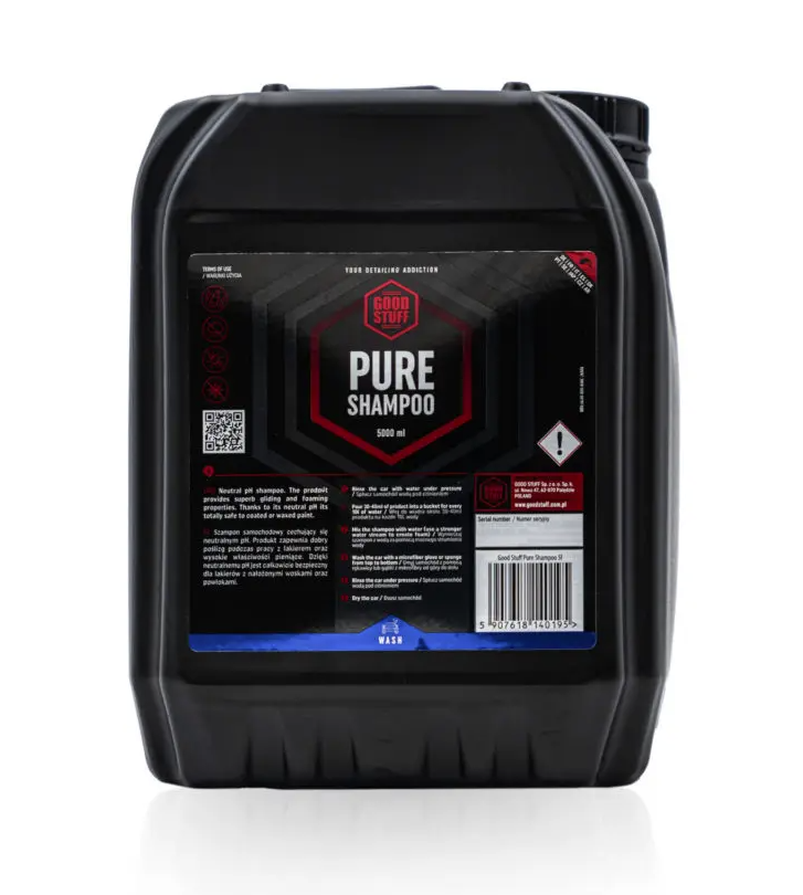 Good Stuff Pure Shampoo е шампоан с pH-неутрален състав, който осигурява отлични смазващи и пенообразуващи свойства. Благодарение на неутралното pH е напълно безопасен за превозни средства, защитени с восък или керамично покритие. По-добър работен комфорт предлага и ниската склонност на разтвора към бързо изсъхване и аромат на бисквити.Основни характеристики