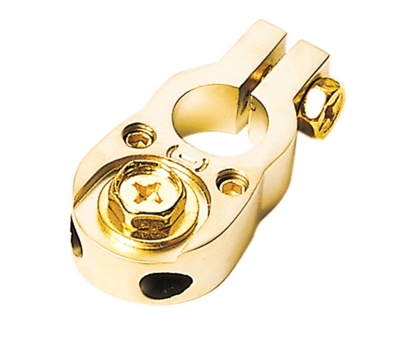 - Минусова позлатена клема за акумулатор, подходяща за всички масови видове акумулатори. Осигурява дълготраен пренос на енергия без риск от корозия.