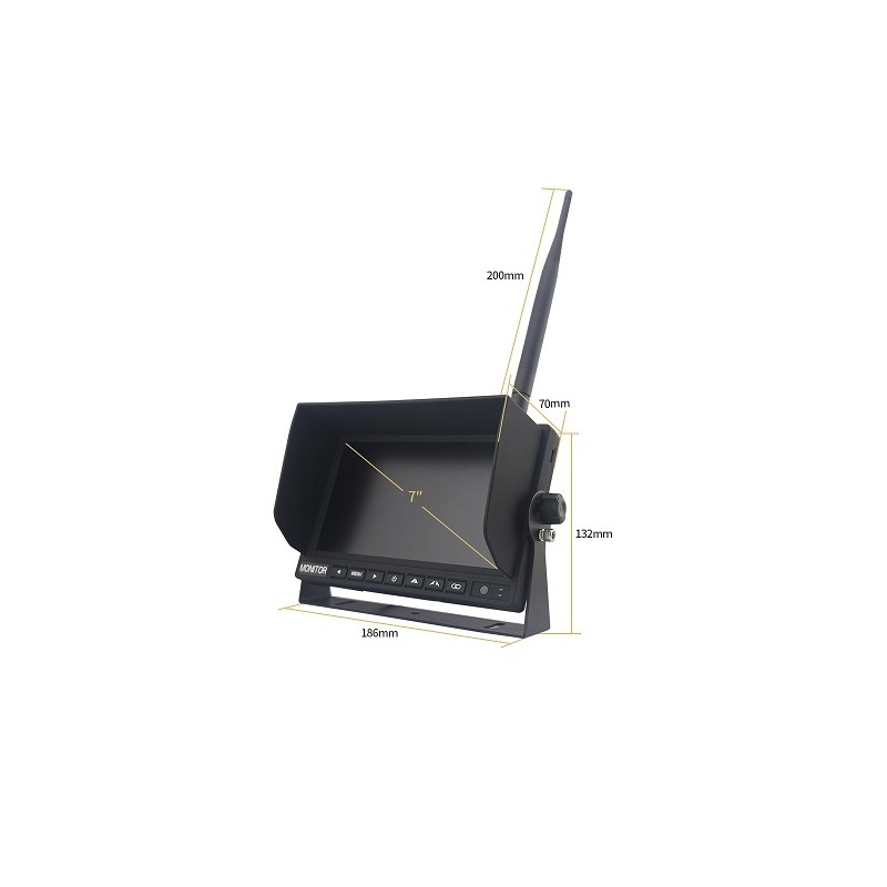 AHD безжичен комплект камера 720p / монитор 7\" за превозно средство с камера с IR подсветка. Резолюция на монитора 1024 x 600, за свързване на до четири камери, едновременно показване на кадри от няколко камери, 12/24 V, възможност за завъртане на изображението с 180°, просто и бързо решение за свързване на камера (като паркинг или странична камера, или камера в товарното пространство).