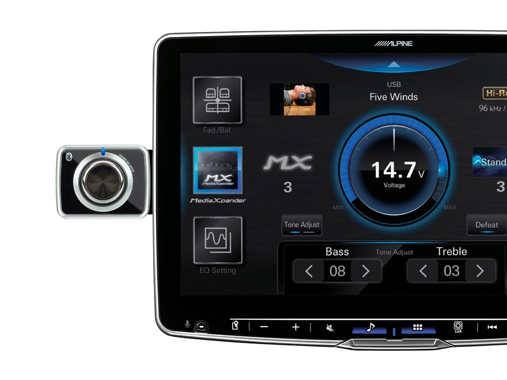 Сензорните бутони на Alpine Halo 11 и Halo 9 изглеждат много елегантно и чисто, но много клиенти предпочитат въртящ се контролер за по-удобно регулиране на силата на звука, особено по време на шофиране. Новото безжично дистанционно за управление на силата на звука RUE-BK01 ви дава бърз достъп до главната сила на звука на вашата система и дори позволява да активирате задна камера с просто натискане на въртящия кодер. Контролерът RUE-BK01 може да се монтира от която и да е страна на дисплея Halo или да се използва във всяка персонална инсталация на централната конзола или на други подходящи места.