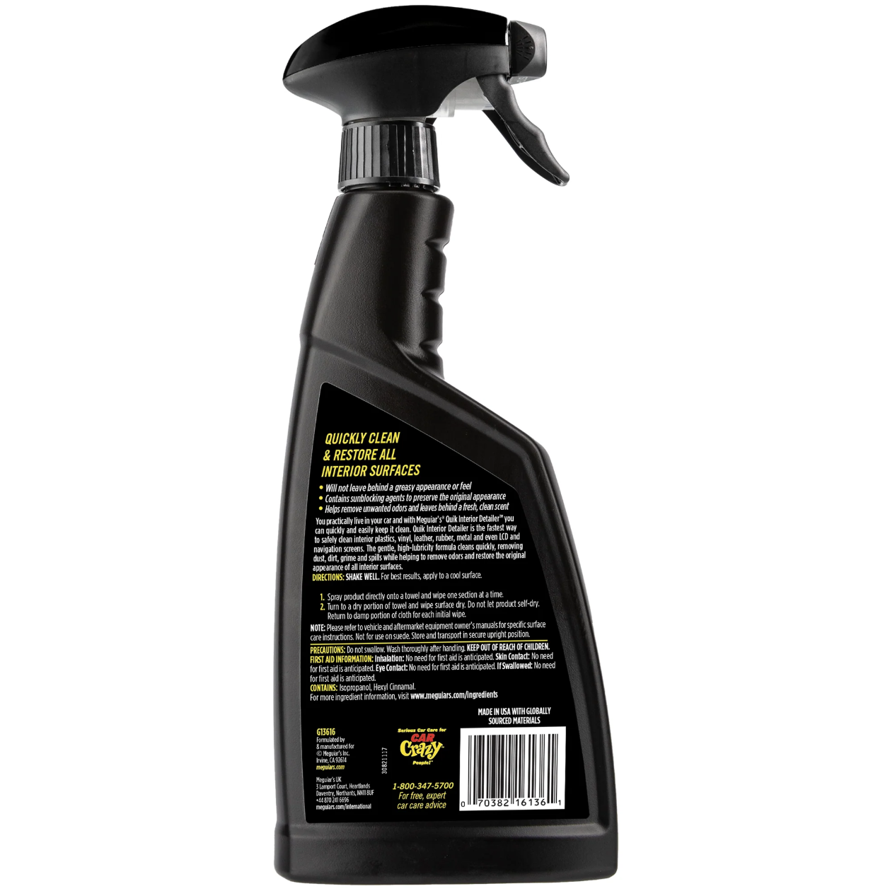 Meguiar’s Quik Interior Detailer е мощен и в същото време нежен спрей-детайлер, предназначен за почистване на интериора на автомобила. Неговата нежна, високо лубрикирана формула позволява безопасно и ефективно премахване на прах, отпечатъци от пръсти, мазнини, замърсявания и петна от пластмаси, винил, кожа, гума, метал и от тъчскрийн и навигационни екрани. Продуктът съдържа UV блокатори, които помагат да се защитят повърхностите от избледняване, напукване и стареене под влияние на слънцето. След нанасяне повърхностите остават свежи и поддържани, без мазен филм или нежелан блясък - интериорът изглежда като току-що детайлиран.