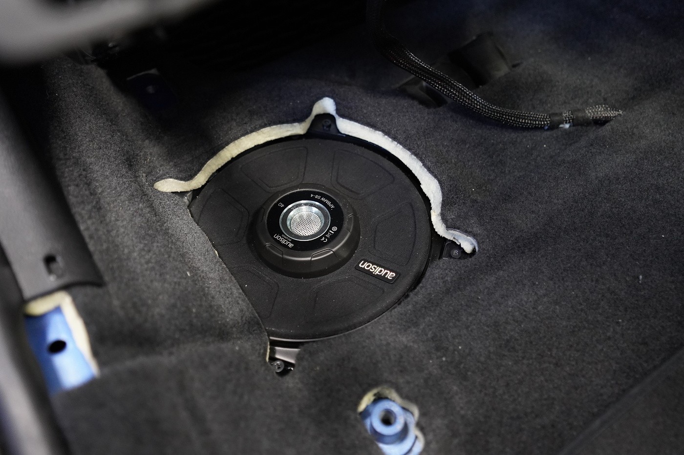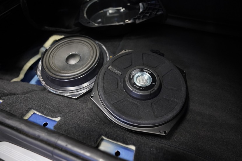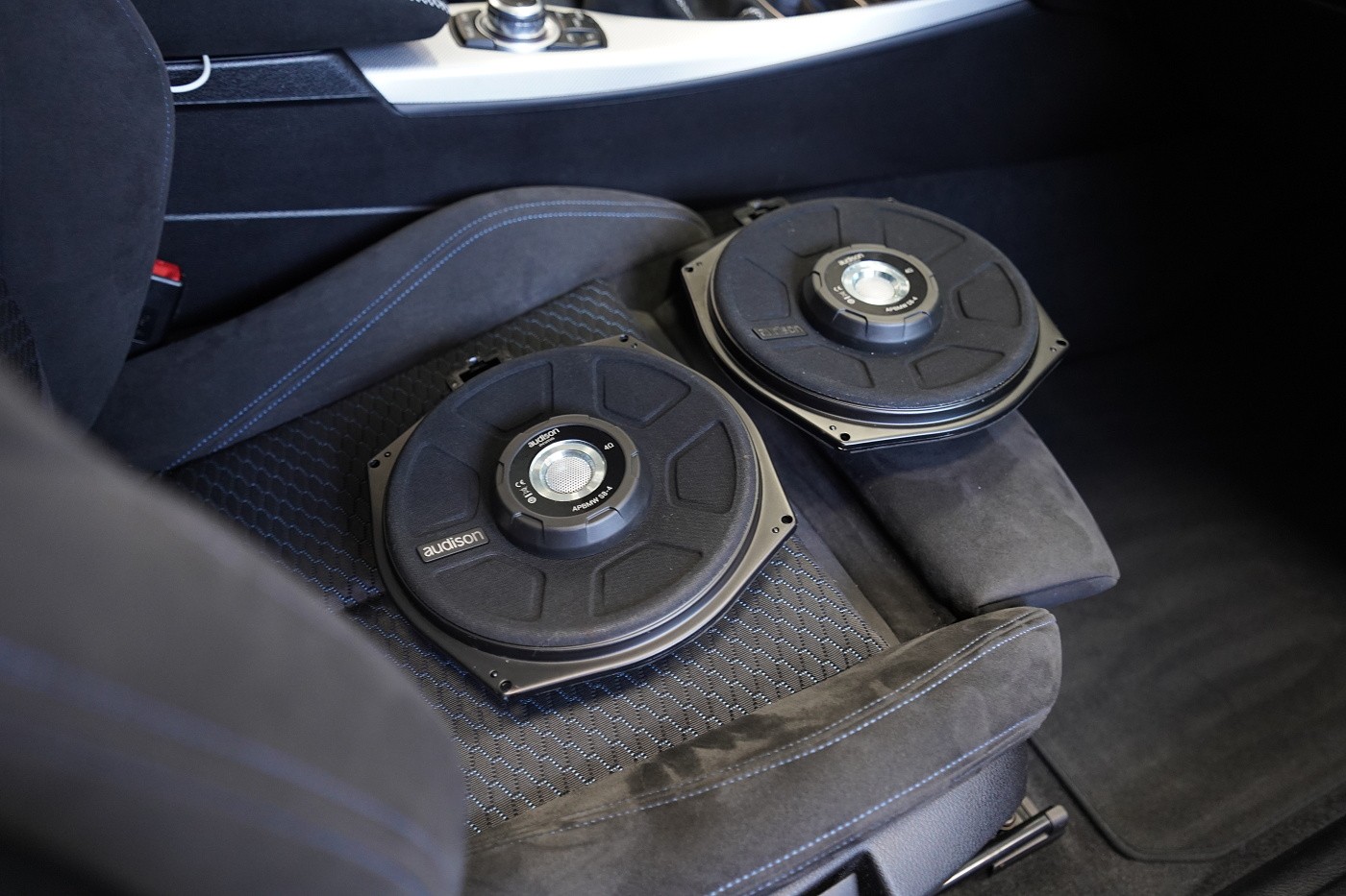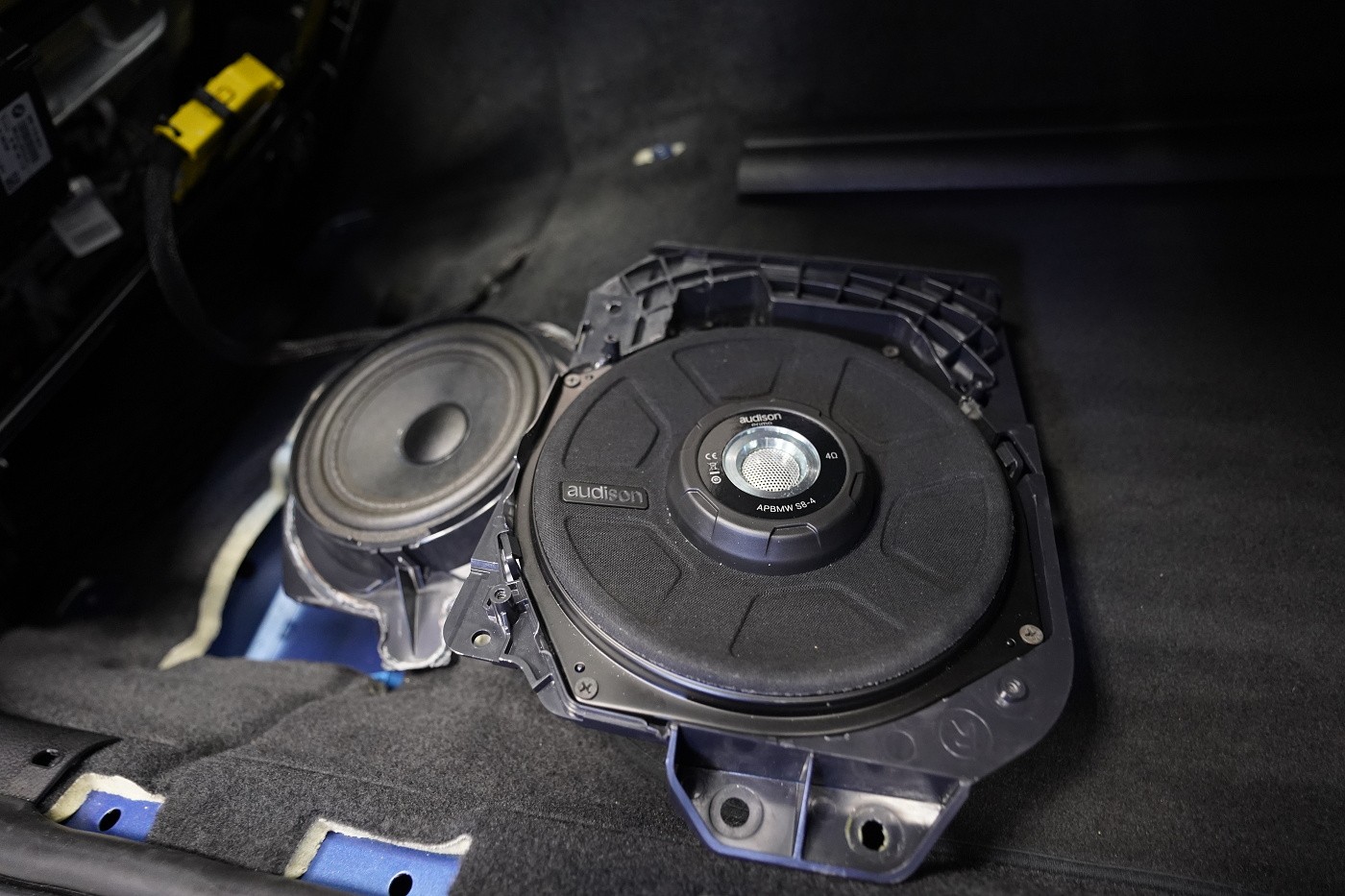 Монтаж на високоговорители и субуфери Audison в BMW серия 1. От нашите инсталации в BMW сте свикнали основно с пълни озвучителни системи Audison, включително усилвател с DSP процесор, но голямата разлика се усеща и само при смяната на високоговорителите, свързани към фабричното радио. В тази инсталация заменихме предните високоговорители и субуферите. В автомобила имаше базово озвучаване без високочестотни говорители и малки хартиени субуфери с диаметър 165 mm. Оригиналните високоговорители в предните врати заменихме с компоненти Audison, които имат същата форма и конектори като фабричните говорители. Така че те се подменят лесно. Поради липсата на високочестотни говорители е необходимо да се закупят оригиналните решетки за високоговорители, които за този модел се продават само с логото Harman Kardon. Говорителите освен много качествен звук имат и висока чувствителност, така че на същия източник звучат по-силно и без изкривяване при по-високи нива. Същото важи и за субуферите под седалката. Същата форма, но по-голям размер 200 mm и несравнимо по-качествена и по-изразена басова част. Препоръчваме субуферите винаги да се свързват към усилвател, но дори директната замяна има значителен ефект благодарение на високата чувствителност на новите субуфери Audison.