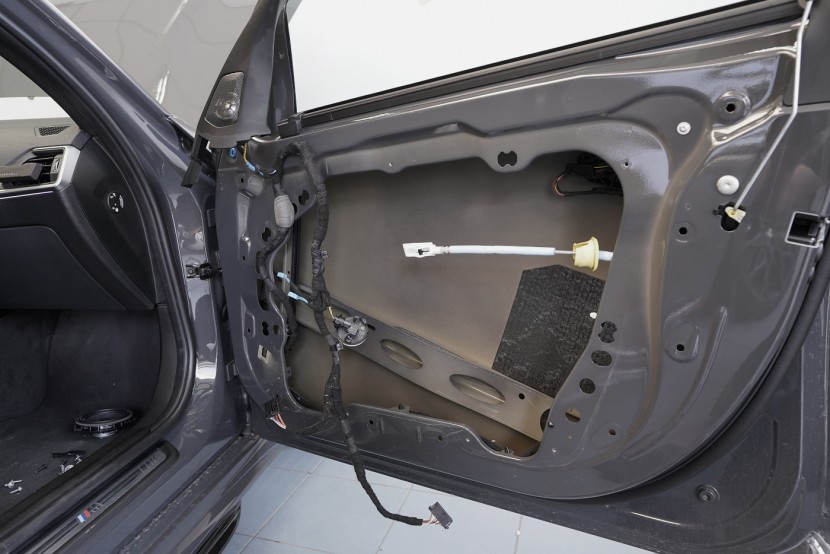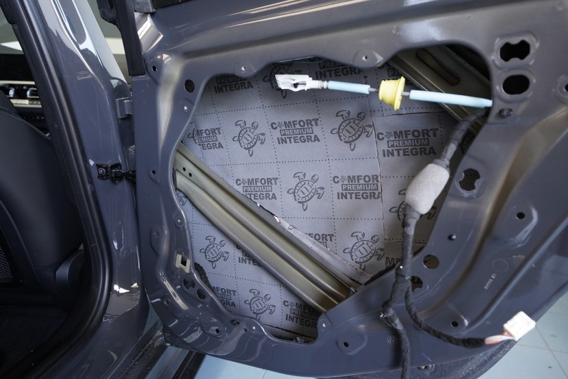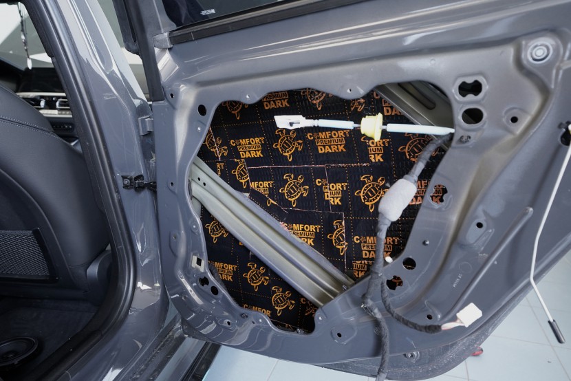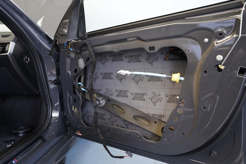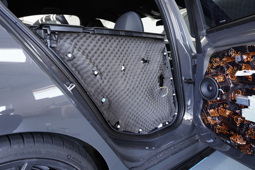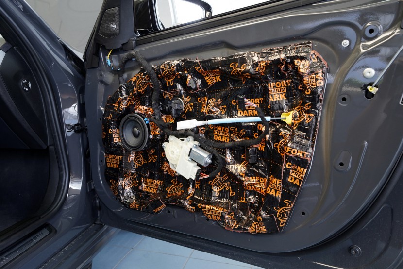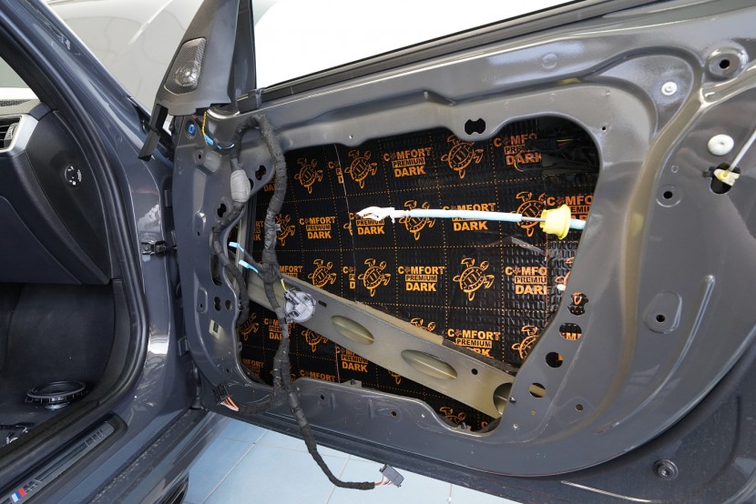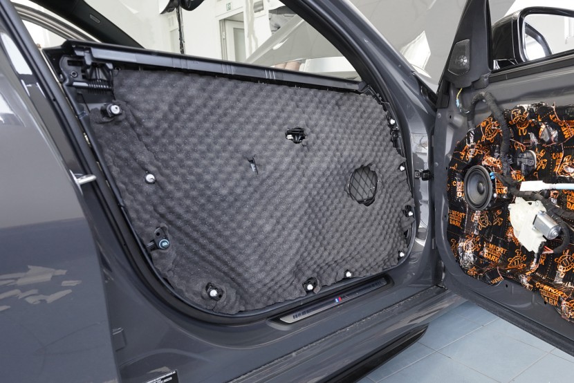 Шумоизолация на всички врати и калници на BMW 3 от най-новата моделна серия. Ако искате да намалите шума в интериора на автомобила, подходящо решение е да започнете именно от вратите. Чрез тях прониква висок процент шум в купето и качествено шумоизолирани врати могат значително да намалят шума от пътя. Предните и задните врати шумоизолираме общо в 4 слоя, тъй като това е област, силно натоварена с вибрации и шум. Надеждно шумоизолирахме и предните, и задните калници. При този автомобил вместо класическите пластмасови подкалници те са текстилни. Затова шумоизолираме металната част на подкалника с два слоя. Първият слой е антивибрационен материал от серията Premium с дебелина 4 mm, а като втори слой нанасяме звукоизолационния материал Blockshot също от серията Premium. Blockshot благодарение на своя състав и уникална противошумна мембрана е в състояние да намали шума до 32 dB и ще покаже способностите си и на предните, и на задните калници на този автомобил. Макар че извършихме само базова шумоизолация, благодарение на висококачествените мембранни материали Comfortmat успяхме значително да намалим шума в интериора. Монтажът на шумоизолацията при този автомобил отне повече време от обичайното заради наличието на механизъм за повдигане на прозореца, който трябваше да демонтираме, както и всички стъкла бяха свалени.Показване на продуктиСкриване на продукти