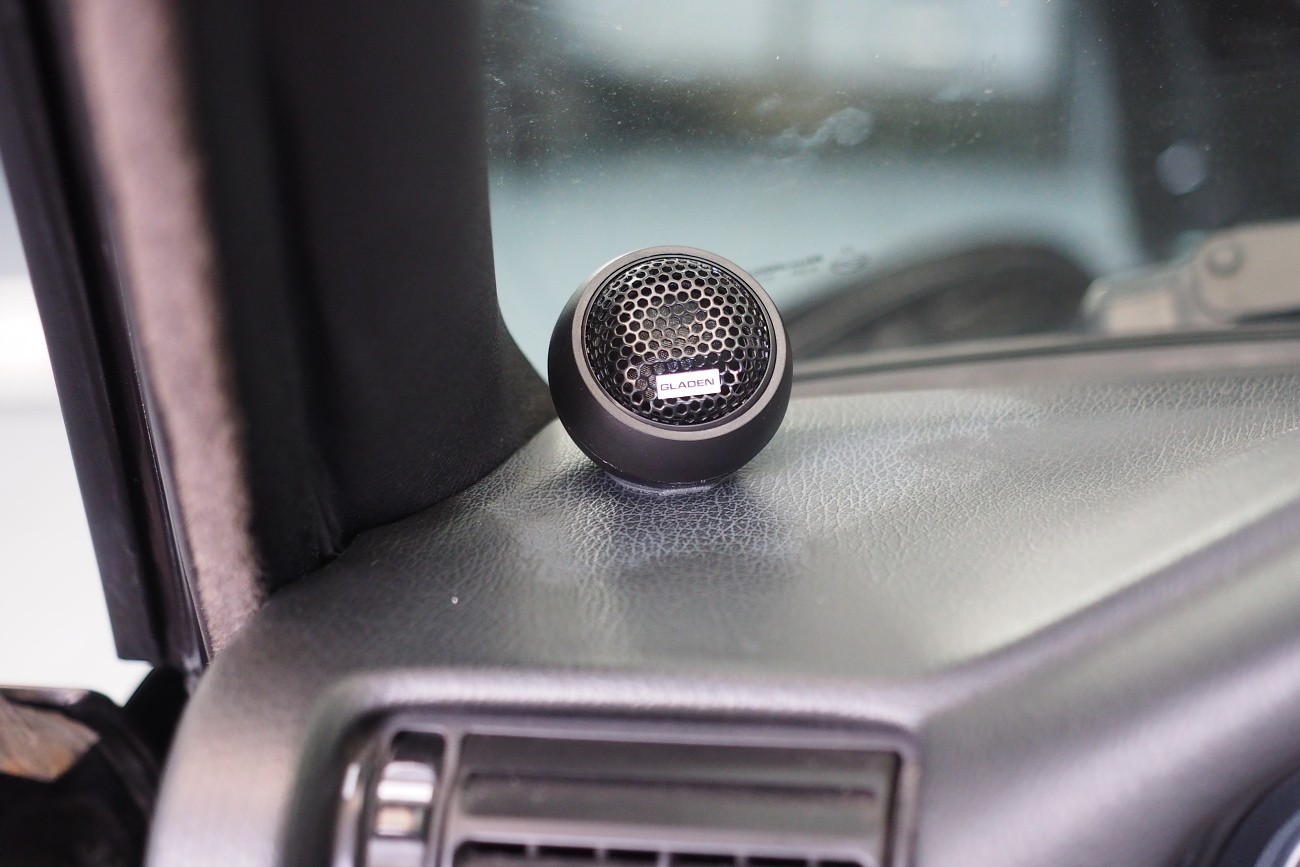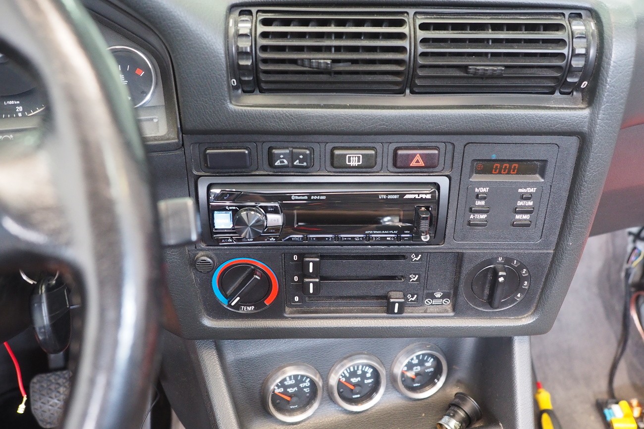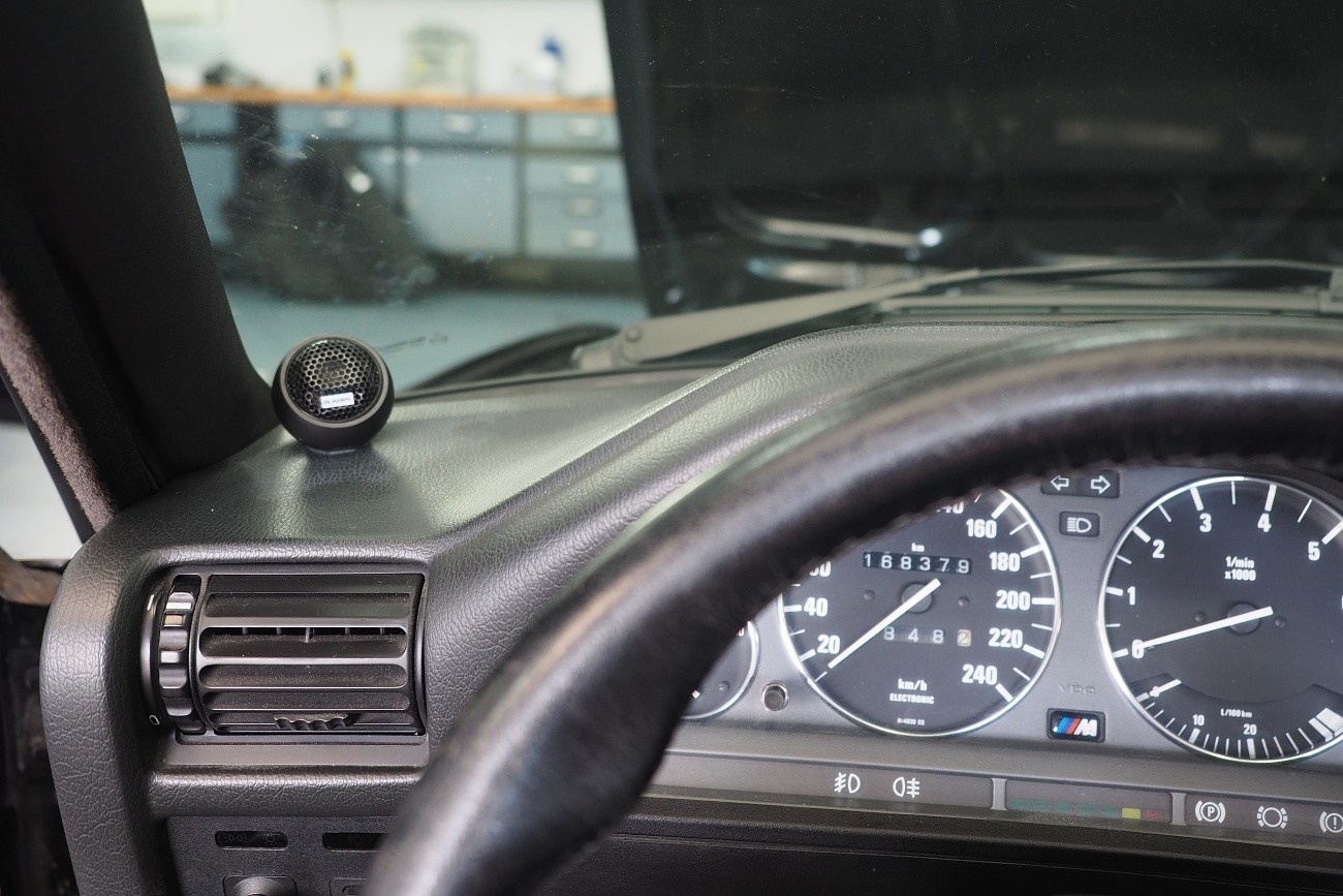 Смяна на износената звукова система в автомобила BMW E30 Cabrio. Инсталирахме ново авторaдио Alpine с USB слот и bluetooth handsfree и също така заменихме оригиналните говорители. В предната част поставихме компонентни говорители Gladen от серията RS и в задната — коаксиални говорители Kicker с ниска монтажна дълбочина. Всички говорители бяха свързани към усилвател Gladen.