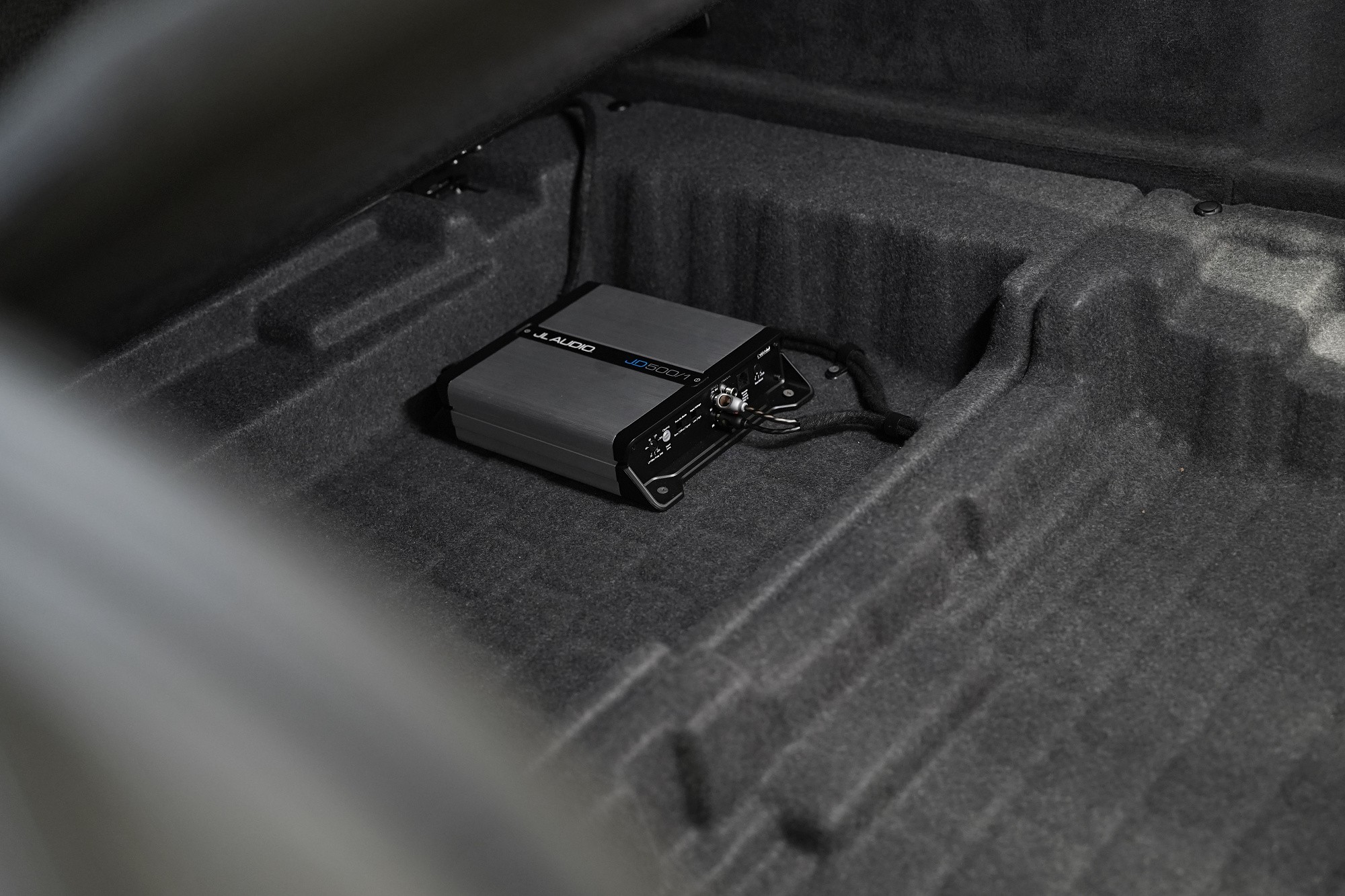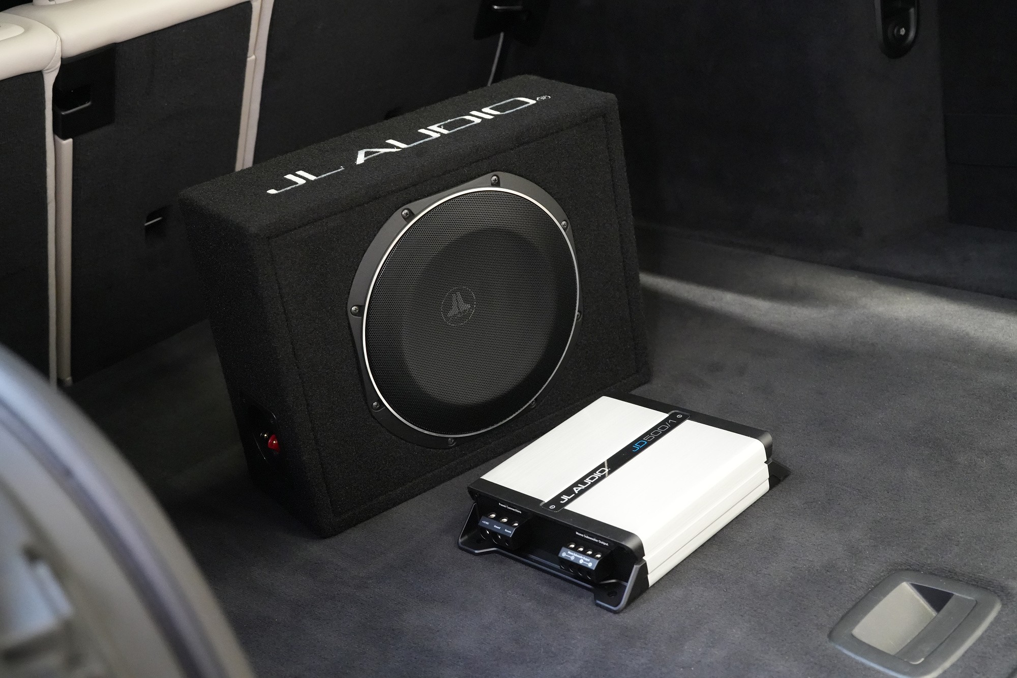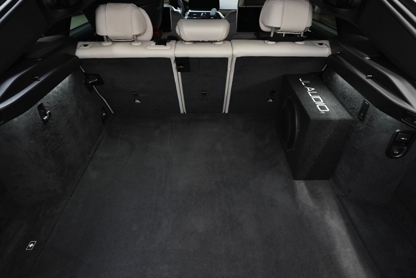 Montáž subwooferu od JL Audio a zesilovače téhož výrobce. Pokud se řekne JL Audio, napadnou mnohé výhradně subwoofery do auta. JL Audio totiž nabízí jedny z nejkvalitnějších subwooferů na trhu. V tomto BMW byl z výroby nejvyšší tovární audio systém Bowers & Wilkins, jeho majitel však postrádal zejména výraznější basovou složku. Zároveň bylo podmínkou kromě kvalitního podání nízkých kmitočtů co nejméně omezit prostor v kufru. Společně vybrali kompaktní uzavřený box s plochým desetpalcovým subwooferem série TW1. Výkon 300 W RMS a pověstná kvalita zvuku od JL Audio je zárukou pořádné dávky basů pro tento již poměrně kvalitně ozvučený vůz (samozřejmě na poměry továrního zvuku). A jelikož subwoofery od JL vyžadují i zesilovač stejné kvality, jasnou volbou byl monoblok taktéž JL Audio, který jsme umístili do dvojitého dna zavazadlového prostoru.