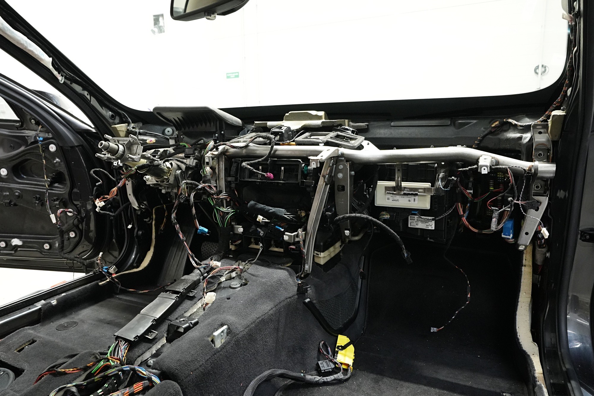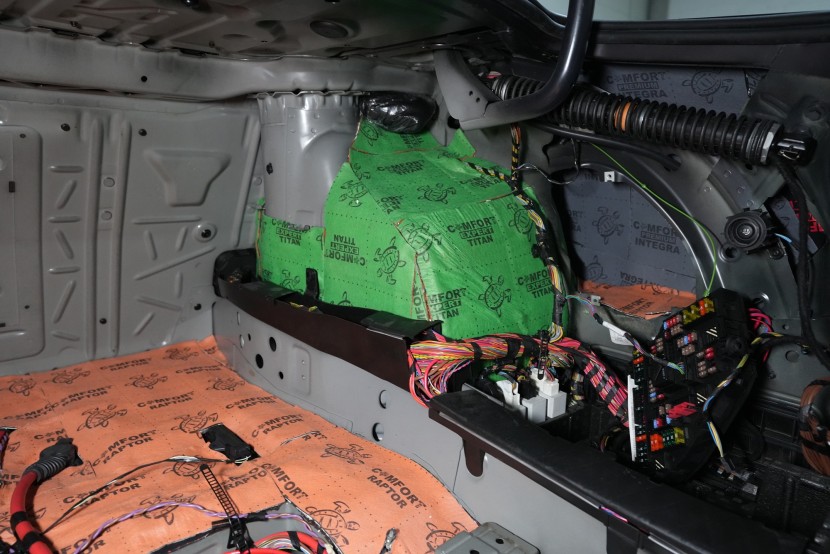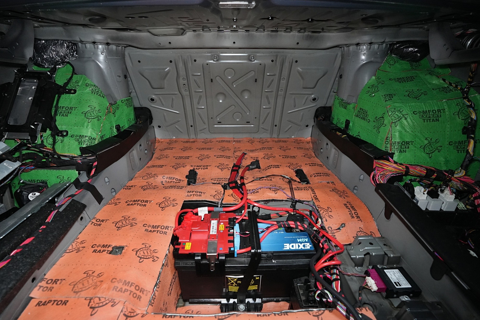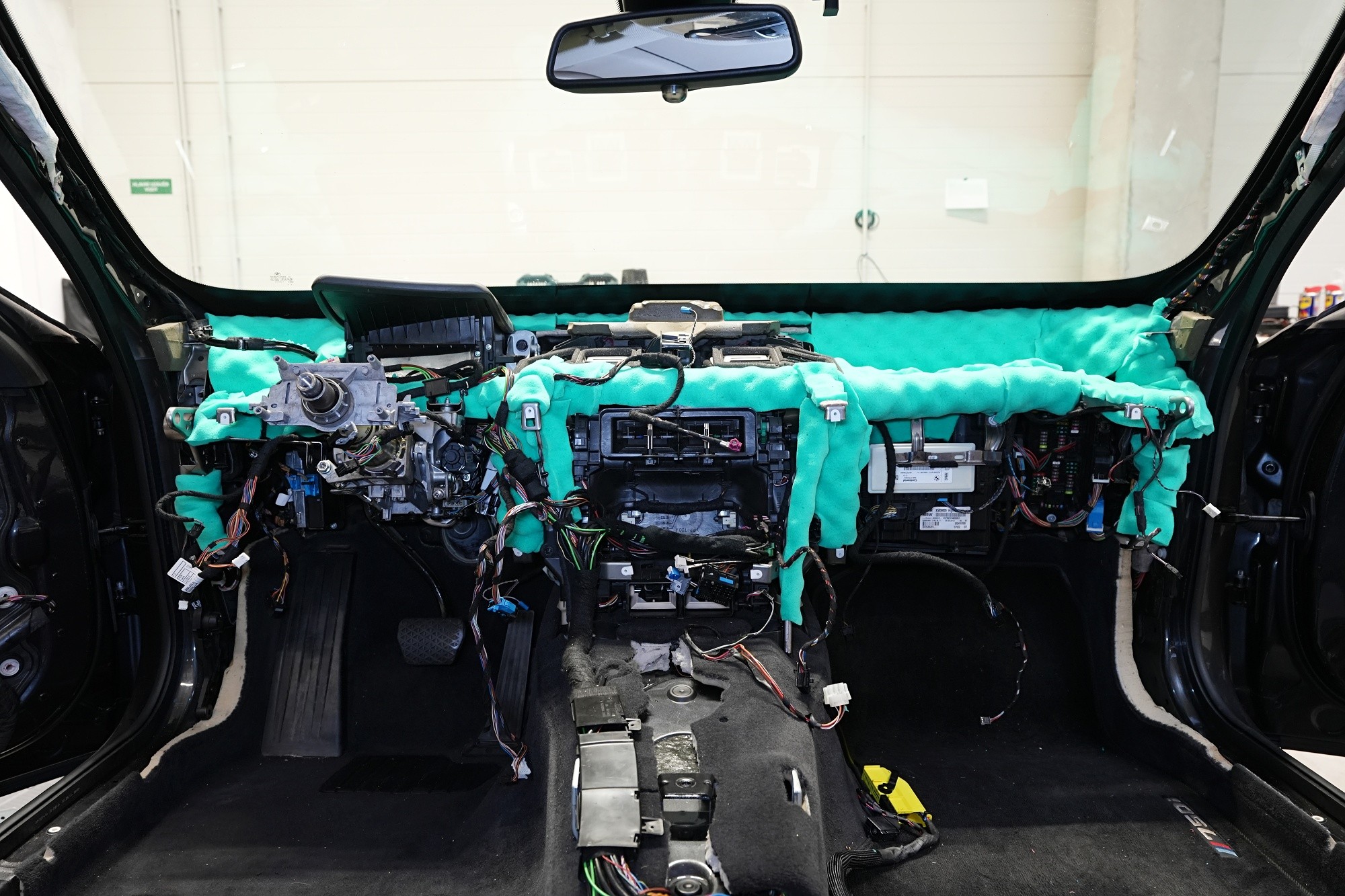 Шумоизолиране и озвучаване на автомобил BMW от 7-ма серия. Изискването на клиента беше ясно — максимално да шумоизолираме този флагман на BMW. Най-високата седмична серия е сред най-добре шумоизолираните автомобили, но както при всички превозни средства, това разбира се може да бъде направено още по-добре. При тази инсталация обърнахме по-голямо внимание и на шума от двигателя, от големите джанти Alpina и най-вече на скърцането в интериора. Поради това демонтирахме и напълно шумоизолирахме таблото и внимателно обработихме предните и задните калници както отвътре, така и отвън. Също така всички пластмасови детайли бяха обработени с подходящи демпфериращи материали и ленти за максимално предотвратяване на триене на пластмасите. След това продължихме по стандартния начин, но с използване на най-ефективните материали на водещия производител Comfortmat. Конкретно избрахме нашия пакет шумоизолация Premium Plus, който индивидуално адаптирахме за максимална ефективност. Насочихме се към всички ключови области на автомобила — предни, задни и петоалвите врати, пода, багажното отделение, предните и задните калници отвътре и отвън, капака и споменатото табло. Посветихме се и на озвучаването от италианския производител Audison, което е изключително не само със своето качествено звучене и висока мощност, но и с монтаж без никаква намеса в оригиналната електроинсталация. Това е възможно благодарение на разработена система с окабеляване, която осигурява пълна интеграция към фабричния главен блок, без да се налага рязане, запояване или полагане на ново окабеляване. Говорителите и субуферите Audison имат същите размери, форма, крепеж и конектори като фабричните говорители и цялото решение е в духа на Plug & Play. Всичко ново се управлява от осемканален цифров усилвател с DSP процесор Audison, който доставя мощност за всички говорители и субуфери. Последната фаза от инсталацията е измерване на звука с калибриран микрофон и прехвърляне на резултатите в софтуера на DSP процесора. Там настройваме подредбата на говорителите, времевите корекции според разположението на говорителите и детайлен еквалайзер. Резултатът е висококачествен звук, настроен специално за дадения автомобил, който по качество и мощ значително надминава дори допълнителните аудиопакети от по-висок клас от Harmann Kardon.