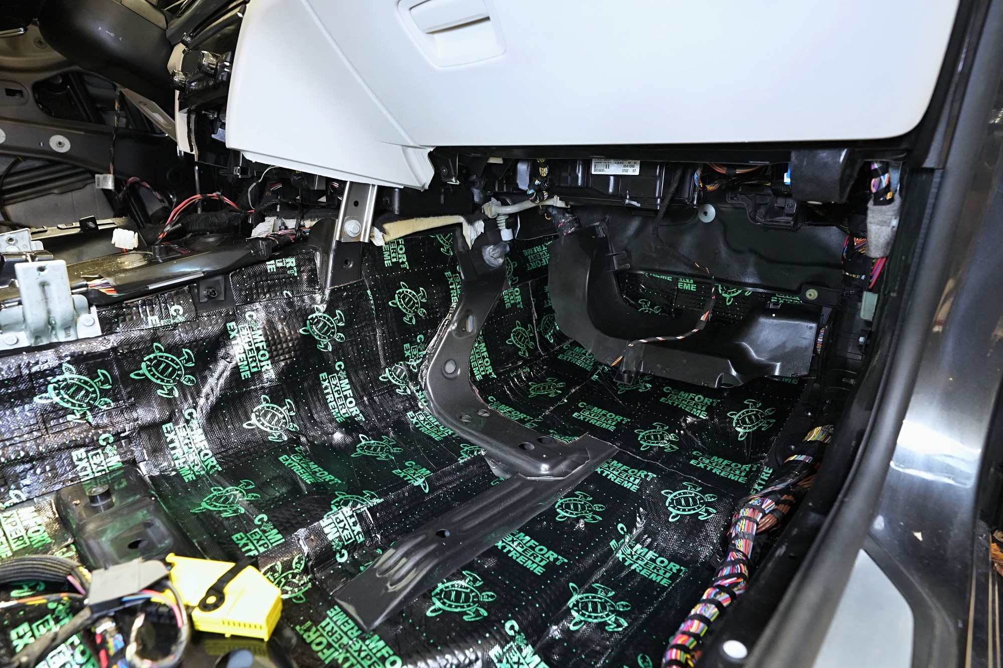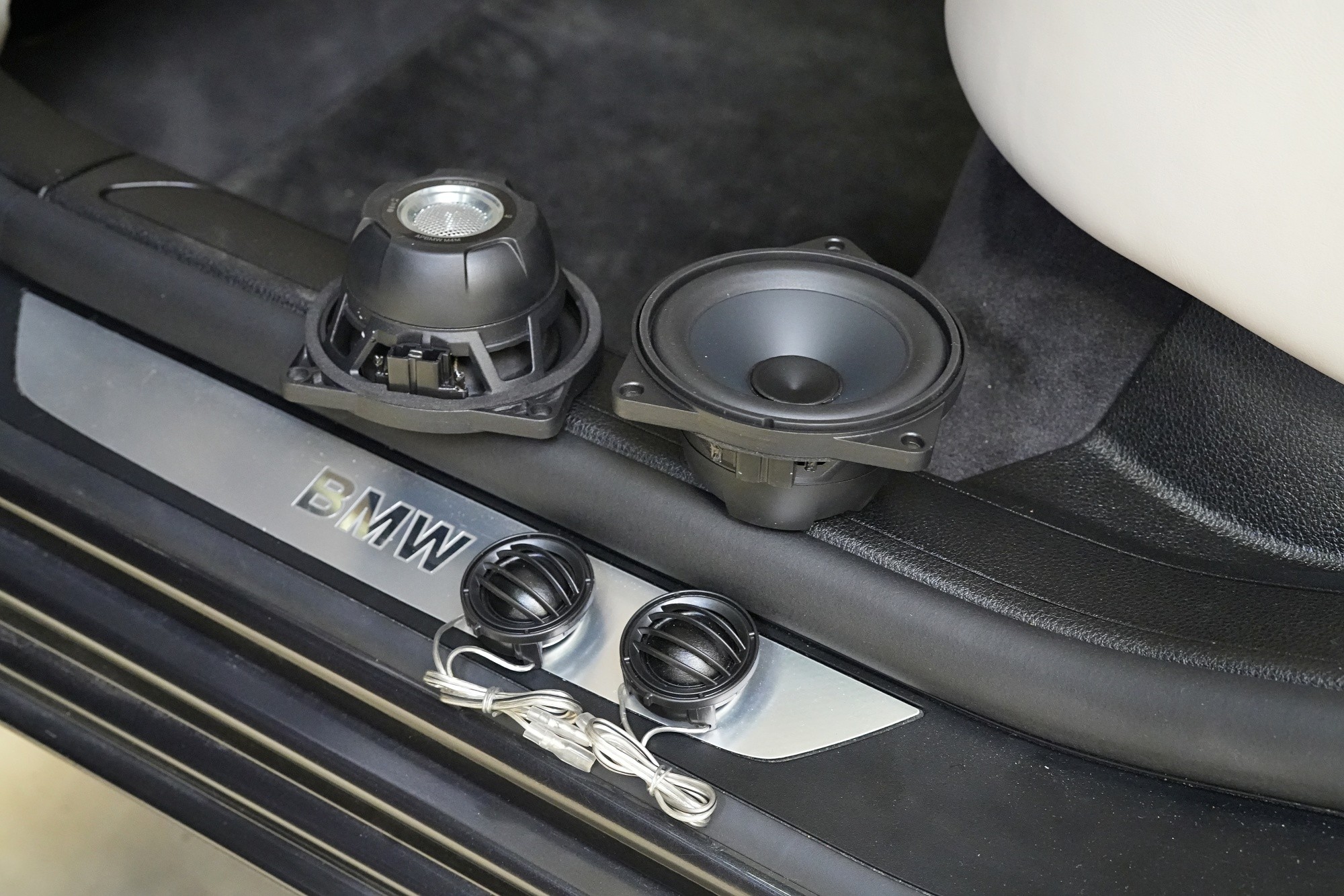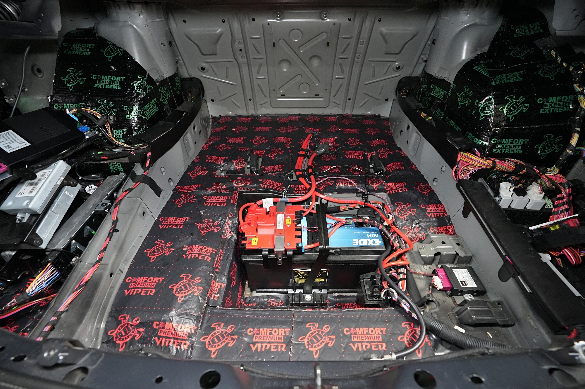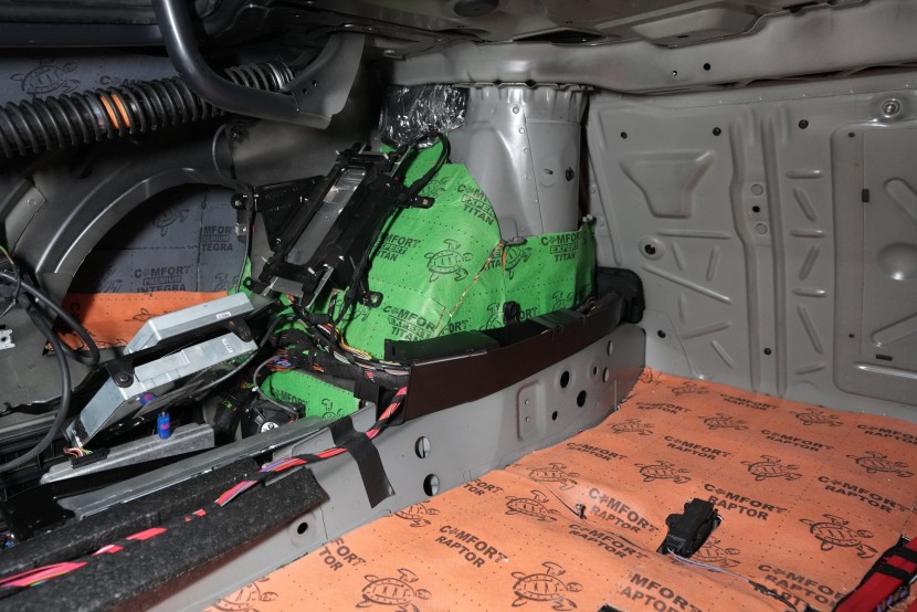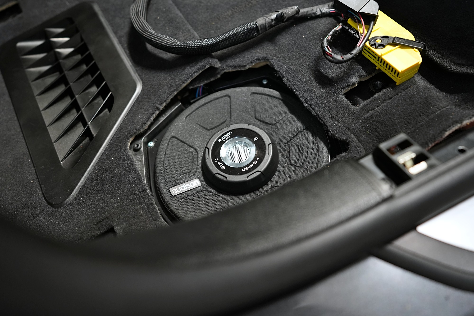 Шумоизолиране и озвучаване на автомобил BMW от 7-ма серия. Изискването на клиента беше ясно — максимално да шумоизолираме този флагман на BMW. Най-високата седмична серия е сред най-добре шумоизолираните автомобили, но както при всички превозни средства, това разбира се може да бъде направено още по-добре. При тази инсталация обърнахме по-голямо внимание и на шума от двигателя, от големите джанти Alpina и най-вече на скърцането в интериора. Поради това демонтирахме и напълно шумоизолирахме таблото и внимателно обработихме предните и задните калници както отвътре, така и отвън. Също така всички пластмасови детайли бяха обработени с подходящи демпфериращи материали и ленти за максимално предотвратяване на триене на пластмасите. След това продължихме по стандартния начин, но с използване на най-ефективните материали на водещия производител Comfortmat. Конкретно избрахме нашия пакет шумоизолация Premium Plus, който индивидуално адаптирахме за максимална ефективност. Насочихме се към всички ключови области на автомобила — предни, задни и петоалвите врати, пода, багажното отделение, предните и задните калници отвътре и отвън, капака и споменатото табло. Посветихме се и на озвучаването от италианския производител Audison, което е изключително не само със своето качествено звучене и висока мощност, но и с монтаж без никаква намеса в оригиналната електроинсталация. Това е възможно благодарение на разработена система с окабеляване, която осигурява пълна интеграция към фабричния главен блок, без да се налага рязане, запояване или полагане на ново окабеляване. Говорителите и субуферите Audison имат същите размери, форма, крепеж и конектори като фабричните говорители и цялото решение е в духа на Plug & Play. Всичко ново се управлява от осемканален цифров усилвател с DSP процесор Audison, който доставя мощност за всички говорители и субуфери. Последната фаза от инсталацията е измерване на звука с калибриран микрофон и прехвърляне на резултатите в софтуера на DSP процесора. Там настройваме подредбата на говорителите, времевите корекции според разположението на говорителите и детайлен еквалайзер. Резултатът е висококачествен звук, настроен специално за дадения автомобил, който по качество и мощ значително надминава дори допълнителните аудиопакети от по-висок клас от Harmann Kardon.