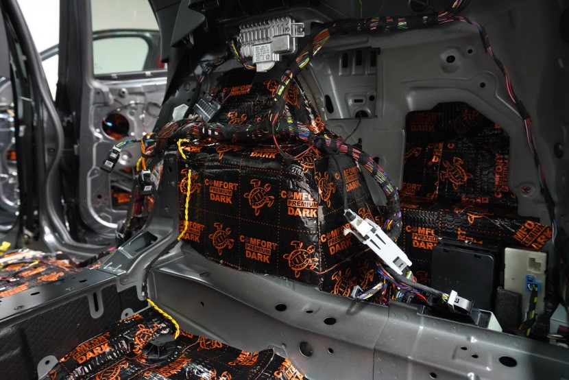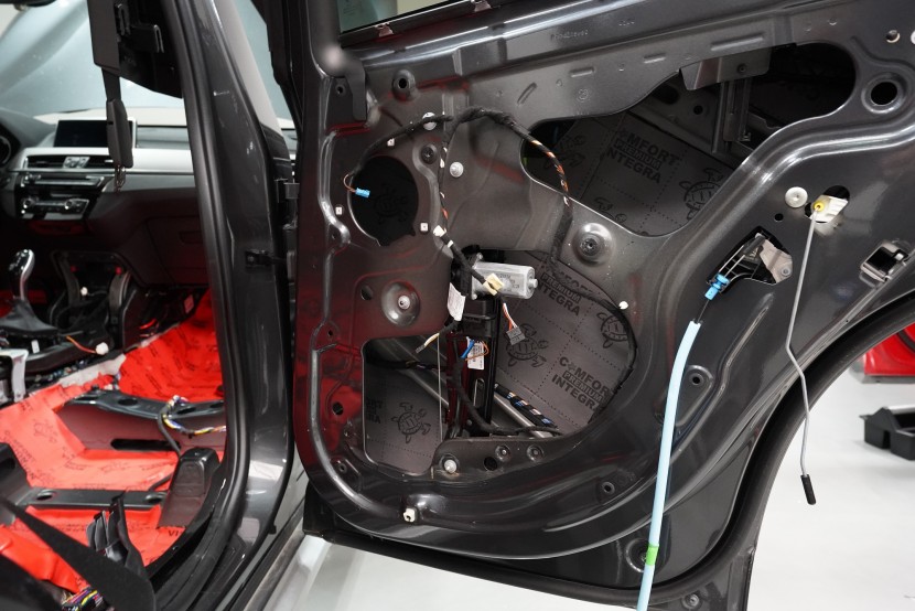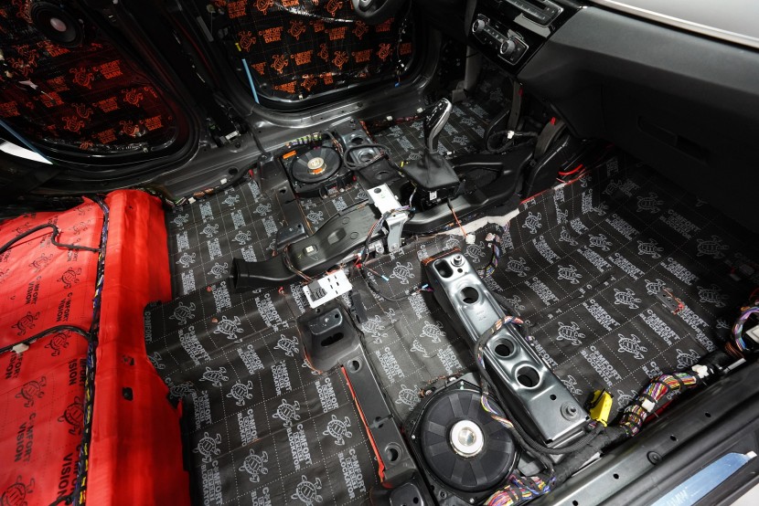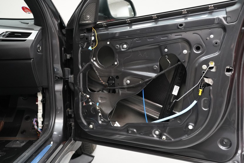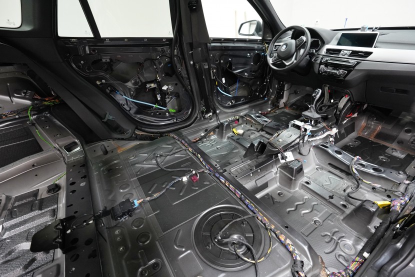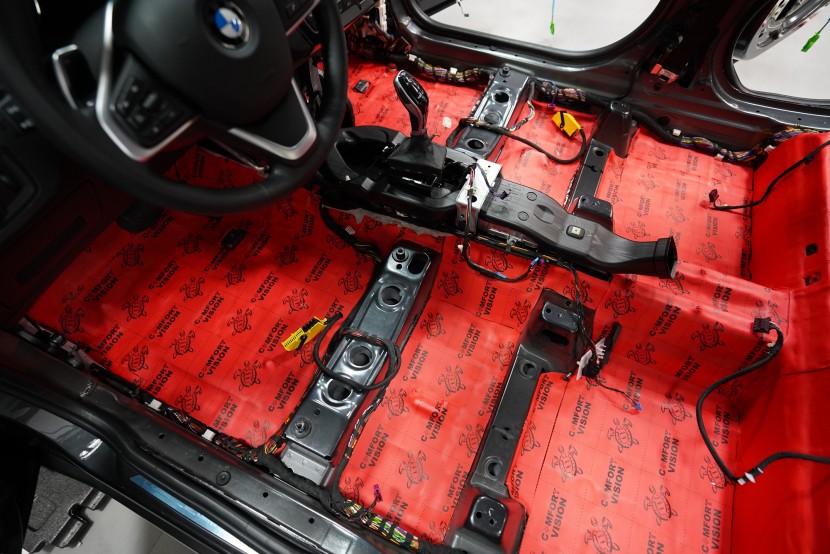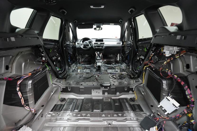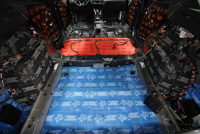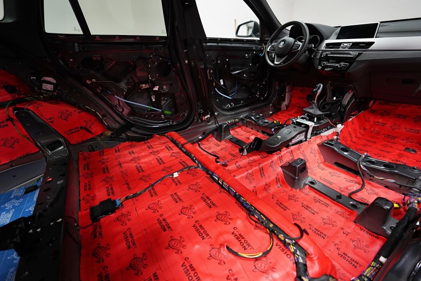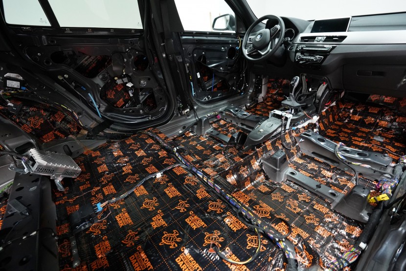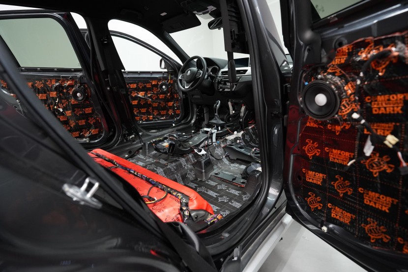 Шумоизолация на автомобил BMW X1 (F48). Независимо от това колко качествен е този автомобил, в купето за съжаление ще чуете неприятен шум поради недостатъчната звукова изолация. Повече акустично неудобство собственикът на този немски SUV забелязва при скорост над 70 km/h, като качеството на настилката не оказва голямо значение. За да бъде пътуването в този автомобил възможно най-приятно, собственикът се обърна към нас за отстраняване на проблема. И тъй като при автомобилите BMW най-проблемни зони са подът и предните и задните подкалници, решихме да приложим нашия пакет шумоизолация Premium Plus, който включва шумоизолация именно на тези зони с по-дебели и по-ефективни материали. Конкретно шумоизолираме предни, задни и пета врата, пода, багажното отделение, предния капак и предни и задни подкалници от вътрешната страна на автомобила. Този автомобил е много взискателен по отношение на разглобяването и сглобяването на интериора, необходимо е максимално внимание и разбира се дълга практика. Поради сложността на шумоизолацията при този тип автомобил времето, прекарано върху автомобила, е увеличено в сравнение със стандартните автомобили, въпреки това успяваме да извършим инсталацията в рамките на един работен ден.