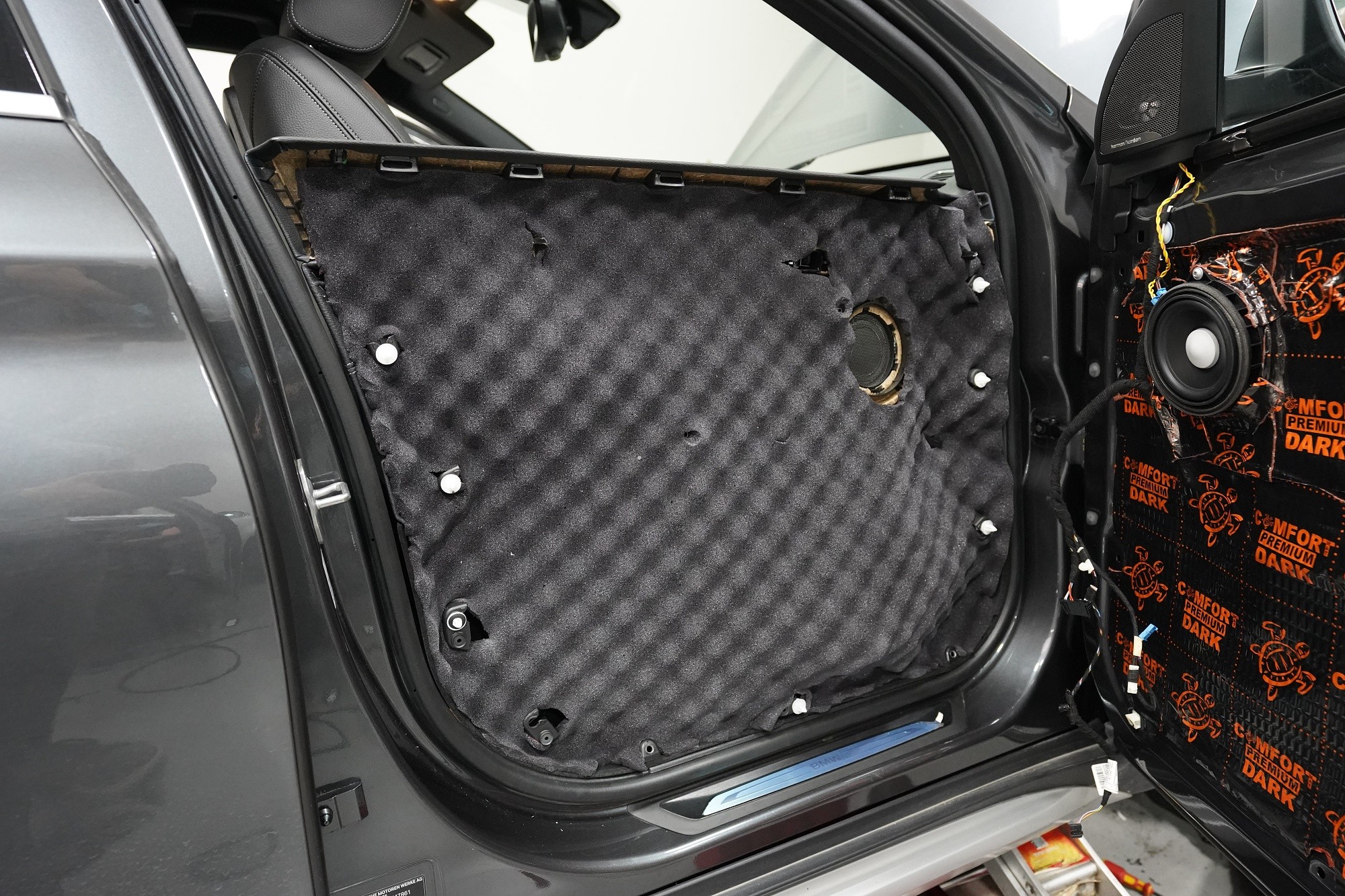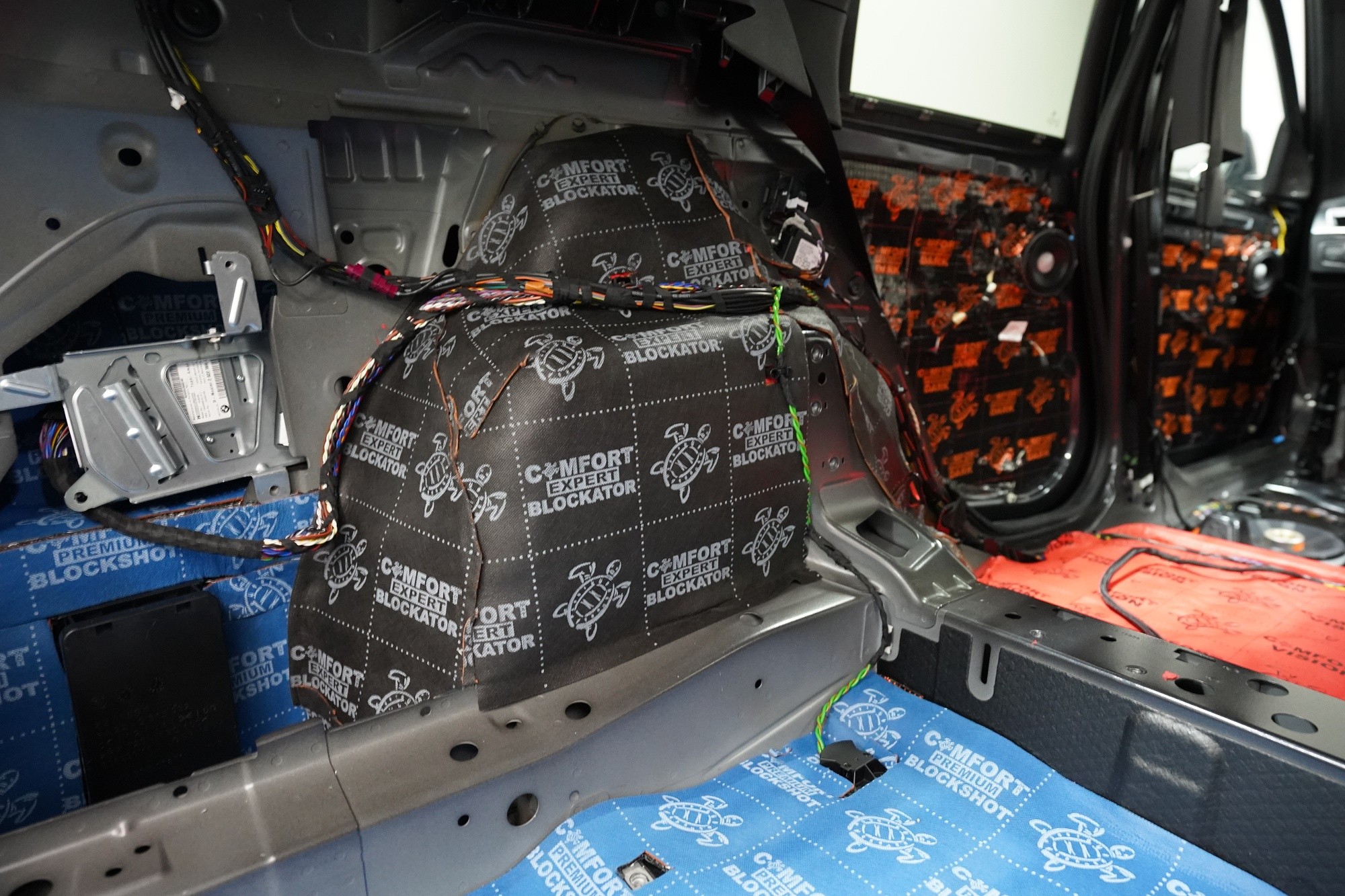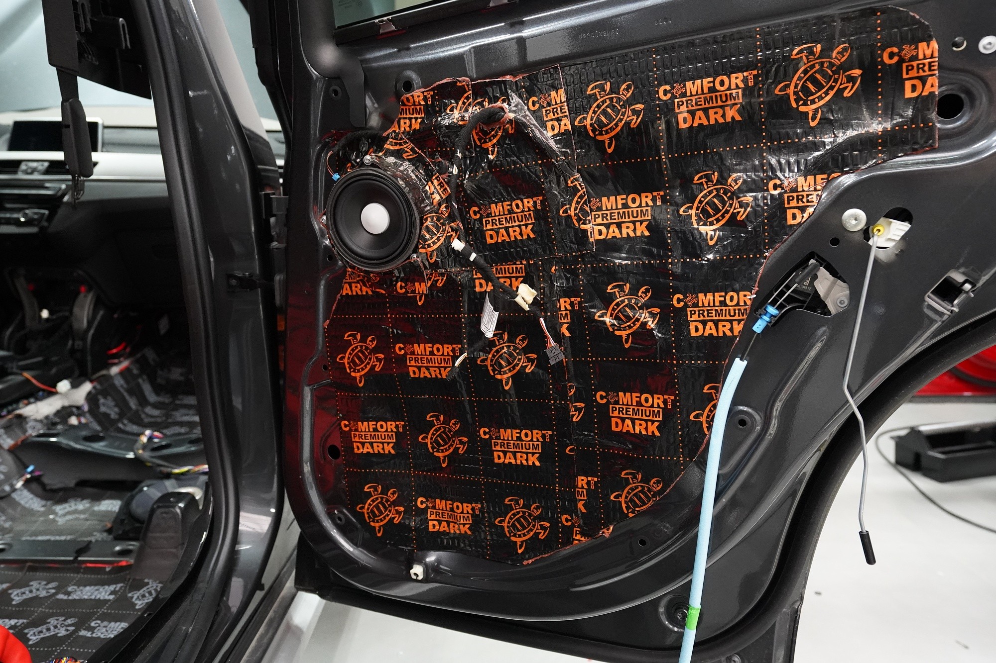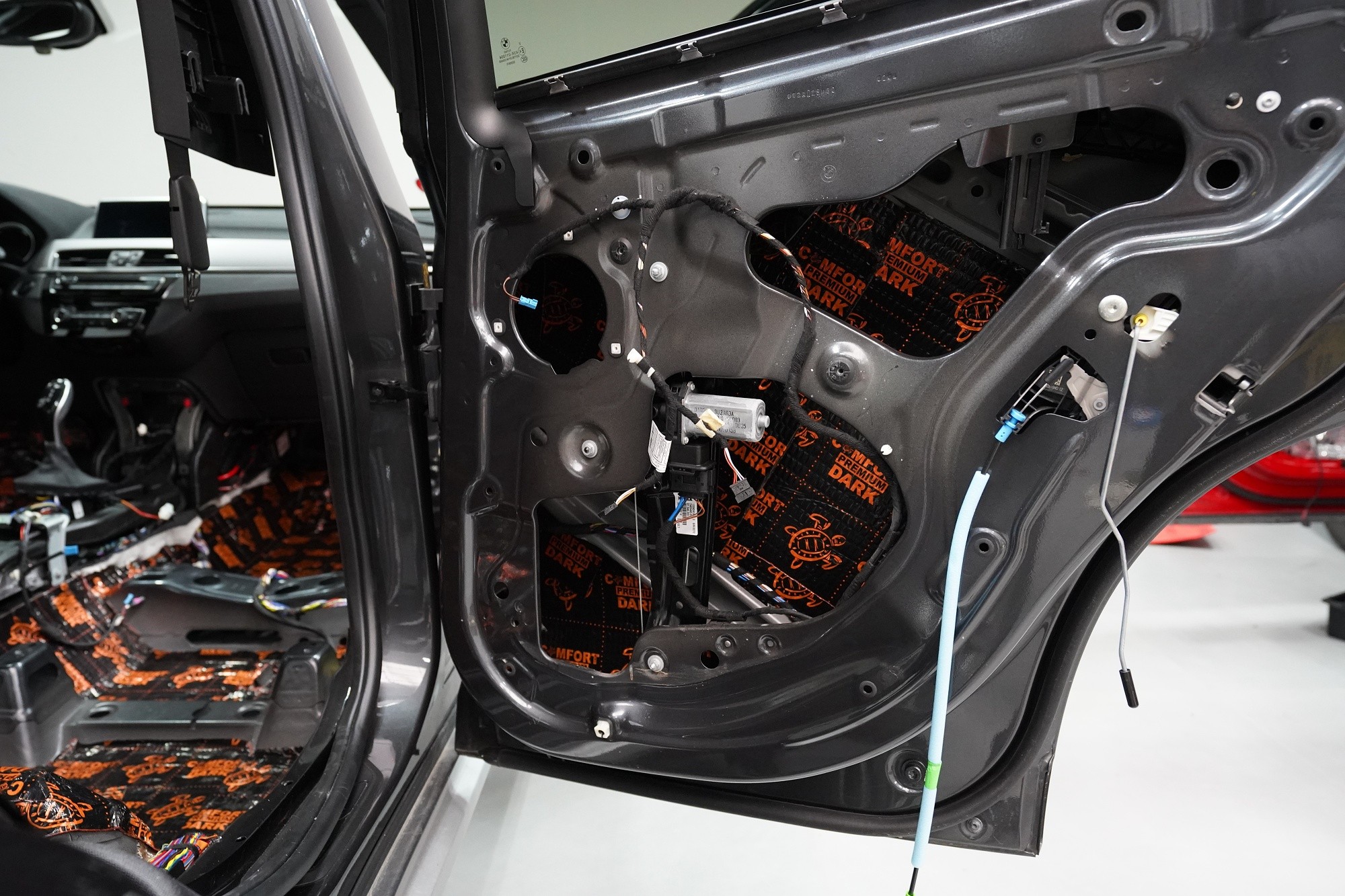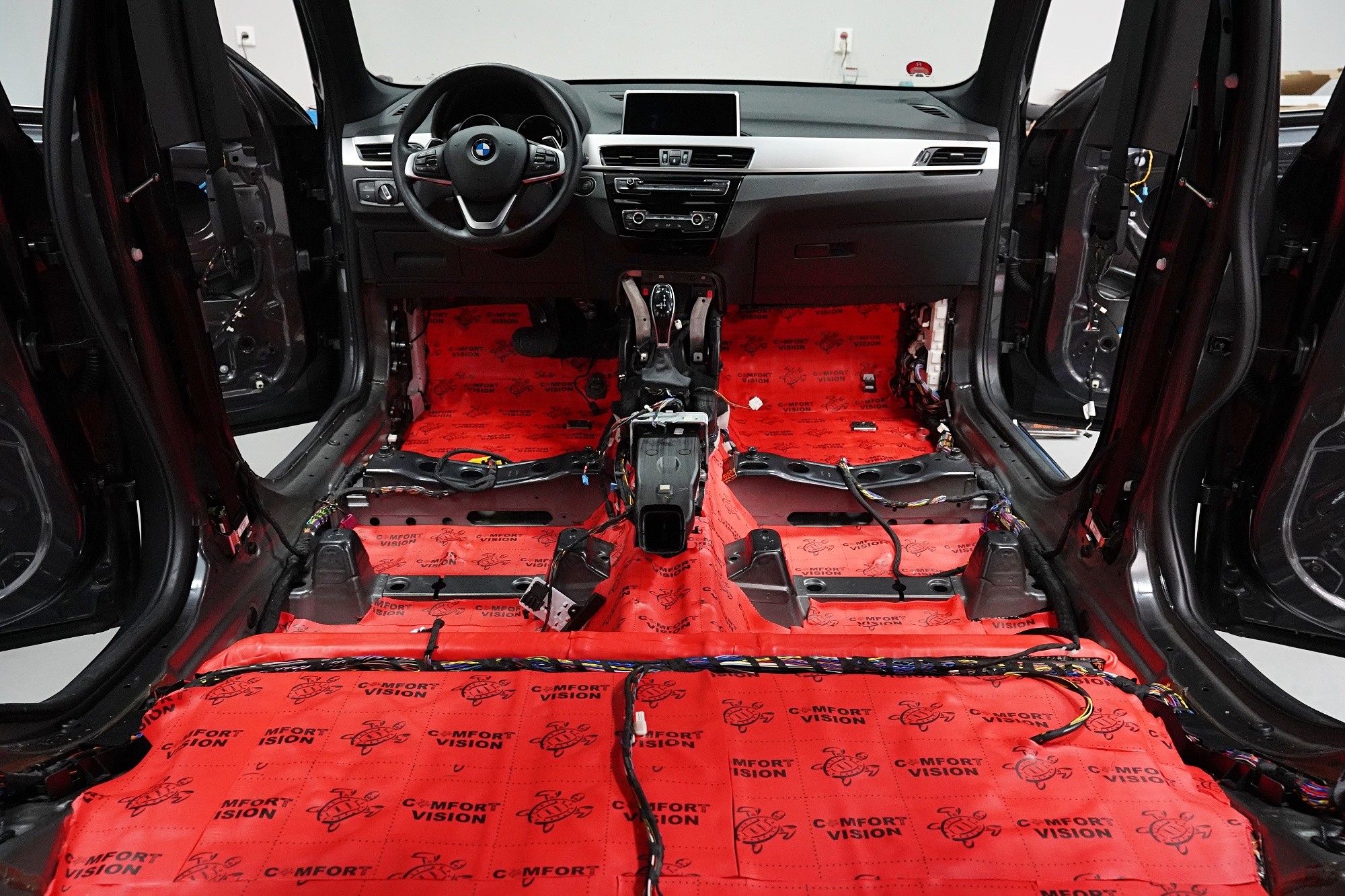 Шумоизолация на автомобил BMW X1 (F48). Независимо от това колко качествен е този автомобил, в купето за съжаление ще чуете неприятен шум поради недостатъчната звукова изолация. Повече акустично неудобство собственикът на този немски SUV забелязва при скорост над 70 km/h, като качеството на настилката не оказва голямо значение. За да бъде пътуването в този автомобил възможно най-приятно, собственикът се обърна към нас за отстраняване на проблема. И тъй като при автомобилите BMW най-проблемни зони са подът и предните и задните подкалници, решихме да приложим нашия пакет шумоизолация Premium Plus, който включва шумоизолация именно на тези зони с по-дебели и по-ефективни материали. Конкретно шумоизолираме предни, задни и пета врата, пода, багажното отделение, предния капак и предни и задни подкалници от вътрешната страна на автомобила. Този автомобил е много взискателен по отношение на разглобяването и сглобяването на интериора, необходимо е максимално внимание и разбира се дълга практика. Поради сложността на шумоизолацията при този тип автомобил времето, прекарано върху автомобила, е увеличено в сравнение със стандартните автомобили, въпреки това успяваме да извършим инсталацията в рамките на един работен ден.