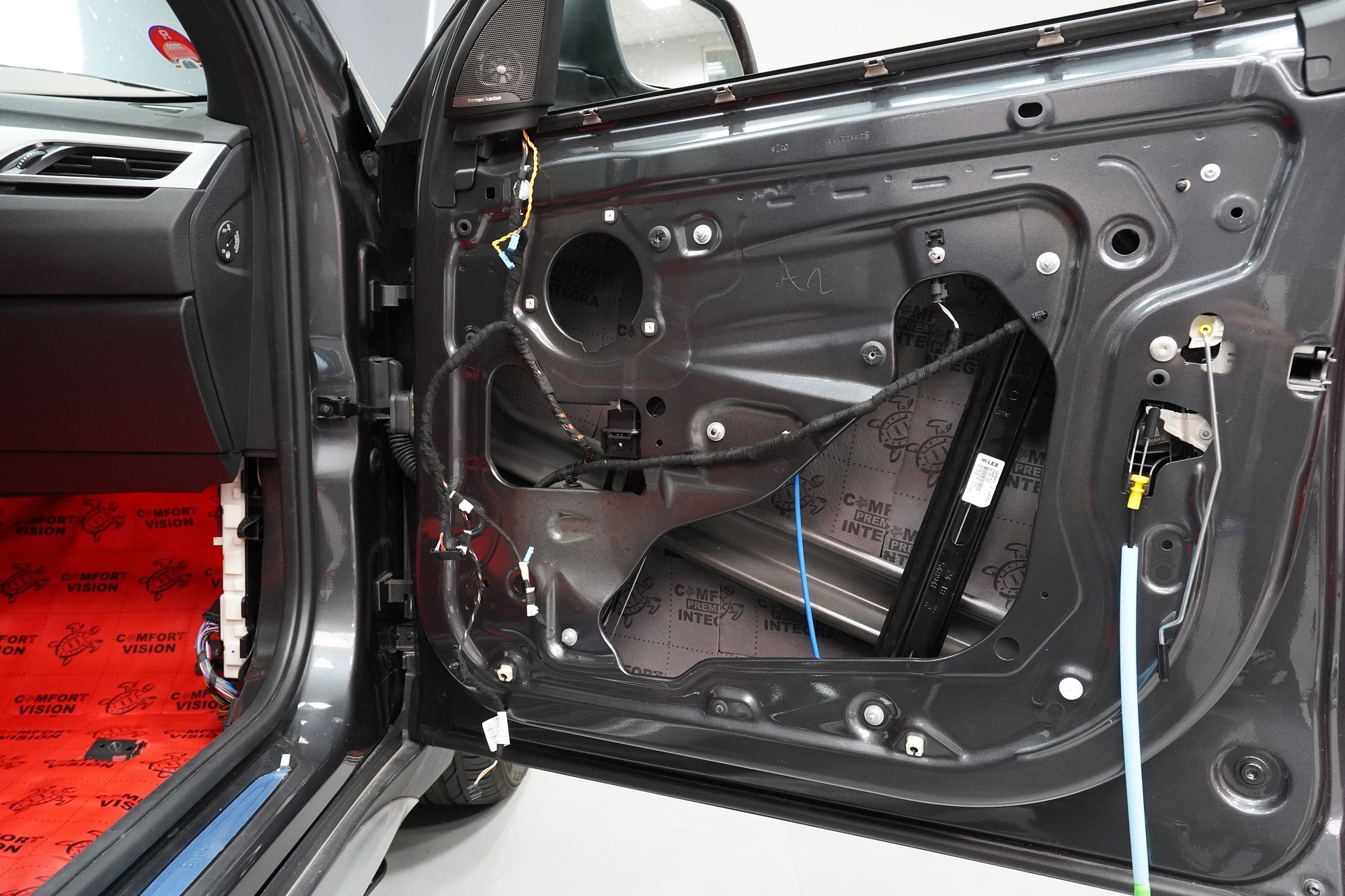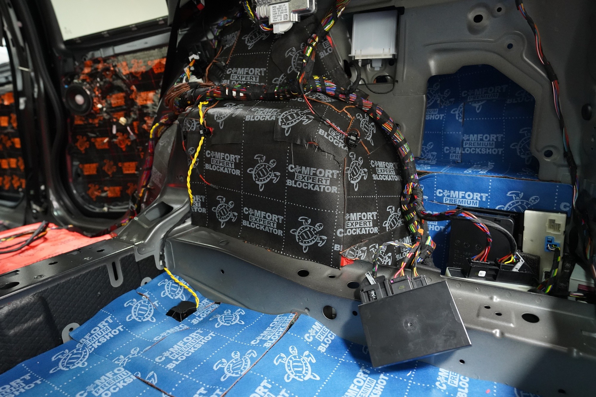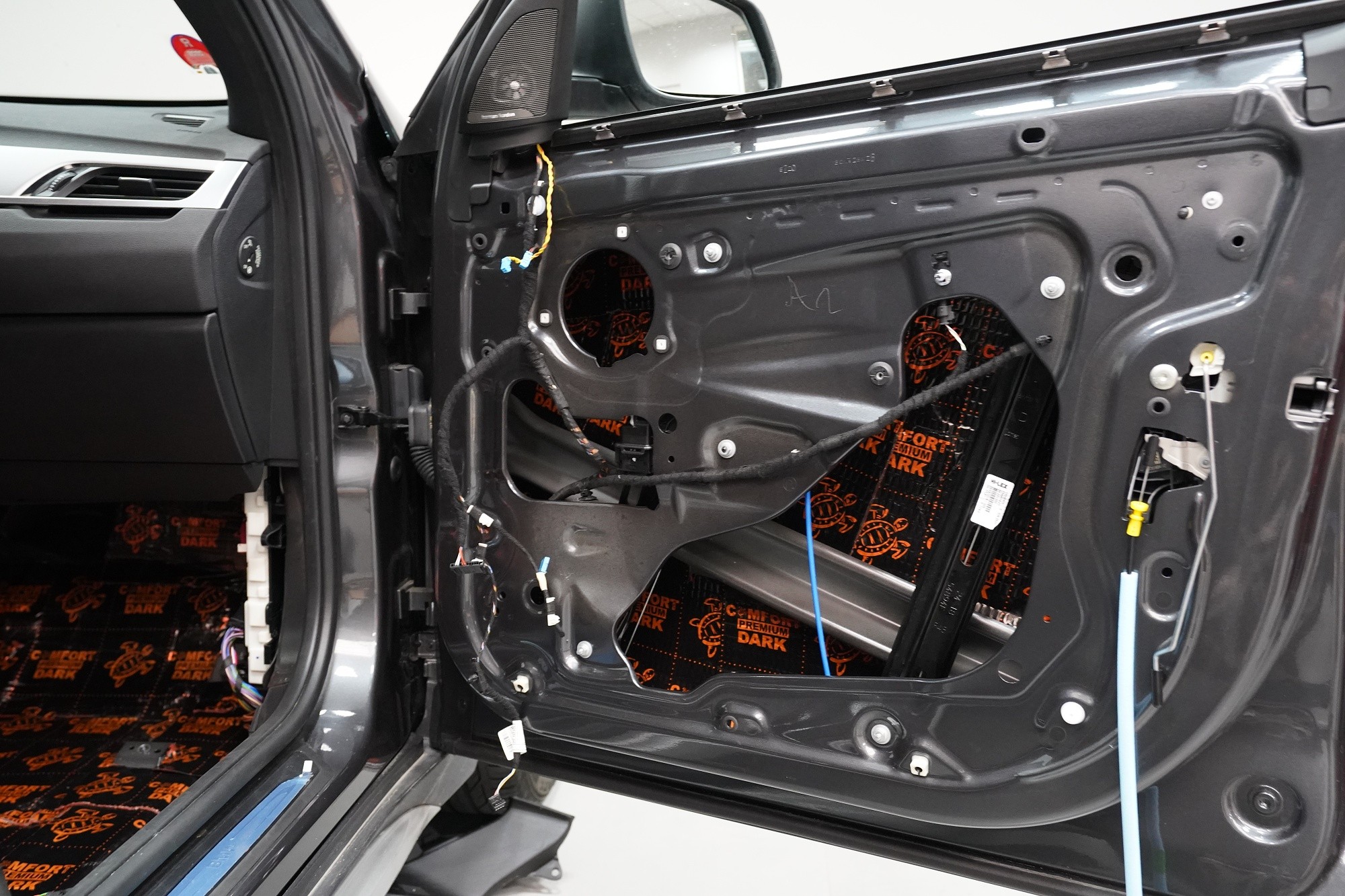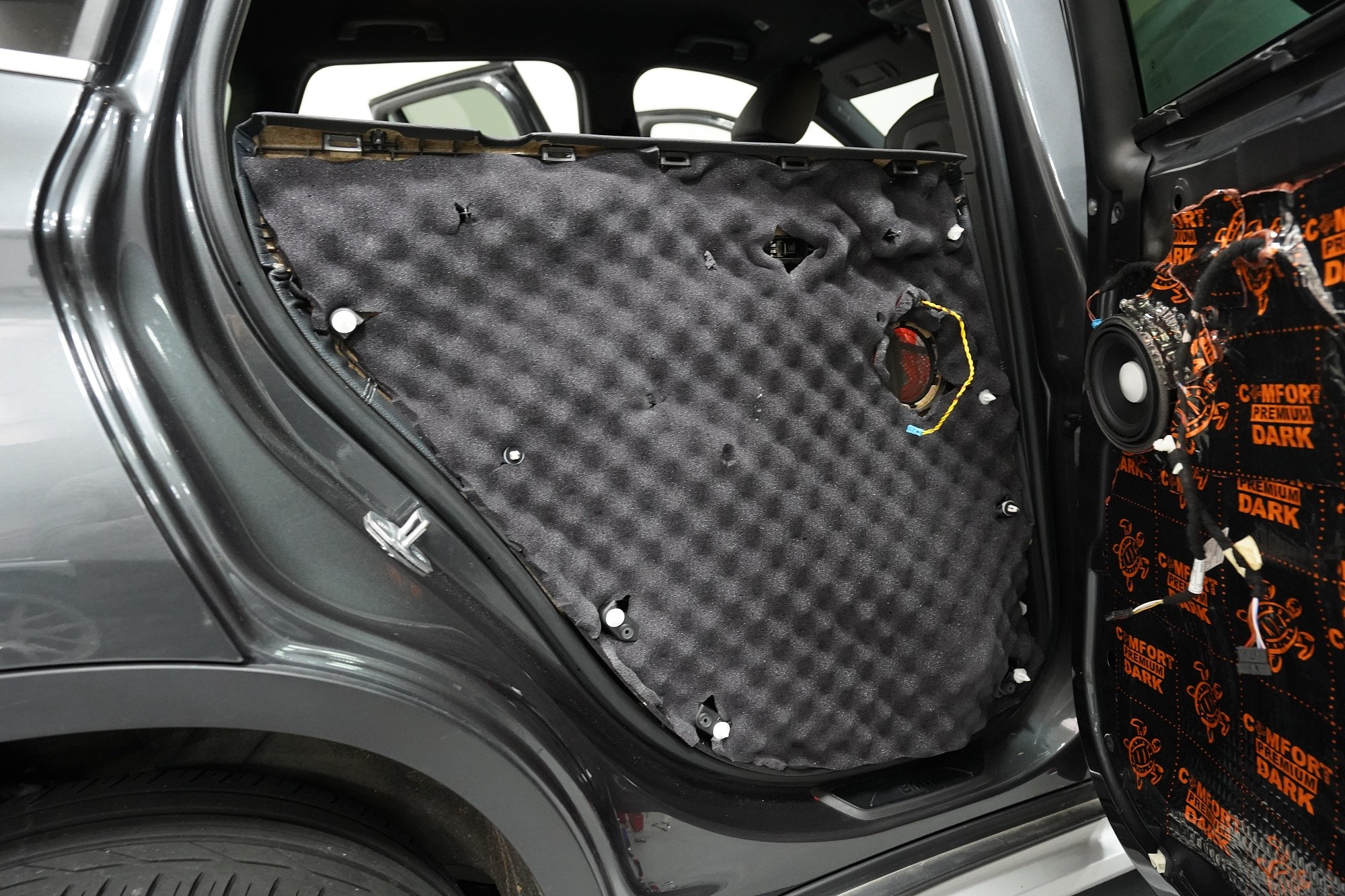 Шумоизолация на автомобил BMW X1 (F48). Независимо от това колко качествен е този автомобил, в купето за съжаление ще чуете неприятен шум поради недостатъчната звукова изолация. Повече акустично неудобство собственикът на този немски SUV забелязва при скорост над 70 km/h, като качеството на настилката не оказва голямо значение. За да бъде пътуването в този автомобил възможно най-приятно, собственикът се обърна към нас за отстраняване на проблема. И тъй като при автомобилите BMW най-проблемни зони са подът и предните и задните подкалници, решихме да приложим нашия пакет шумоизолация Premium Plus, който включва шумоизолация именно на тези зони с по-дебели и по-ефективни материали. Конкретно шумоизолираме предни, задни и пета врата, пода, багажното отделение, предния капак и предни и задни подкалници от вътрешната страна на автомобила. Този автомобил е много взискателен по отношение на разглобяването и сглобяването на интериора, необходимо е максимално внимание и разбира се дълга практика. Поради сложността на шумоизолацията при този тип автомобил времето, прекарано върху автомобила, е увеличено в сравнение със стандартните автомобили, въпреки това успяваме да извършим инсталацията в рамките на един работен ден.