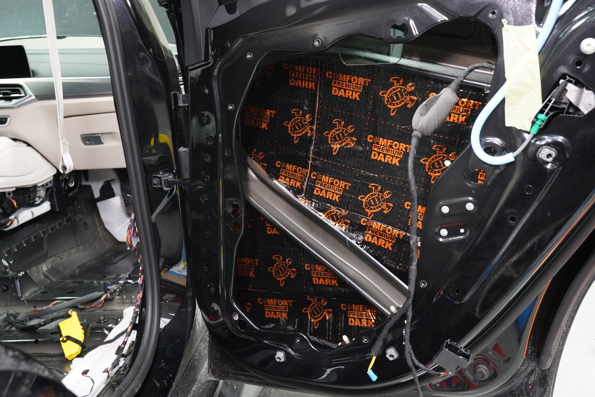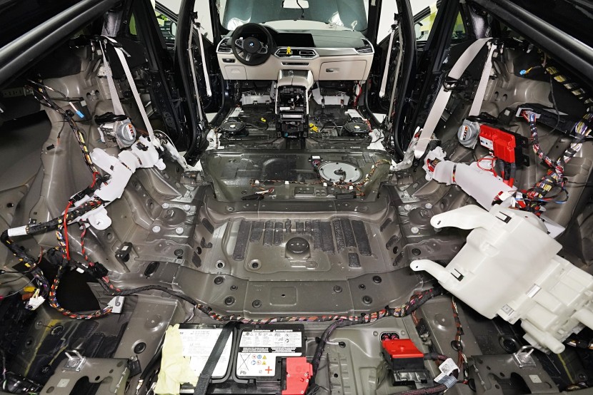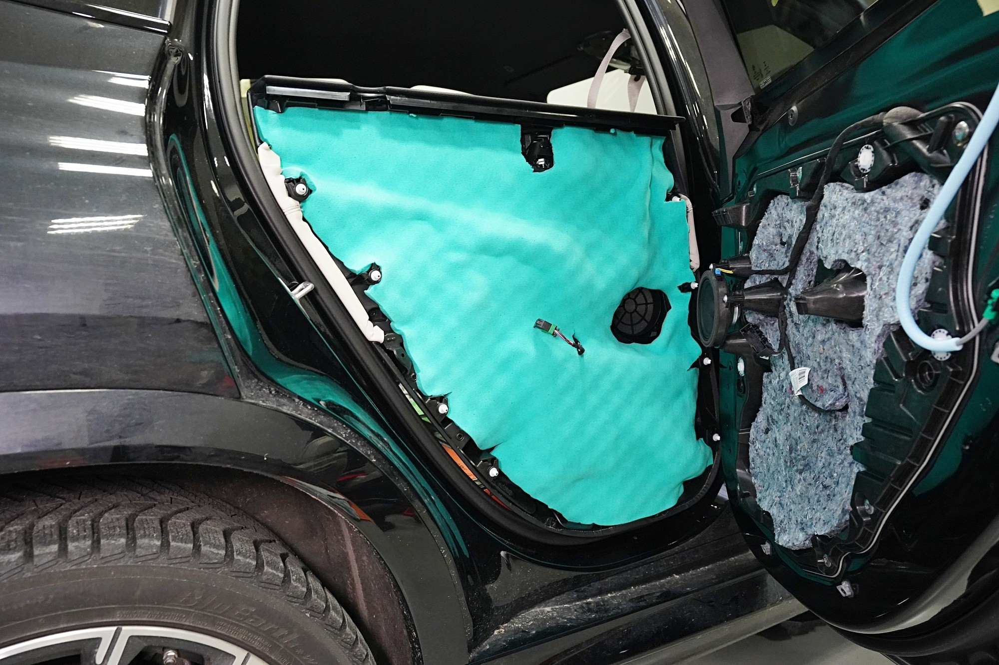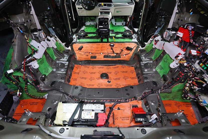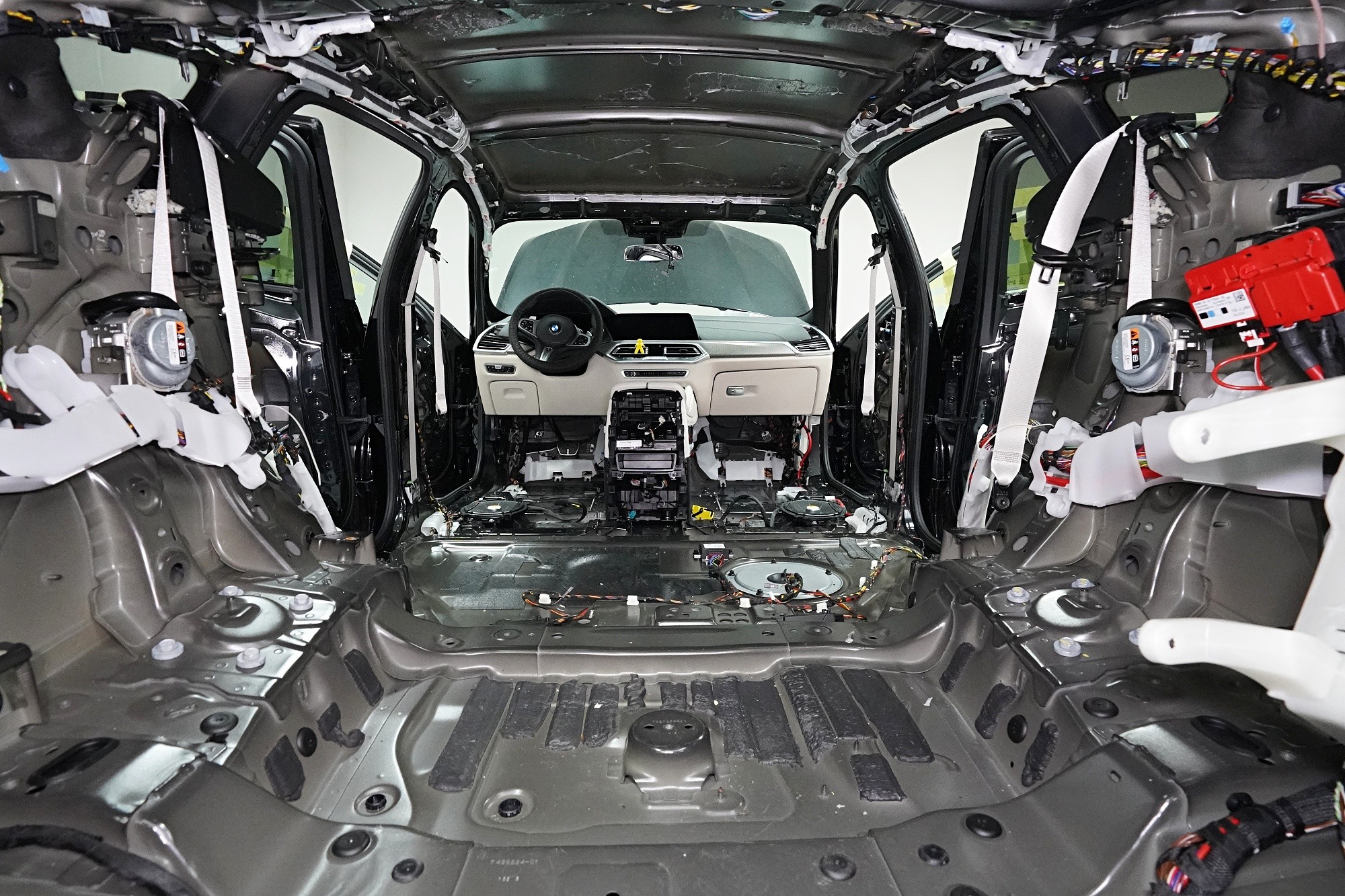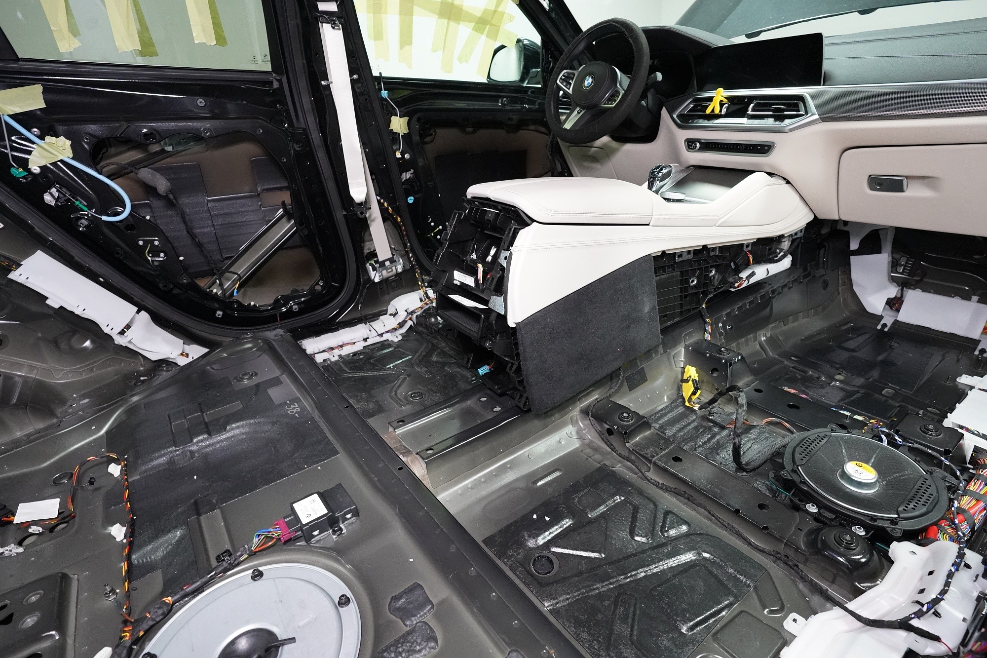 Шумоизолация на BMW X6 (G06) с максимална ефективност. Заводската изолация на този премиум SUV без съмнение е сред по-добрите. На повечето елементи от каросерията ще намерите защита против вибрации, а в облицовката на пода и багажника присъства и сравнително дебела шумоизолация от гумен материал. Въпреки това в сравнение с нашето решение това е базова звукоизолация, с която собственикът на този автомобил не беше напълно доволен. Както при всички големи SUV на BMW, и X6 страда най-много от шума от арките на колелата и пода, където при по-високи скорости най-силно се проявява бученето на големите гуми и нискочестотният шум от пътната настилка. На тези проблемни зони се насочихме подробно в рамките на нашата най-ефективна програма за шумоизолация Expert Plus. Шумоизолирахме всички ключови области на автомобила, а именно предните, задните и петите врати, пода, багажното пространство включително задните арки, предните арки, покрива и капака. За пода и задните арки, които са най-силно натоварени от шум, в сравнение със стандартната процедура приложихме още по-ефективни материали. По монтажa работеха едновременно четирима наши опитни техници, които извършват шумоизолацията в рамките на 1 работен ден. Повече интересна информация за монтажа ще намерите в нашия фоторепортаж.