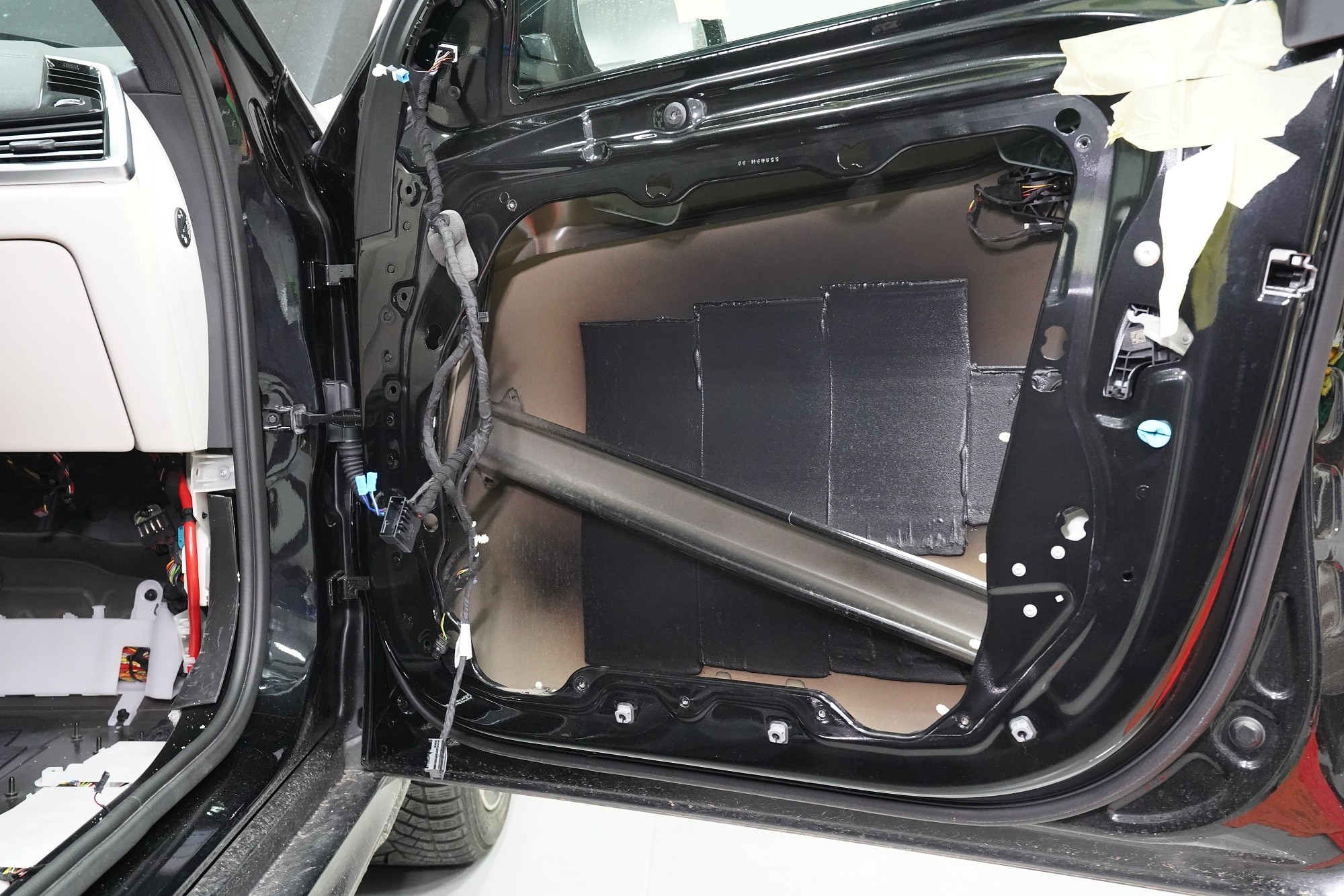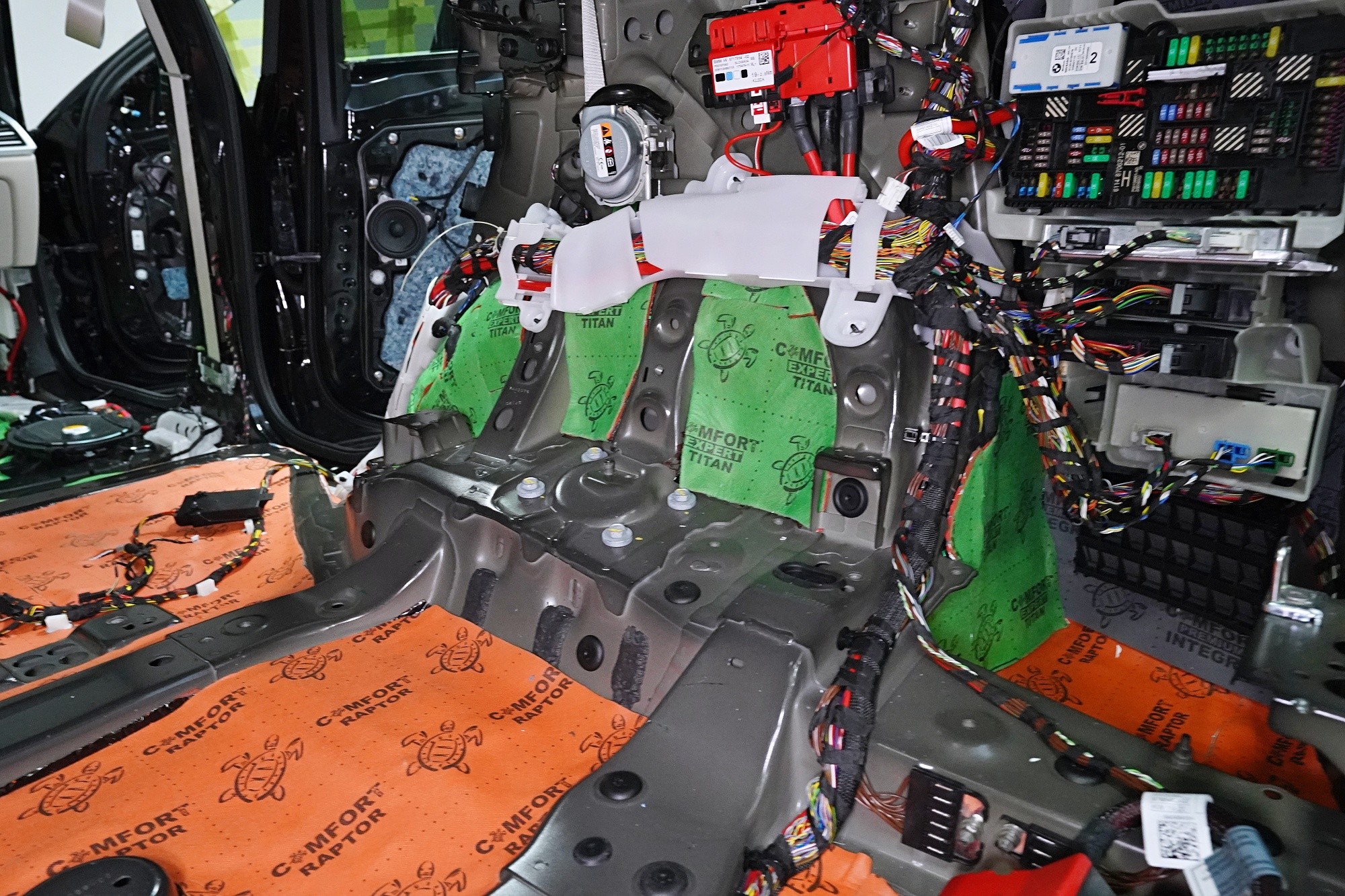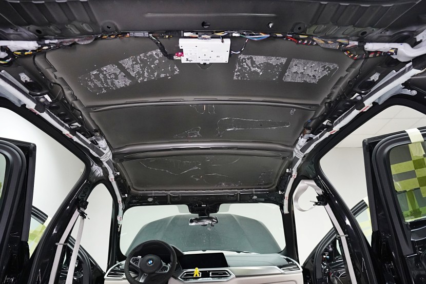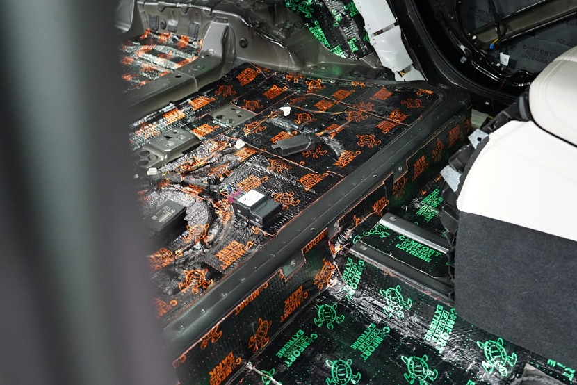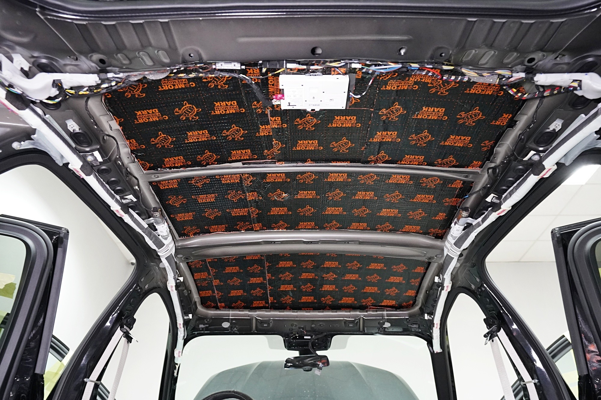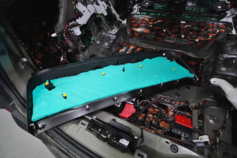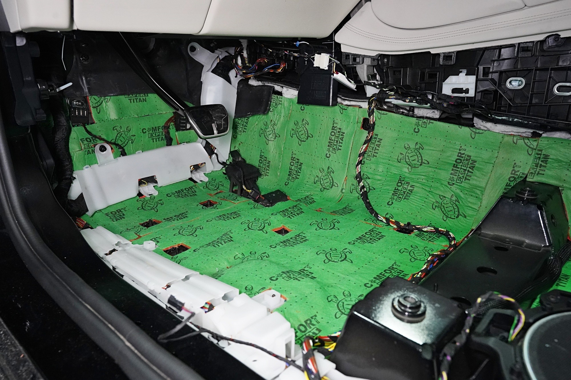 Шумоизолация на BMW X6 (G06) с максимална ефективност. Заводската изолация на този премиум SUV без съмнение е сред по-добрите. На повечето елементи от каросерията ще намерите защита против вибрации, а в облицовката на пода и багажника присъства и сравнително дебела шумоизолация от гумен материал. Въпреки това в сравнение с нашето решение това е базова звукоизолация, с която собственикът на този автомобил не беше напълно доволен. Както при всички големи SUV на BMW, и X6 страда най-много от шума от арките на колелата и пода, където при по-високи скорости най-силно се проявява бученето на големите гуми и нискочестотният шум от пътната настилка. На тези проблемни зони се насочихме подробно в рамките на нашата най-ефективна програма за шумоизолация Expert Plus. Шумоизолирахме всички ключови области на автомобила, а именно предните, задните и петите врати, пода, багажното пространство включително задните арки, предните арки, покрива и капака. За пода и задните арки, които са най-силно натоварени от шум, в сравнение със стандартната процедура приложихме още по-ефективни материали. По монтажa работеха едновременно четирима наши опитни техници, които извършват шумоизолацията в рамките на 1 работен ден. Повече интересна информация за монтажа ще намерите в нашия фоторепортаж.