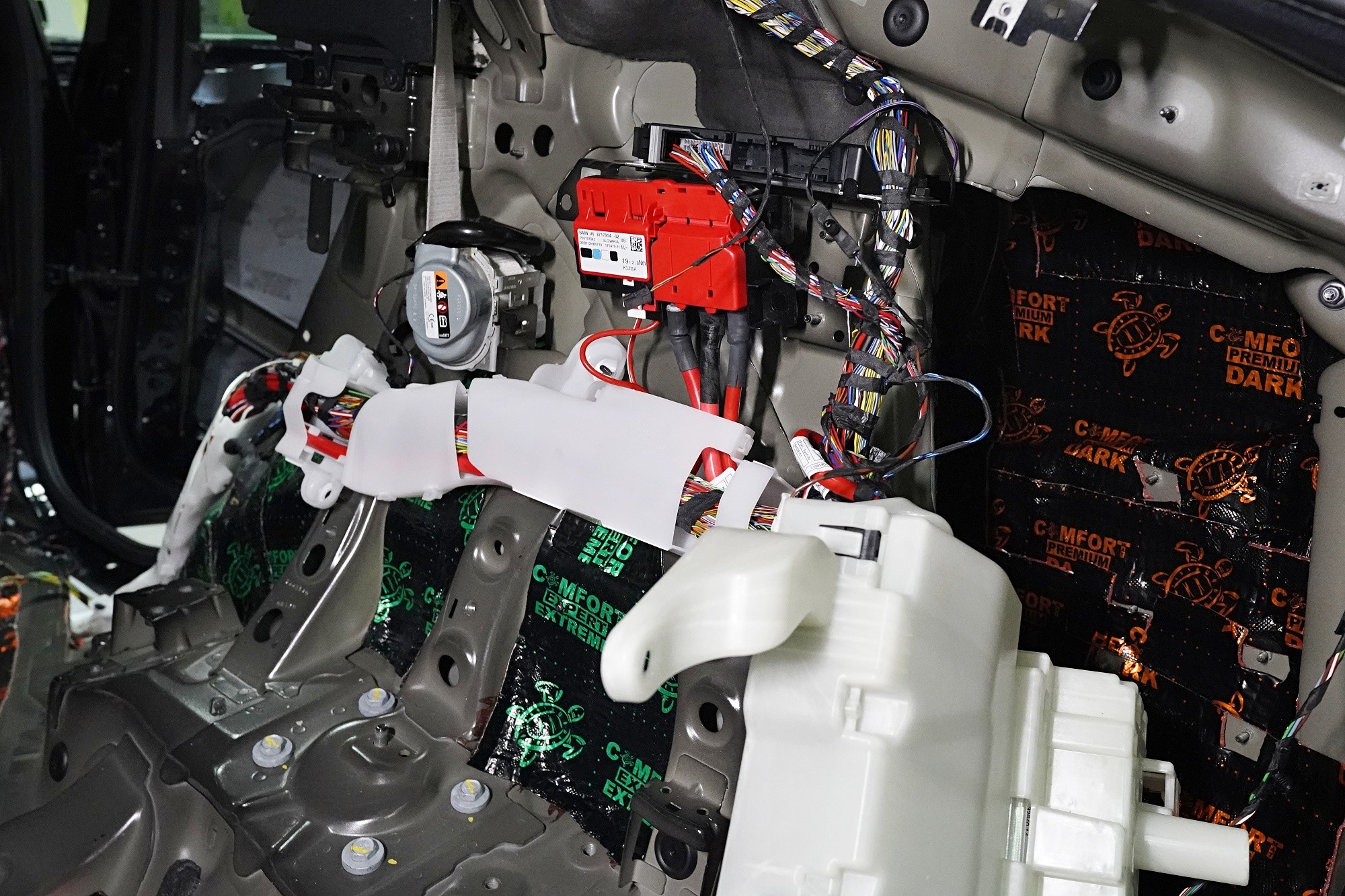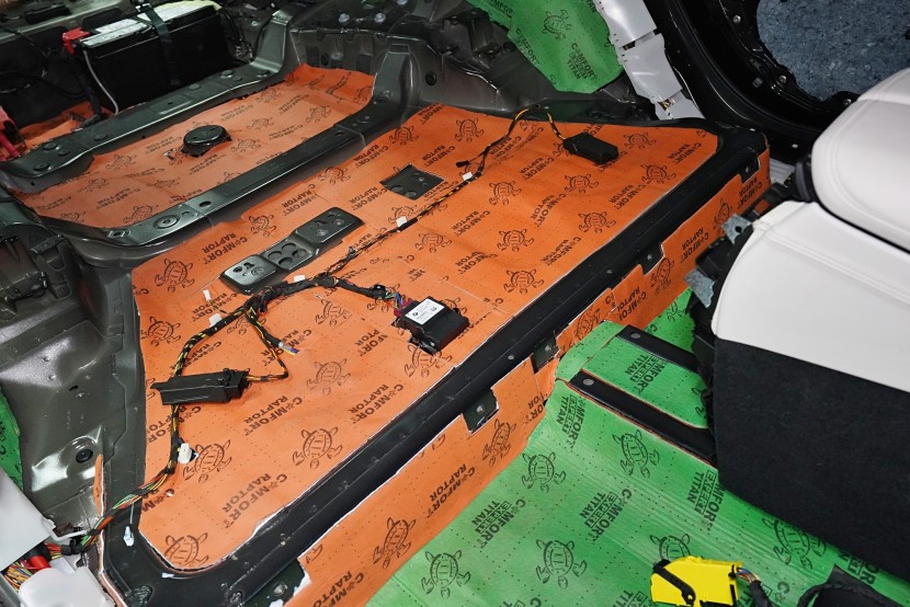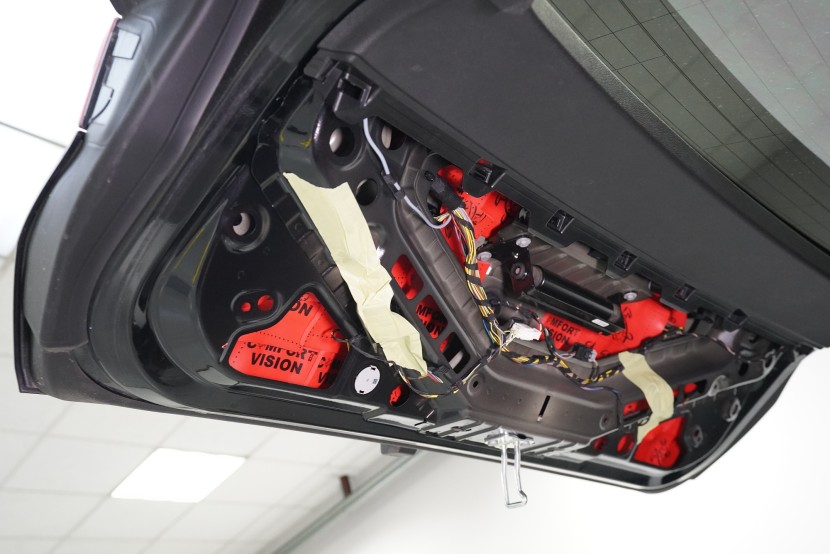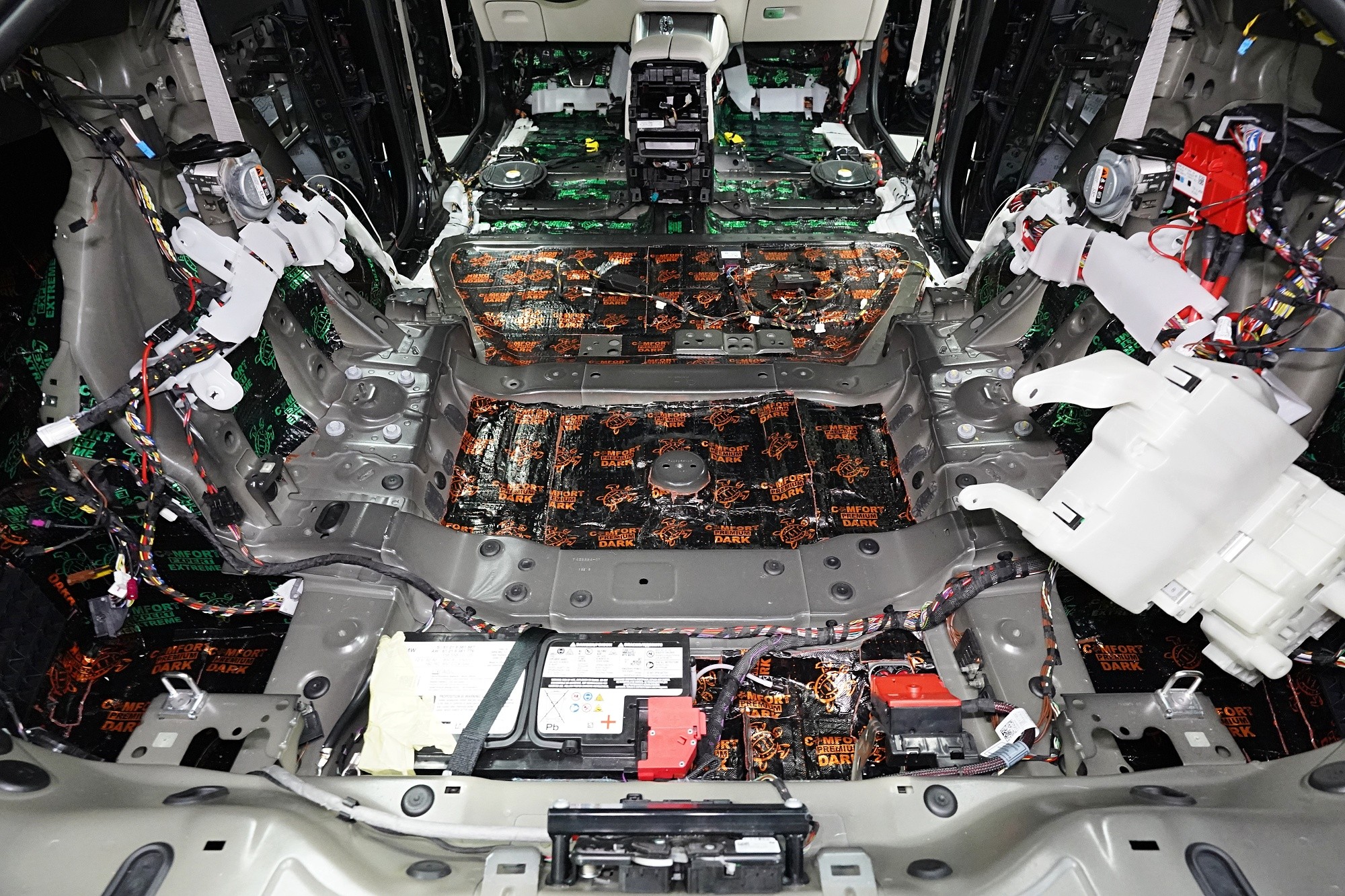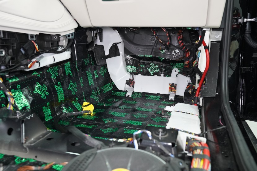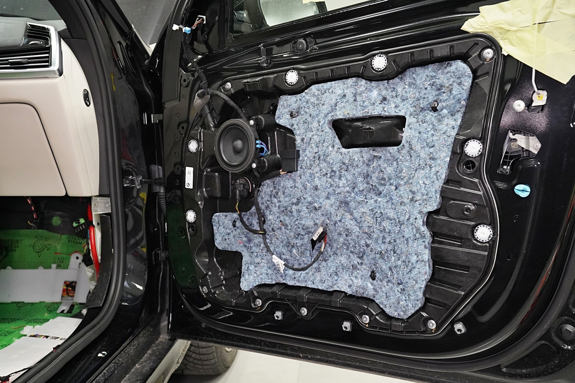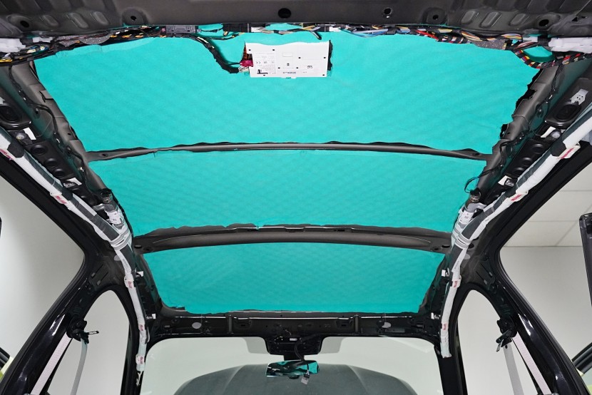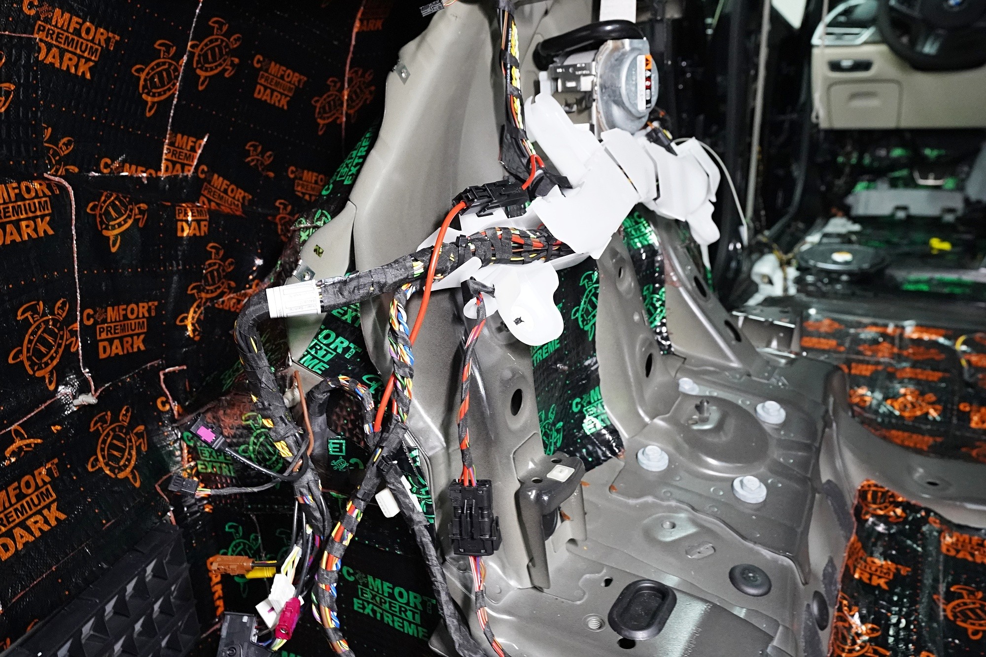 Шумоизолация на BMW X6 (G06) с максимална ефективност. Заводската изолация на този премиум SUV без съмнение е сред по-добрите. На повечето елементи от каросерията ще намерите защита против вибрации, а в облицовката на пода и багажника присъства и сравнително дебела шумоизолация от гумен материал. Въпреки това в сравнение с нашето решение това е базова звукоизолация, с която собственикът на този автомобил не беше напълно доволен. Както при всички големи SUV на BMW, и X6 страда най-много от шума от арките на колелата и пода, където при по-високи скорости най-силно се проявява бученето на големите гуми и нискочестотният шум от пътната настилка. На тези проблемни зони се насочихме подробно в рамките на нашата най-ефективна програма за шумоизолация Expert Plus. Шумоизолирахме всички ключови области на автомобила, а именно предните, задните и петите врати, пода, багажното пространство включително задните арки, предните арки, покрива и капака. За пода и задните арки, които са най-силно натоварени от шум, в сравнение със стандартната процедура приложихме още по-ефективни материали. По монтажa работеха едновременно четирима наши опитни техници, които извършват шумоизолацията в рамките на 1 работен ден. Повече интересна информация за монтажа ще намерите в нашия фоторепортаж.