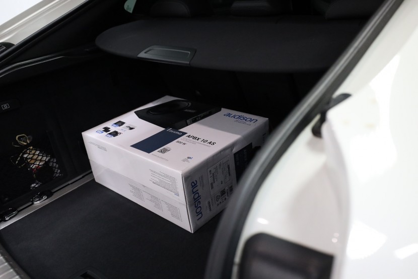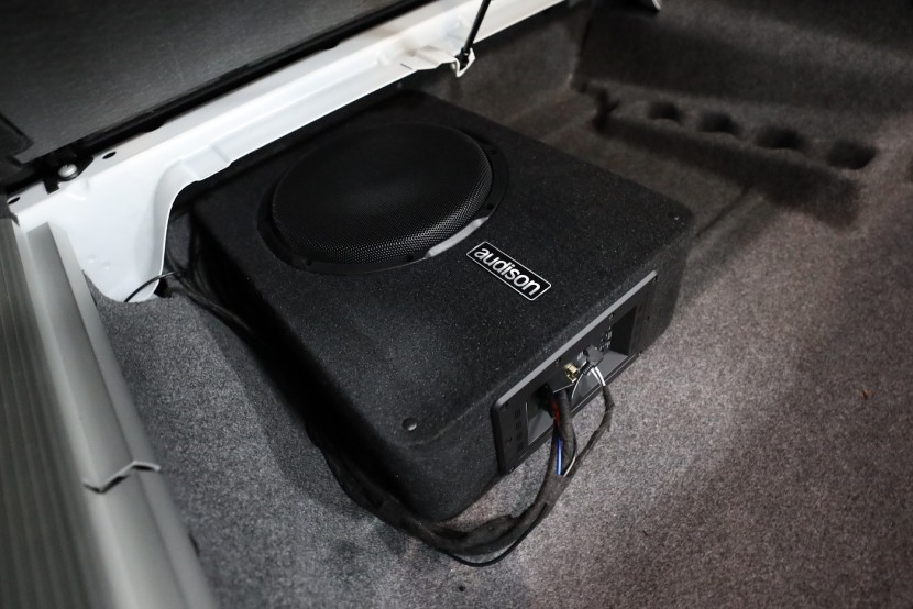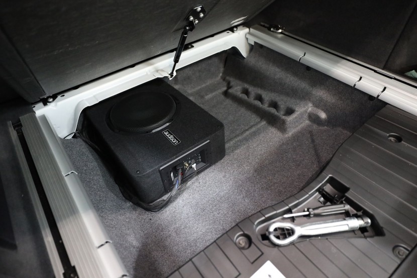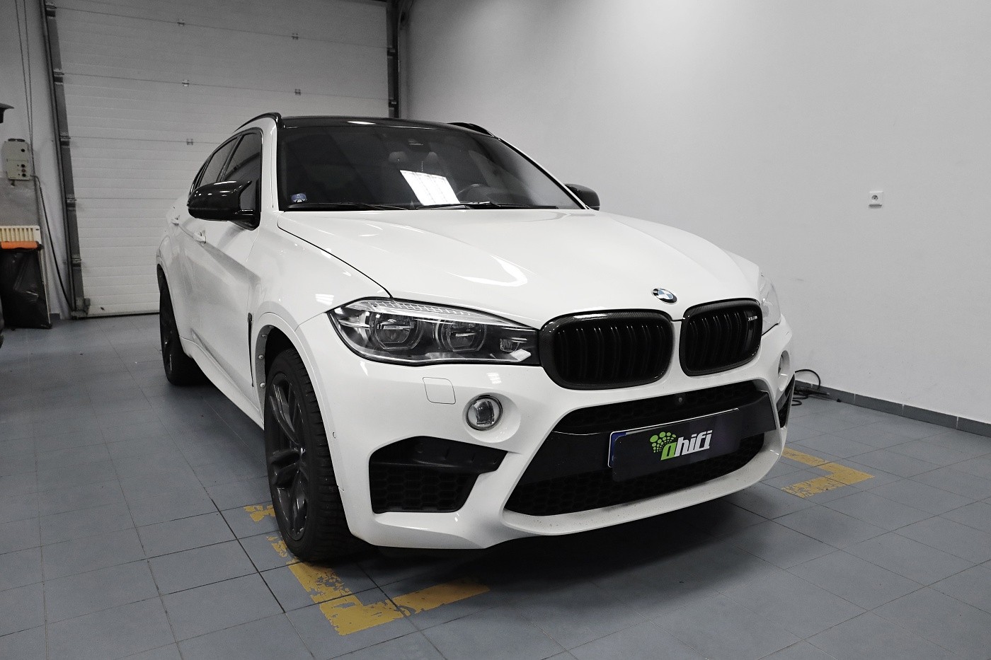 Инсталация на субуфер в BMW X6 M. Нашият клиент не беше доволен от басовата част на фабричното озвучаване Bang & Olufsen. Смяната на фабричния усилвател и субуферите под седалките би била технически и финансово натоварваща поради оптичната инсталация, затова избрахме ненатрапчиво решение под формата на активен субуфер Audison, който разполага с говорител с диаметър 200 mm и достатъчно мощност 400 W RMS. Субуферът поставихме в двойното дъно на багажното отделение, като по този начин не намалихме обема на багажника.