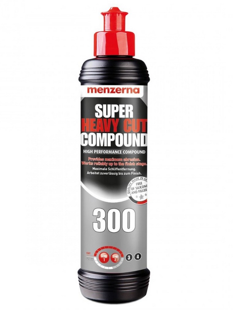 Menzerna Super Heavy Cut Compound S300 осигурява 100% успеваемост при полирането на големи дефекти в лака. Ефективно и бързо премахва дори много дълбоки повреди на лака. Премахва абразивна градация P1200. Не съдържа силикон. Минимизира прашността при машинно полиране. Подходяща за употреба с пянообразни или вълнени дискове.Основни характеристики