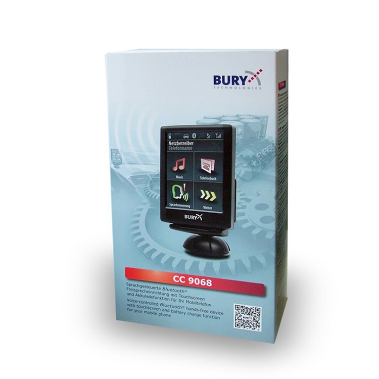 Bluetooth handsfree комплект BURY CC9068 с 2,8" TFT дисплей и гласово управление, предназначен за безопасни и удобни разговори по време на шофиране. Устройството е предназначено за инсталация във возилото от квалифициран сервиз, свързва се със съществуващите високоговорители на аудио системата на автомобила. К устройството могат да се свържат и използват два телефона едновременно (Multipoint), съвместимо е с различни производители на телефони.