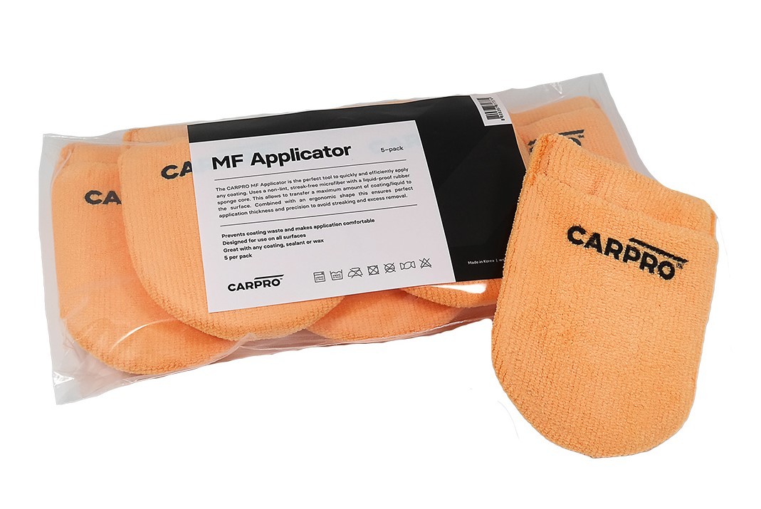 За керамичната защита на лака CarPro CQuartz Lite беше необходимо да се създаде подходящ апликатор, който да позволява бързото и лесно нанасяне и същевременно да предотвратява излишно разхищение на продукта. Така се появи този оранжев микрофибърен апликатор. Той е толкова добре направен, че намира приложение и при нанасяне на много други продукти за грижа за интериора и екстериора на автомобила. Този апликатор има форма на ръкавичка, която се обува върху пръстите, държи много удобно на ръката и няма опасност да се плъзне. Апликаторът има големи размери 14,5 x 11 cm, което прави работата с него не само удобна и лесна, но и бърза. Желана характеристика на микрофибърния апликатор CarPro е ниската му попивателност поради използвания материал и минималната дебелина. Благодарение на това няма излишно разхищение на нанасяните продукти и пестите пари. Поради изброените свойства този апликатор позволява много прецизна и чиста работа, което ще оцените не само при нанасяне на керамичното покритие CQuartz Lite, но и при използване на течни и твърди восъци и продукти за обработка на кожа или пластмаси. Много мекият микрофибърен материал е щадящ към повърхностите и гарантира нанасяне на тънък и равномерен слой.