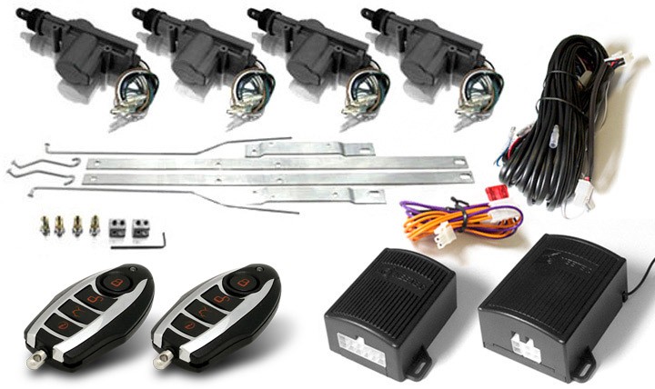 2ks řídící jednotky, 4 ks pětivodičové servo, výstup na směrová světla, sada táhel, spojovací materiál, kabeláž pro 4-dveře vozidla s vyvedením zadních kontaktů