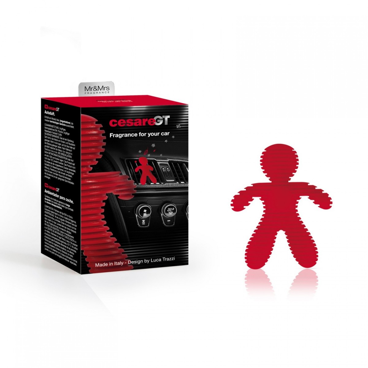 Фигурката Cesare GT от колекцията популярни фигурки Fresh Air Friends от Mr&Mrs Fragrance е идеалният партньор за ароматизиране на интериора на вашия автомобил или на всеки по-малък простор. Cesare GT е вашият нов спътник на пътя, който ще превърне шофирането ви в уникално сетивно преживяване, неговата ивицирана текстура напомня за захват и контрол. Създаден е специално за по-взискателни и спортни шофьори, наличен е в 5 цвята с нови аромати, вдъхновени от различни стилове на каране. Отстранете защитния целофанов плик и поставете фигурката във вентилацията на автомобила. Удобство и стил, допълнени с бергамот, ябълка, карамфил, ветивер и сандалово дърво.Фигурка за вентилация Mr&Mrs Fragrance от серията CESARE GT