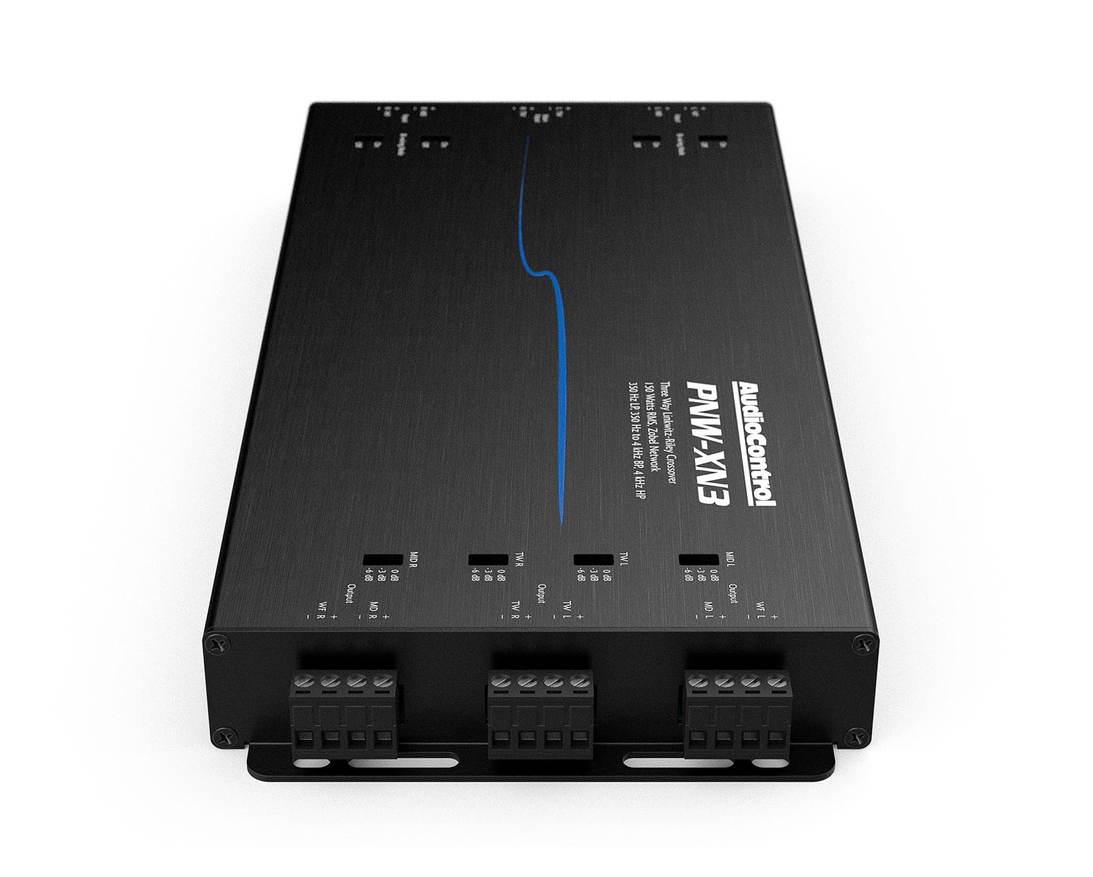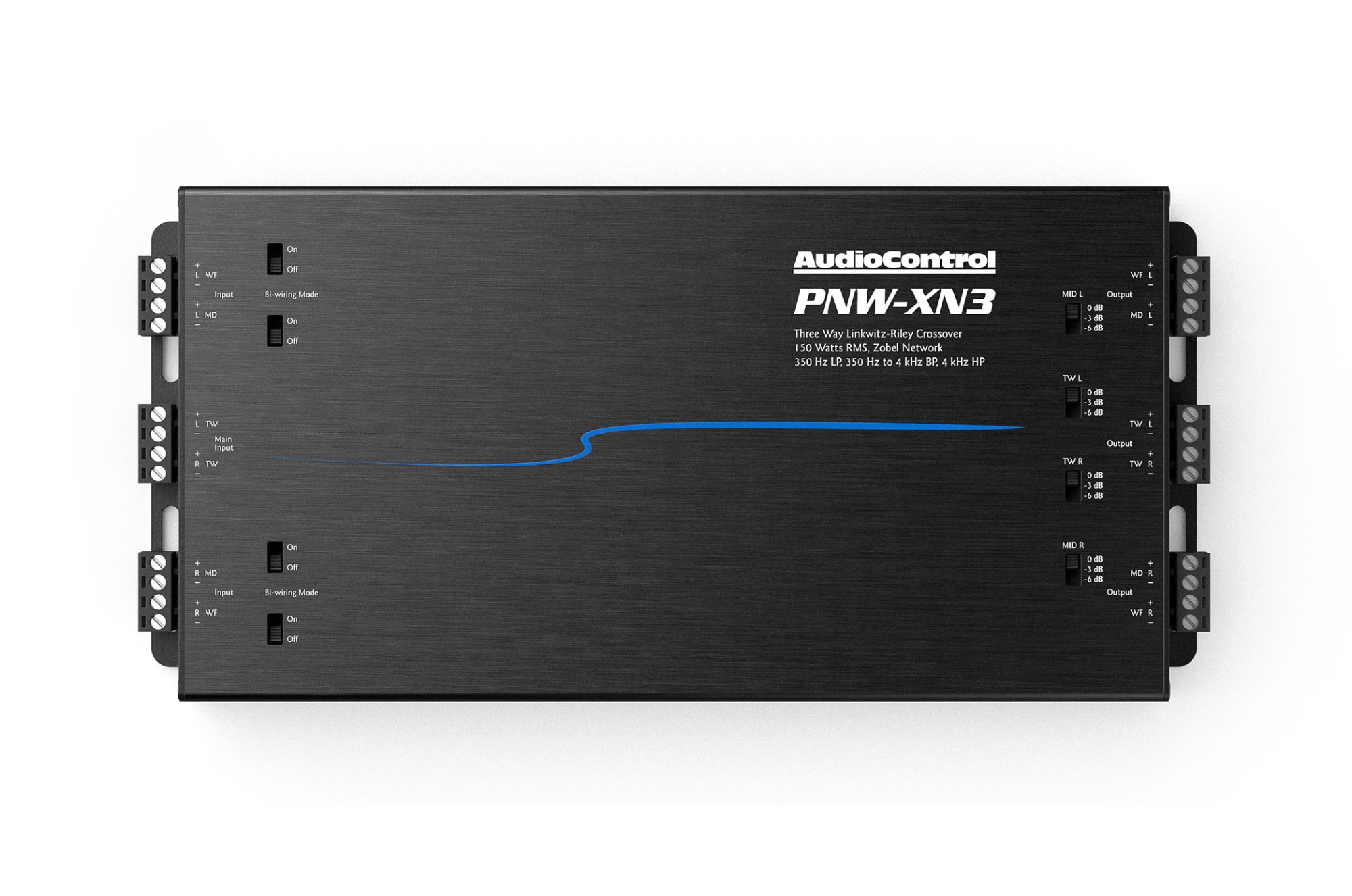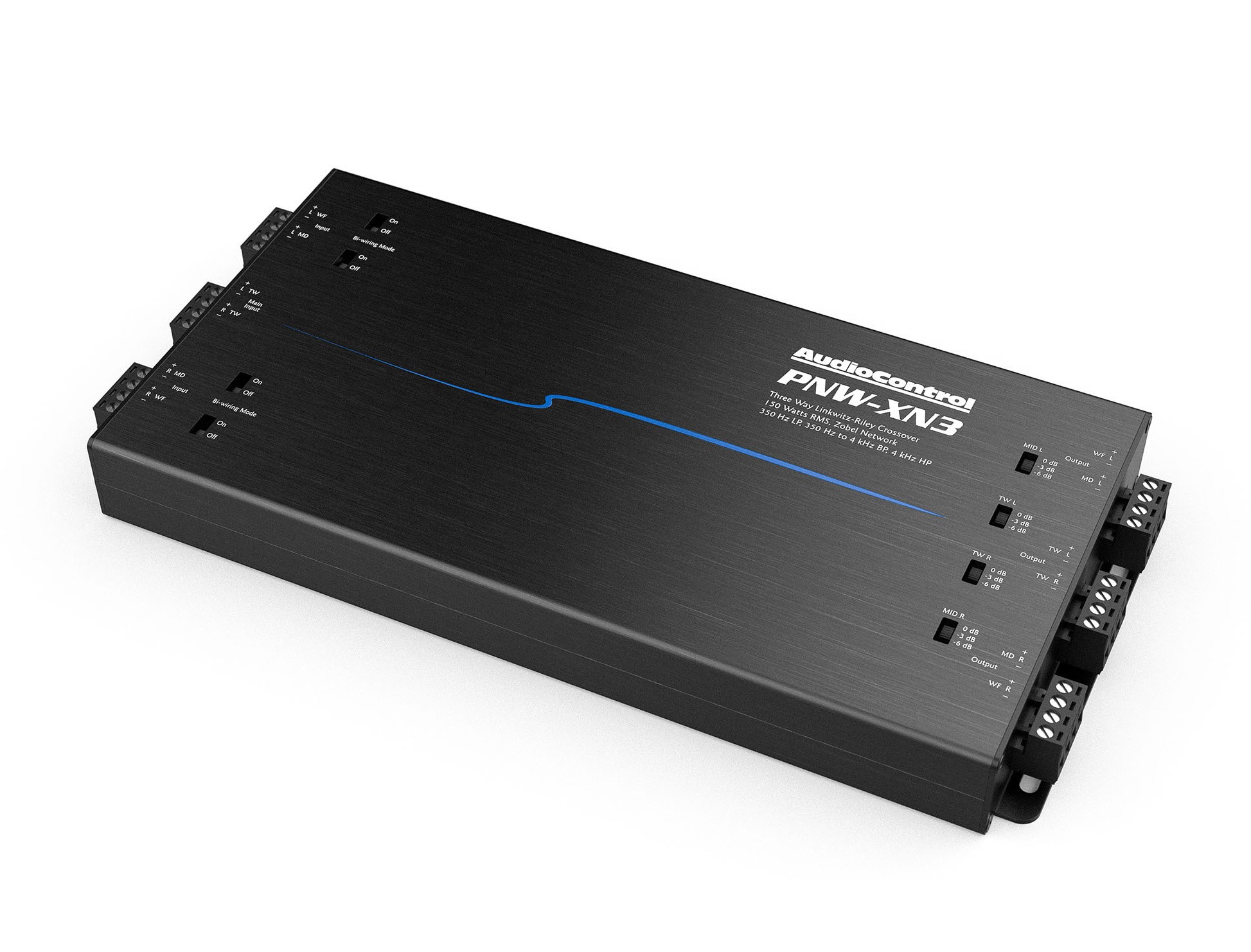 Честотните кросоувъри AudioControl PNW-XN3 позволяват лесно да се създаде пълноценна 3-лентова високоговорителна система от компонентите на серията PNW. Комбинирайки средночестотния говорител PNW-275 с двулентовите сетове PNW-65CS2 или PNW-69CS2, ще получите прецизно дефинирано разделяне на честотите и максимално балансиран звук. Мрежата използва 2. ред Linkwitz-Riley филтри и предлага честоти на разделяне 350 Hz (LP), 350 Hz – 4 kHz (BP) и 4 kHz (HP). Благодарение на това се осигурява плавен преход между ниските, средните и високите честоти. За фино настройване може да се използва затихване на високите или средните честоти в стъпки 0 / -3 / -6 dB. PNW-XN3 понася мощност до 150 W RMS, което гарантира достатъчен резерв за повечето приложения. Конструкцията на кросоувъра е компактна и лесна за инсталиране, с здрави терминали за надеждно свързване.