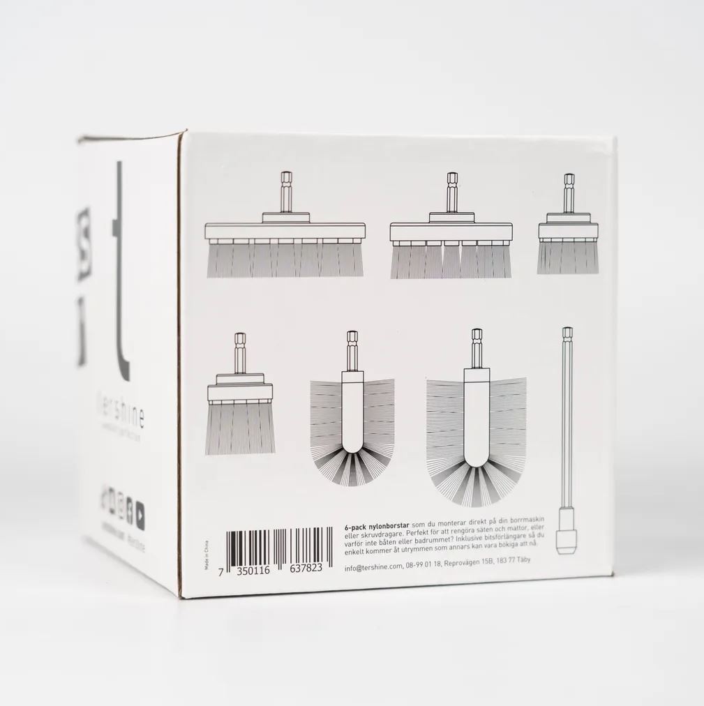 Опаковка от 6 найлонови четки, които могат да се монтират директно на бормашина или акумулаторен винтоверт. Перфектен инструмент за почистване на седалки или килими. Комплектът включва накрайник (бит) с дължина 15 см, който ви позволява достъп до места, които иначе биха били трудно достъпни. Отлично комбо в съчетание с универсалния почистващ препарат Tershine APC - не само за автомобил, но и за използване в дома. Също така превъзхожда в комбинация с Tershine Extract при упорити и устойчиви замърсявания например на балкона, фасадата, лодката или други външни повърхности.