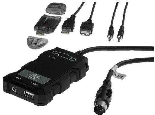 Адаптер, който позволява свързване на USB вход и AUX вход (3,5 JACK) към OEM авторадиа с управление на CD чейнджър (на мястото за свързване на CD чейнджъра). Управление на възпроизвеждането на музика от USB аксесоари чрез OEM авторадиото.