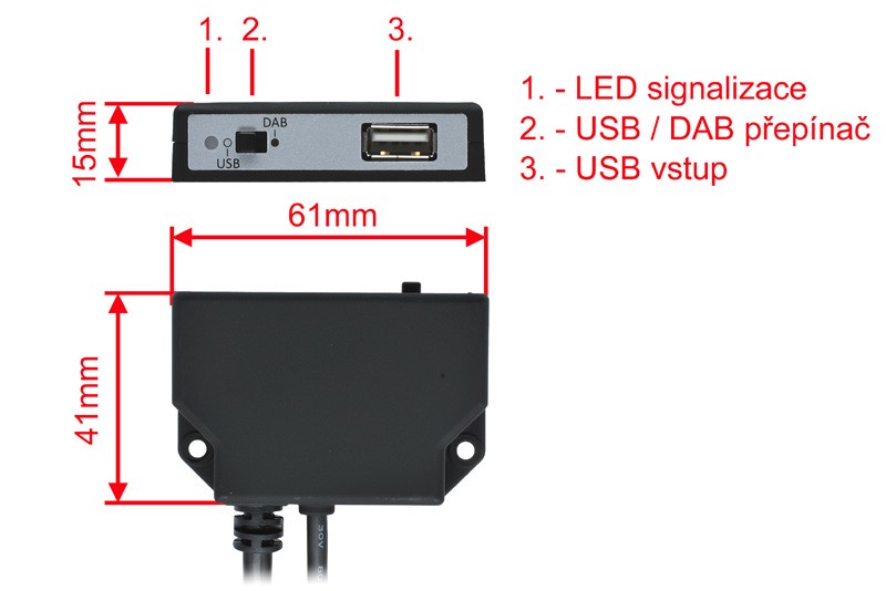 - Свързване към DAB модула чрез USB и захранващ конектор.