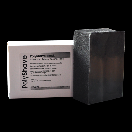 CarPro PolyShave Decon Block е малка гъбичка от пенообразен материал с нанесенa функционална повърхност от специален полимер, която може да деконтаминира повърхността на лака. Работи изключително бързо, тъй като има по-голяма работна площ в сравнение с класическия clay, перфектно следва релефа на повърхността и деконтаминацията на лака отнема по-малко време. При по-ниски температури (обикновено под 15 °C) традиционният clay се втвърдява и не може добре да следва повърхността. При CarPro PolyShave този проблем напълно отпада. Допълнително предимство на този практичен помощник е, че при падане на пода блокчето може просто да бъде измито и работата може да продължи. CarPro PolyShave Block ефективно премахва полепнала ръжда, остатъци от асфалт, окисляване и други натрупани замърсявания, които след измиване остават върху повърхността и причиняват грапавост и загуба на блясък. Подобно на clay, PolyShave може да отстрани и пръски от боядисване. След деконтаминация с PolyShave Block лакът е освободен от чужди частици, става приятно гладък и е готов за полиране или восъчно третиране.