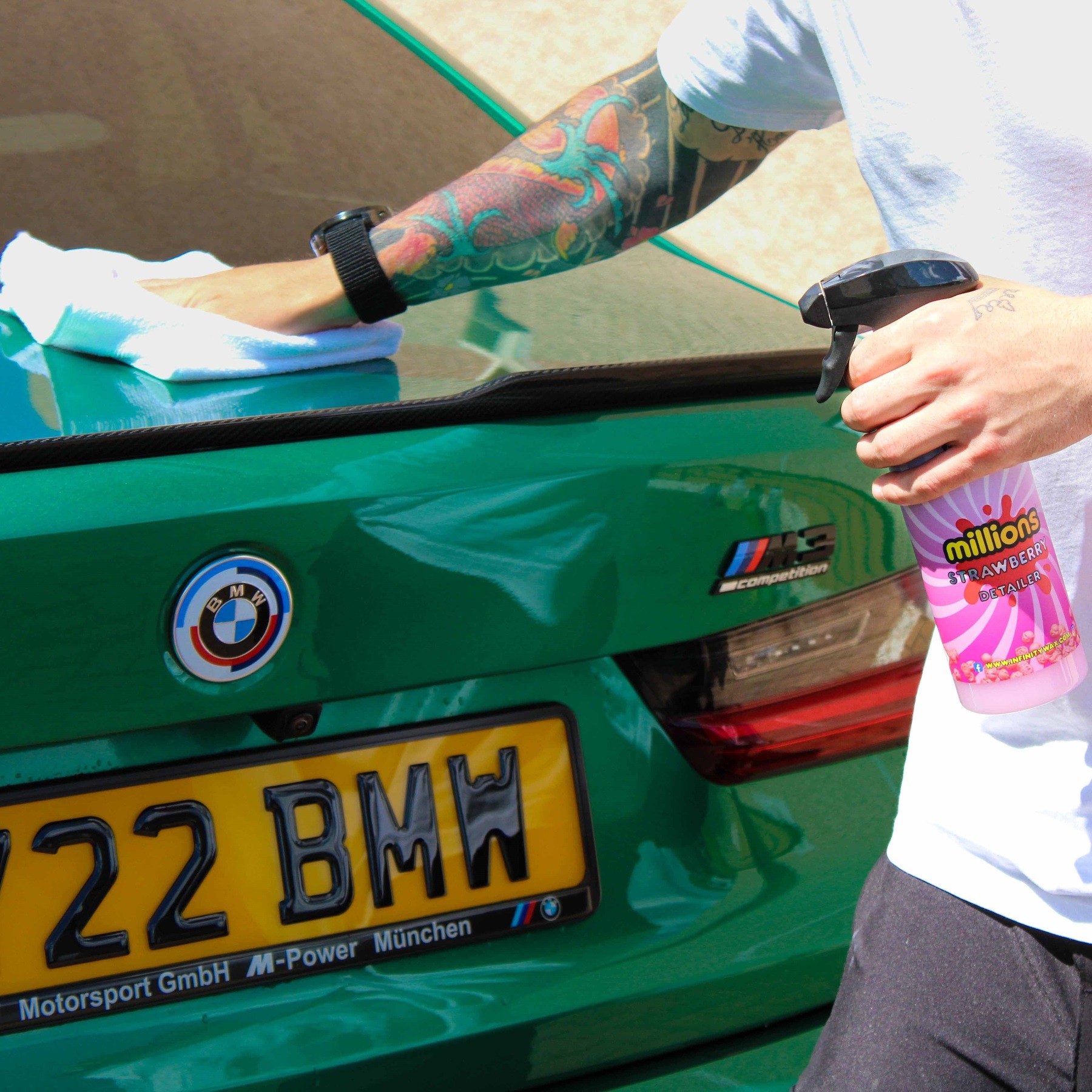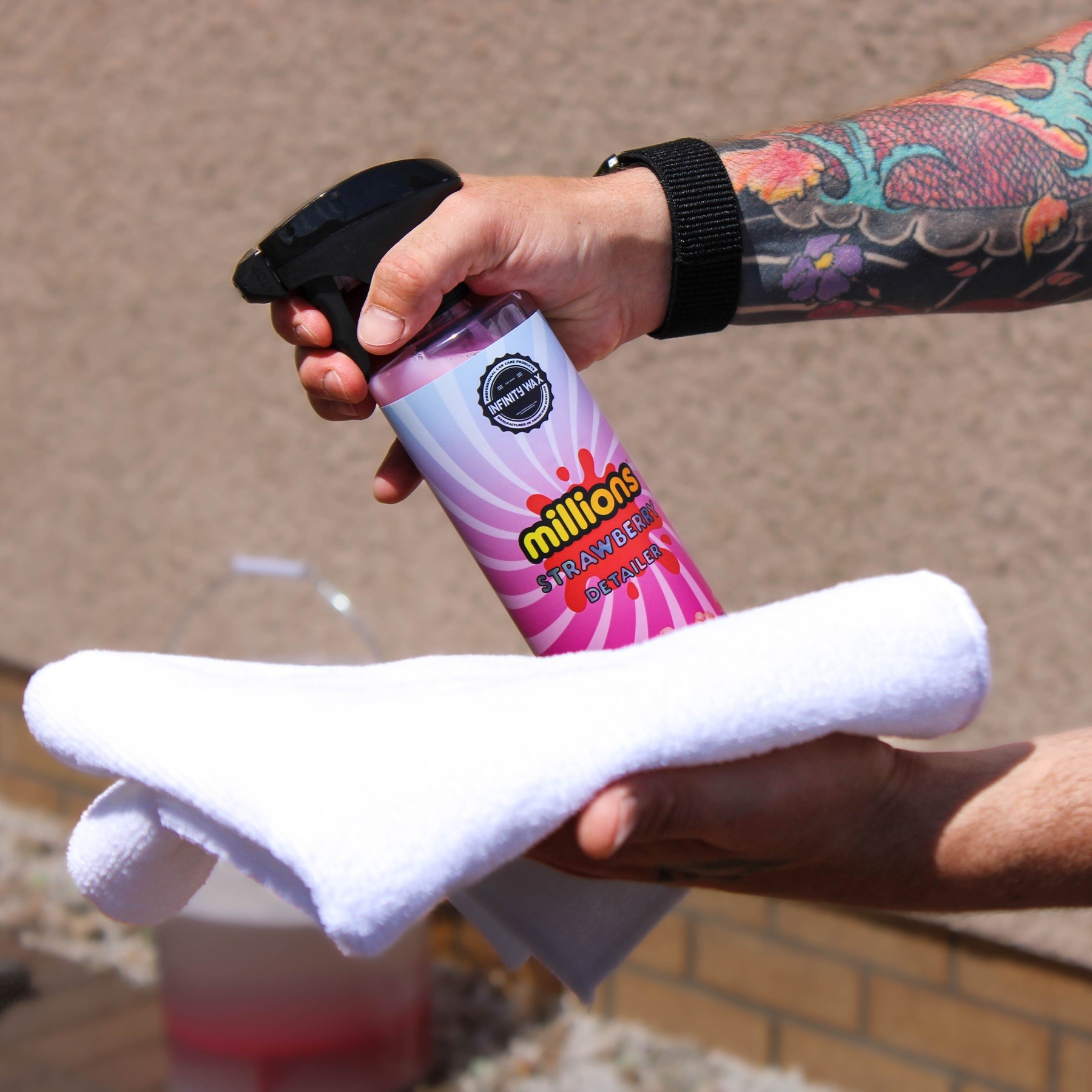 Millions Strawberry Detailer е най-бързият начин да придадете на колата си незабавен восъчен блясък, гладкост и супер бързо оттичане на вода. Достатъчно е просто да напръскате, избършете, леко полирайте и ще останете наистина възхитени от външния вид, гладкостта и представянето на този продукт. За пълно великолепие той мирише абсолютно божествено на ягоди. Strawberry Detailer използва макроемулсия на модифициран силиоксан, която е комбинирана с още пет ключови съставки за подпомагане на блясъка и лесното отстраняване на продукта с минимални усилия. Допълнителни компоненти му придават характерния бляскав и „мокър“ вид, който наподобява карнаубов восък. В същото време предлага много лесна употреба, създава водни перли, подобни на керамично покритие с SiO2, и дава възможност веднага да имате навоскан вид на автомобила. Достатъчни са 2–3 пръскания на панел, бързо избърсване с качествена кърпа и сте готови. За няколко секунди можете да имате външен вид и защита като току-що навоскан автомобил — само че ви е отнело 2 минути, а не 2 часа! Използването на невероятно приятно миришещия Strawberry Detailer е истинско удоволствие. Можете да го използвате като бърза помощ при сушене, като го напръскате върху мокър автомобил и след това го подсушите. Също така е бърз начин за почистване на външни стъкла и добавяне на известна защита, както и за употреба върху сух автомобил за постигане на най-добри възможни резултати.