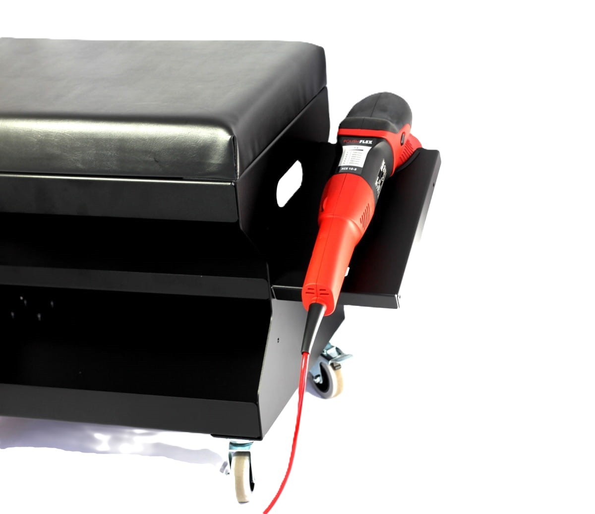 Poka Premium Detailing Seat е голяма подвижна седалка, изработена от най-висококачествена стоманена конструкция, покрита със силен слой цинк, който предпазва седалката от корозия. Седалката е от двете страни боядисана с висококачествена прахова боя с текстура, проектирана така, че да предотвратява надраскване и избледняване. Високоеластичната и издръжлива пяна на тапицерията, ламинираната MDF плоскост под нея и здравите винилови колела придават на цялата седалка стабилност и комфорт. Изработката е прецизна благодарение на напреднала CNC технология, без остри ръбове или краища. Седалката има монтажни отвори за монтиране на държач за полираща машина и държач за керамични защитни препарати. Отделните държачи могат да се монтират от лявата или дясната страна (допълнителните държачи не са включени в седалката). Под седалковата повърхност има налично място за съхранение на достатъчно количество микрофибърни кърпи, полиращи пасти или почистващи препарати. Големите колела са изработени от издръжлива гумена материя, две от тях имат спирачки, за да не се плъзга седалката при неравна повърхност.