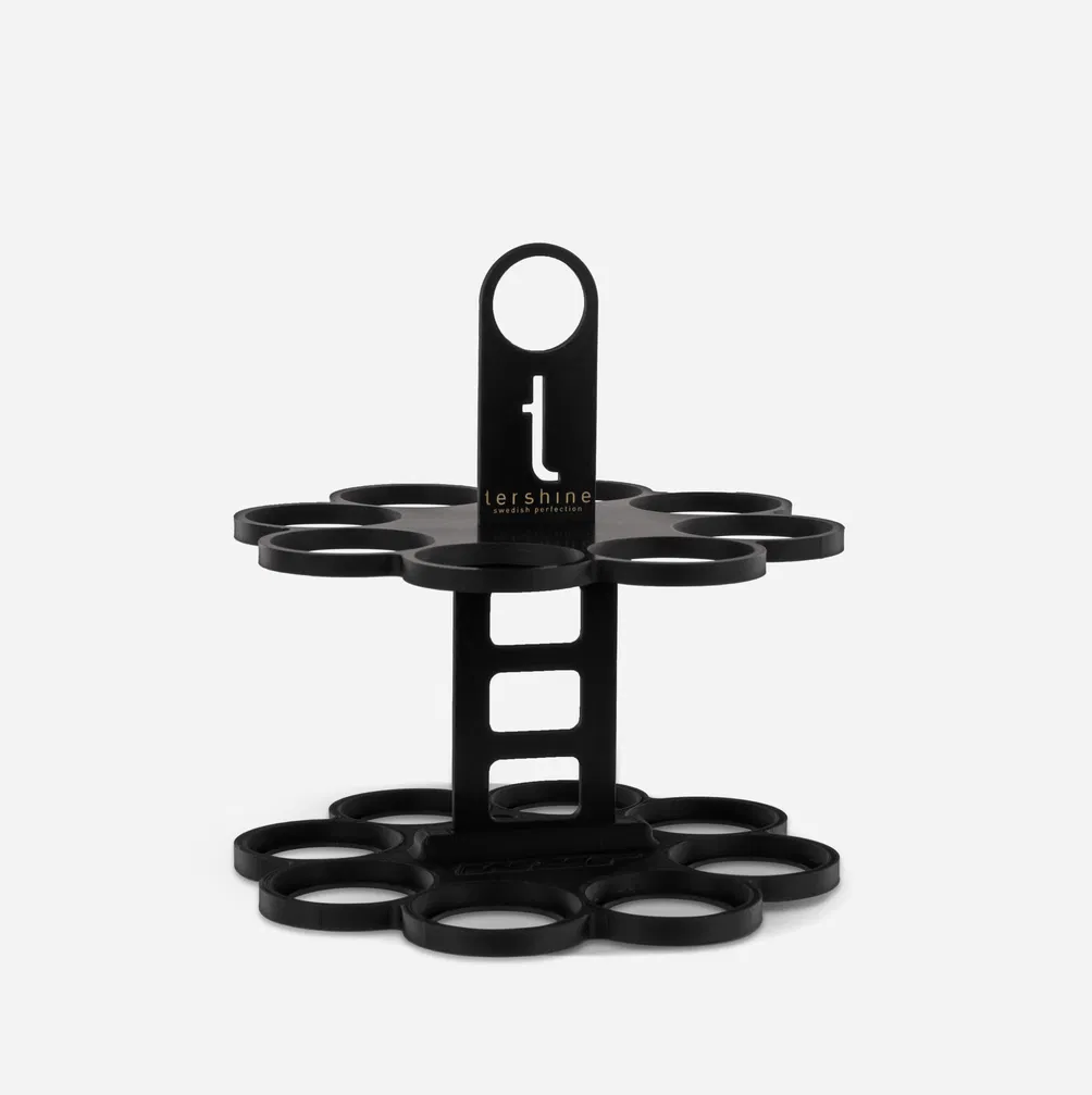 Стабилен пластмасов държач, който лесно можете да сглобите сами от три части. Това е 3D печат от здрав пластмасов материал с място за осем бутилки по 500 ml. Разбира се, в него може да се поставят и бутилки от други марки, но първоначално държачът е разработен за бутилки Tershine 500 ml. Работи отлично за съхранение в кофи, така можете лесно да пренасяте продуктите си.