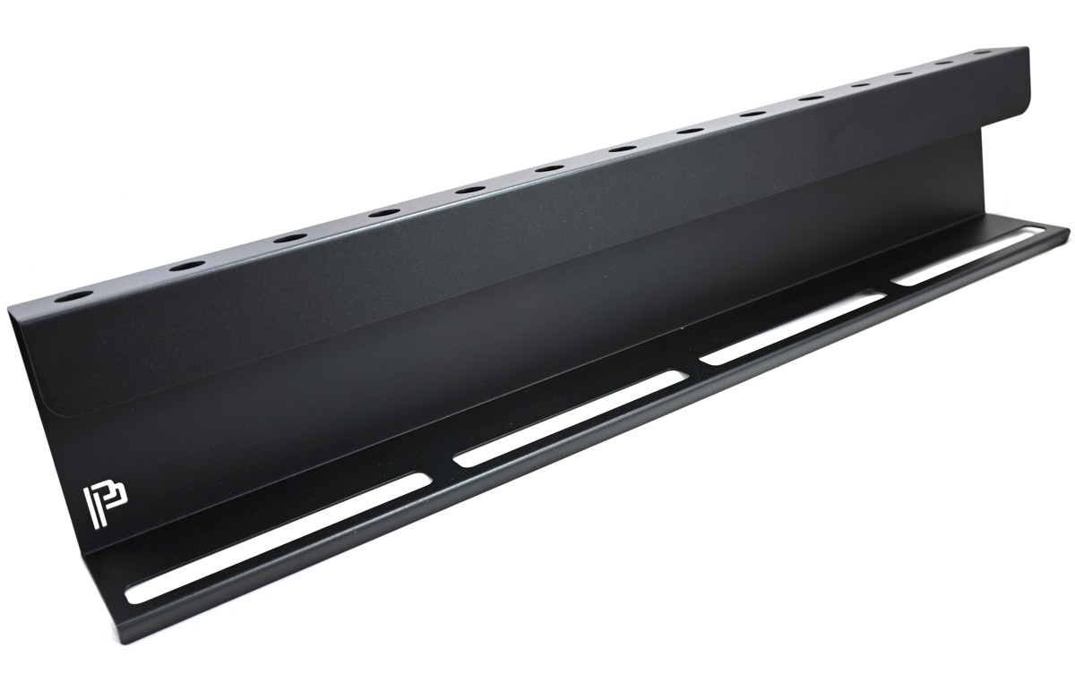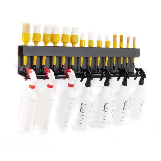 Poka Premium Holder for Brush and Bottles е функционален и удобен стенен държач за бутилки за смесване и детайлинг четки с ширина 80 cm. Горните отвори (14) са подходящи за повечето налични четки, а долните отвори (4) — за повечето видове бутилки с пулверизатор. Здравата конструкция издържа натоварване над 20 kg. Монтажните отвори за прикрепване към стената са разположени в горната част на рафта, което гарантира пълна стабилност. Държачът е изработен от висококачествен метал, боядисан с прахово покритие, което го предпазва от окисляване. Тялото на държача е обогатено с ефектно лого Poka Premium.