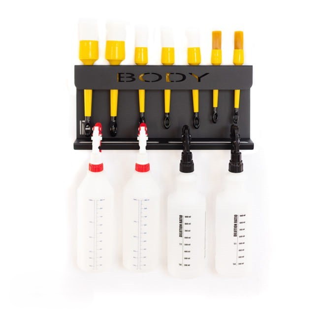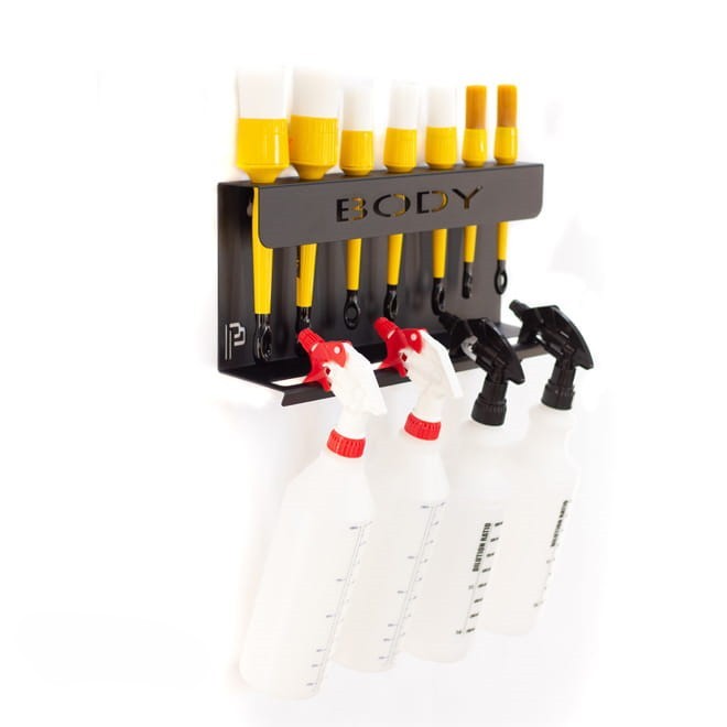 - Стенен държач за бутилки и детайлинг четки, предназначени за почистване на екстериора.