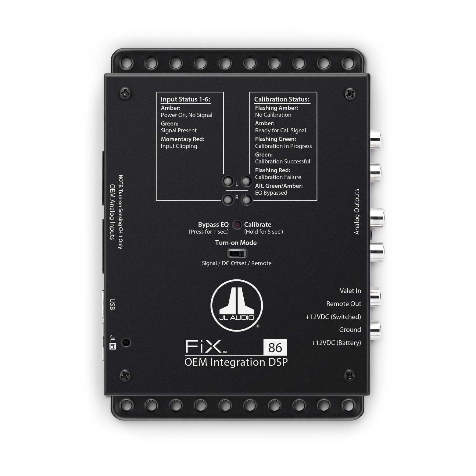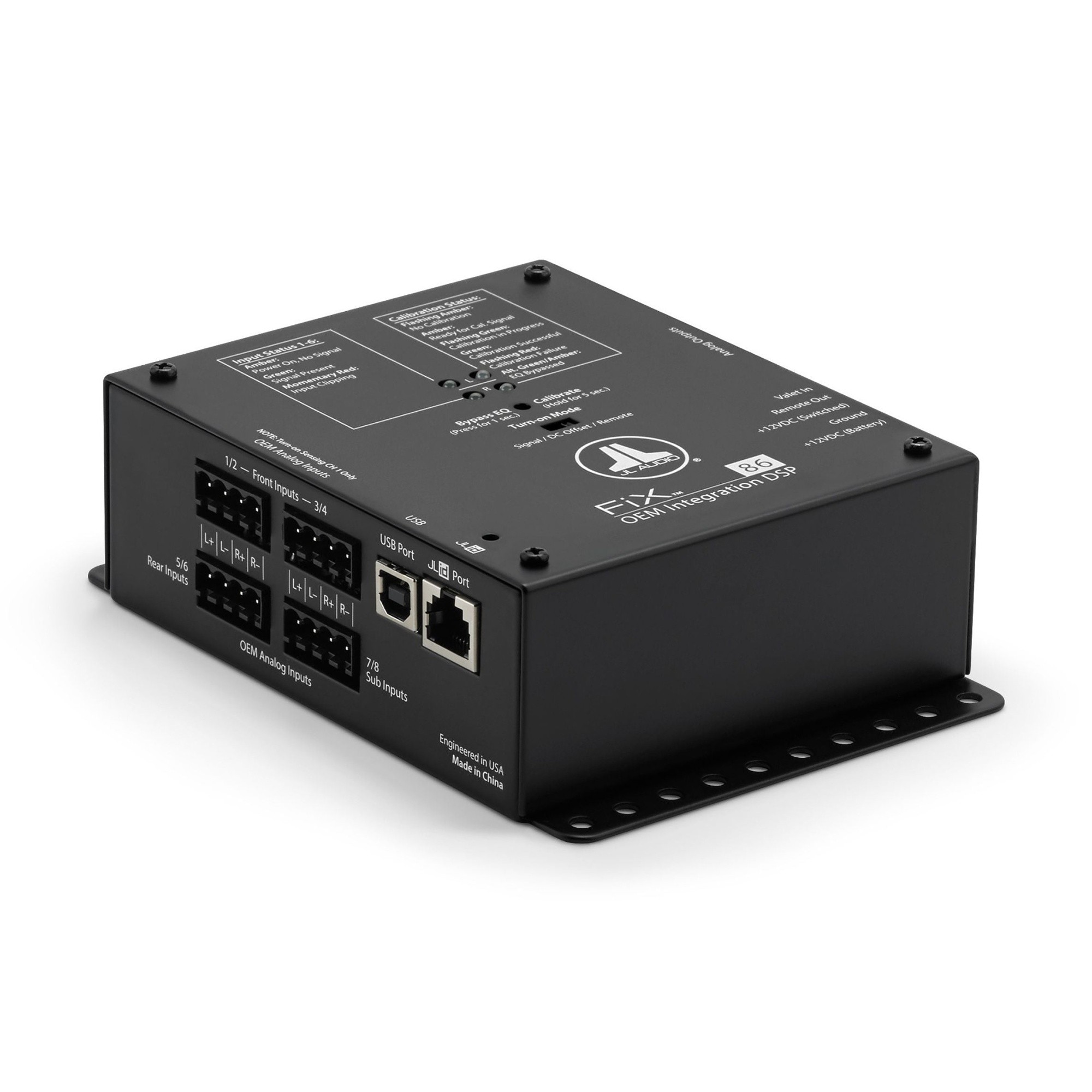 JL Audio FiX™ 86 е най-съвременният дигитален сигнален процесор, проектиран да доставя първокласен звук от фабрични аудио системи, без да е необходимо да се сменя OEM главното устройство. FiX™ 82 е първият DSP, който автоматично коригира закъснените във времето фабрични изходи преди сумиране на сигнала и EQ корекция. С мощен 24-битов DSP процесор и два вградени 1/3-октавни еквалайзера, комплексните 2-лентови, 3-лентови и 4-лентови фабрични аудио изходи се комбинират и автоматично се адаптират по нива до плосък стерео сигнал с пълен обхват. Диференциално балансираните входове приемат практически всеки аналогов аудио сигнал от OEM — от нисконапрежен, линейно ниво до високо мощни усилени говорителни изходи (до 30 V RMS). Калибрирането започва само с натискането на един бутон и завършва за около 30 секунди, без нужда от специално оборудване. Свързването на компютър със софтуера TüN™ чрез USB дава достъп и до пълен набор диагностични панели, които показват честотния отговор на входните сигнали и коригираните изходи. Възможно е коригиране на полярността на входа, заглушаване и филтриране, както и иницииране на нови калибрации от компютър. Кликвайки върху таба „TUNE“ в интерфейса TüN™ ще получите достъп и до двойка потребителски регулируеми 10-лентови графични еквалайзери за фина настройка на изходните сигнали. Вариантите за изход включват 3 чифта RCA конектори (4 V RMS) или цифров оптичен (Toslink) изход с поддръжка на PCM (S/PDIF) звук с резолюция 24 бит/48 kHz. Сред начините на активация са 12-волтово или автоматично (Signal/DC-Offset Sensing), плюс отделен изход за дистанционно включване за активиране на вашето допълнително оборудване. Свържете опционалния цифров дистанционен контролер DRC-100 (продава се отделно) и добавете възможности за главно управление на силата на звука от мястото на шофьора. Оградените входни сигнали и общият статус също се докладват чрез многоцветен статусен LED на DRC-100. Постигнатият отличен звук от вашето фабрично стерео никога не е бил по-лесен и никога не е звучал по-добре.