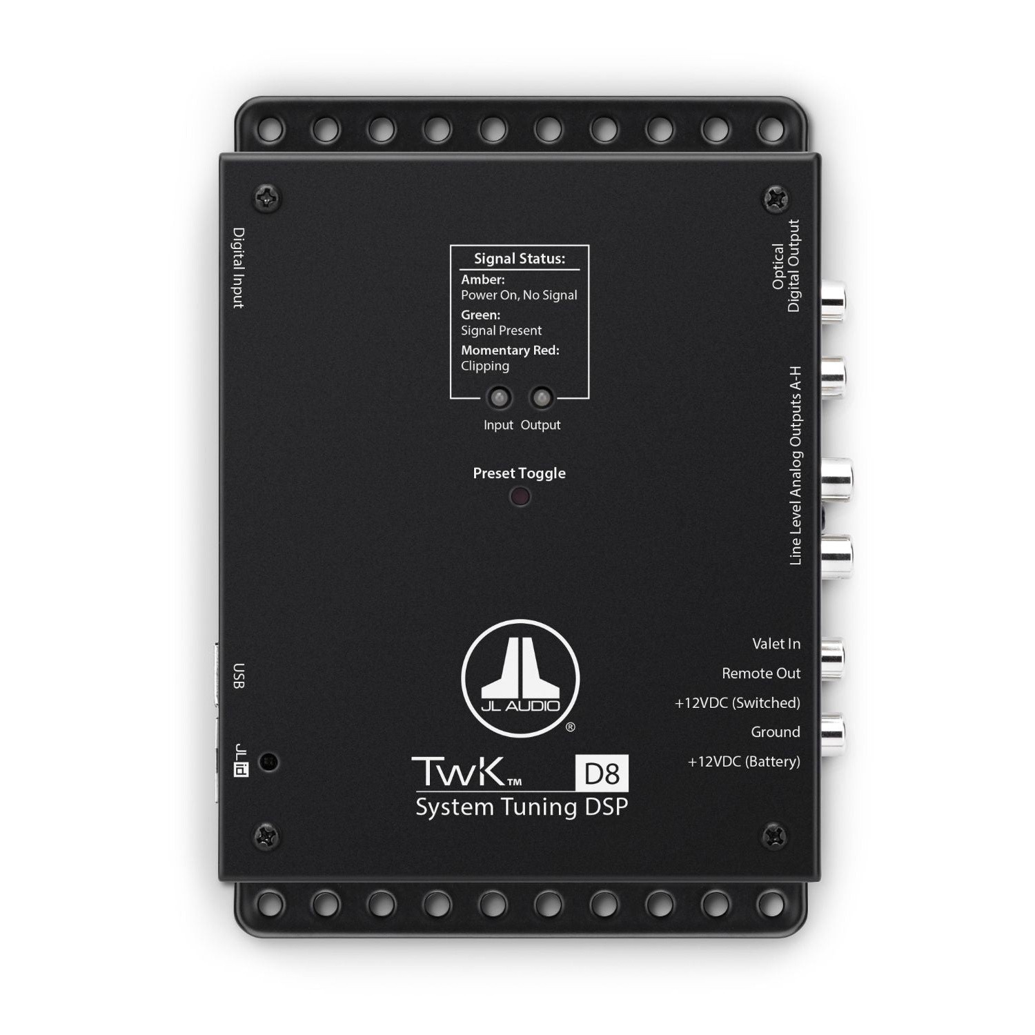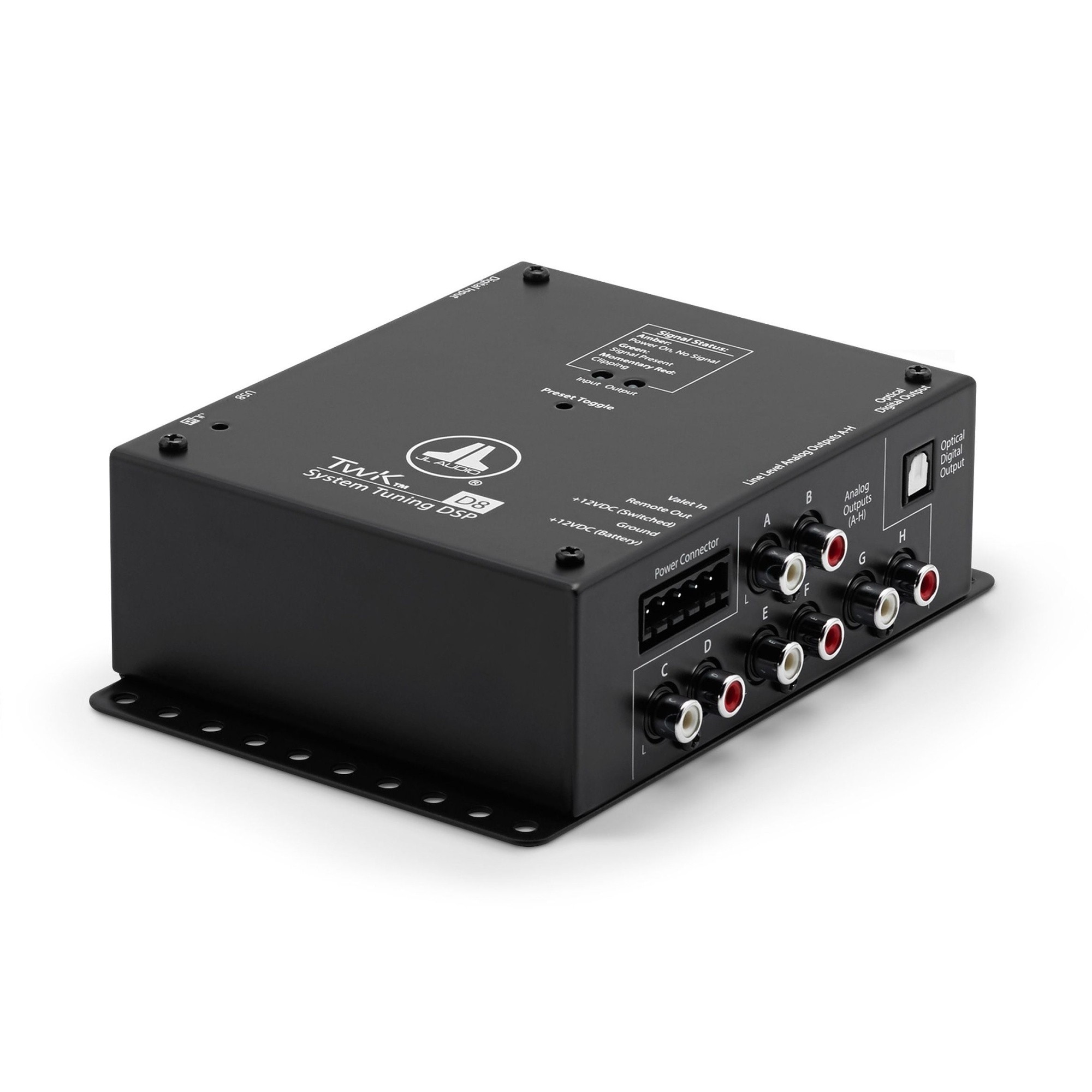 TwK™ D8 е съвременен цифров сигнален процесор, проектиран да предостави първокласни възможности за настройка на системата в лесен за употреба формат. TwK™ D8, оборудван с усъвършенстван 24-битов DSP процесор, разполага с цифров оптичен (Toslink) вход и се свързва директно с JL Audio FiX™ 82 OEM Integration DSP или с всеки 2-канален цифров (S/PDIF) изход. TwK™ D8 също така предлага гъвкави изходни възможности, общо 80 ленти еквализация и мощни миксиращи инструменти. Приложеният цифров дистанционен контрол DRC-200 предлага двустепенно управление, превключва до шест предварителни настройки и има LED индикатор. Управлявайте целия набор от функции на TwK™ D8 чрез свързване към компютър през USB с помощта на съпровождащия софтуерен интерфейс TüN™.