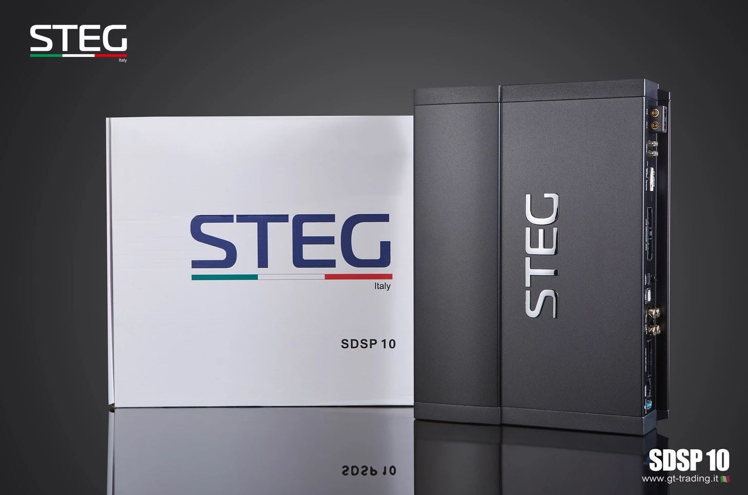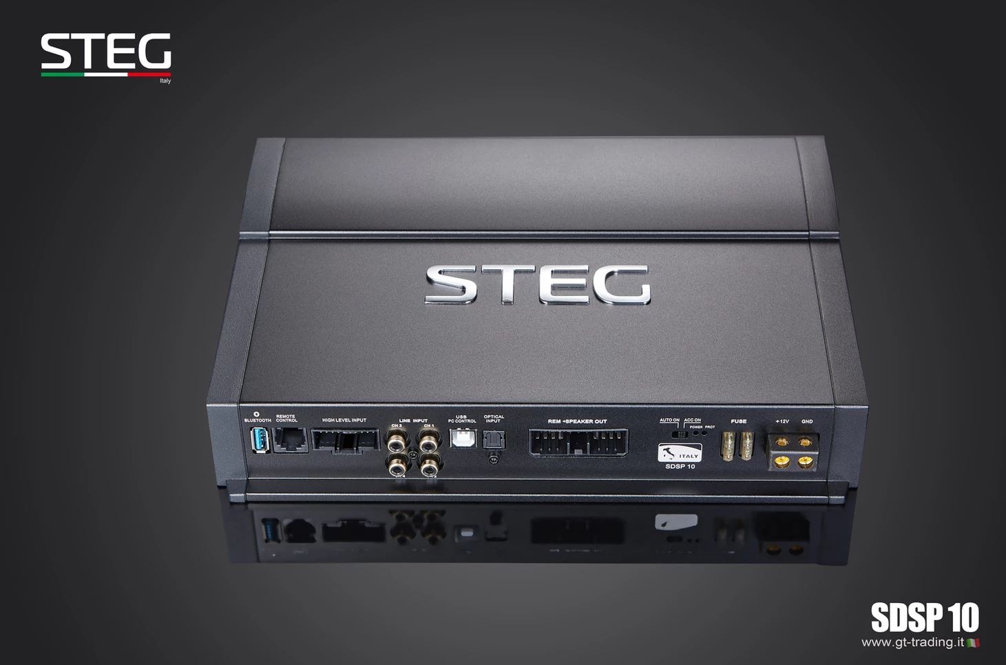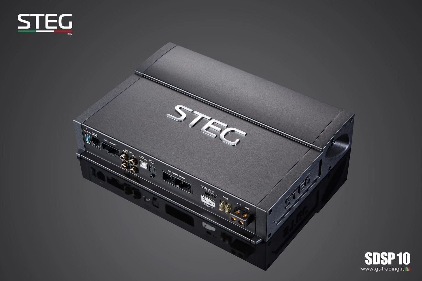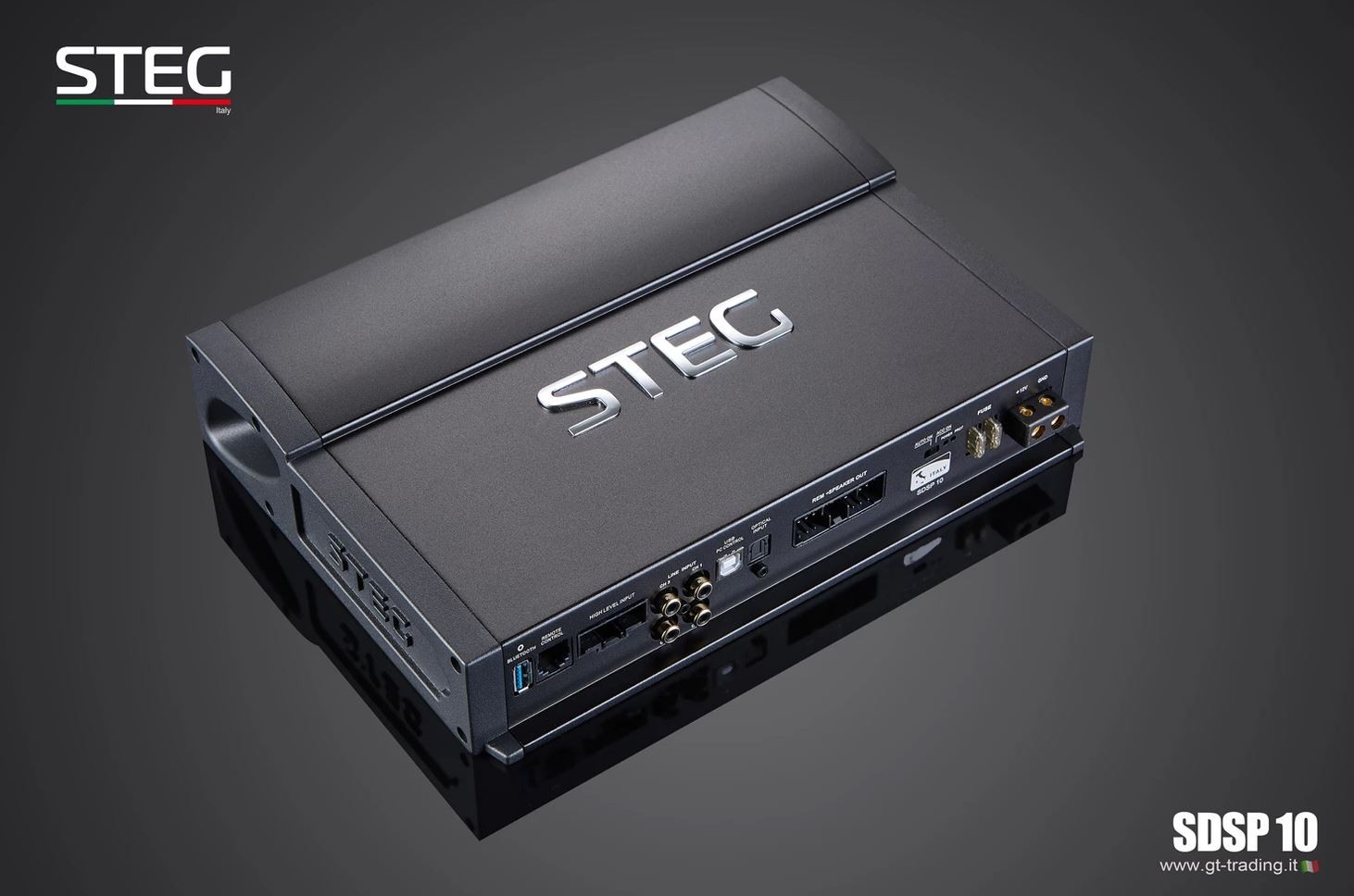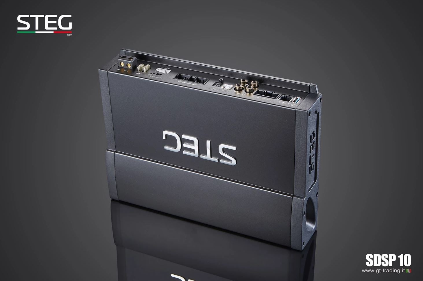 Новите усилватели STEG Upgrade обхващат години разработка и часове слушателски тестове с цел да бъдат избрани най-добрите материали и да бъдат обединени в един продукт. Новият DSP процесор SDSP10 е идеално изражение на възпроизвеждането на звук и некомпромисния дизайн. Достатъчно е да премахнете оригиналния усилвател и да го замените с този нов усилвател STEG, за да оцените веднага радикалната промяна в качеството на звука, без да е необходимо да променяте каквито и да е отвори или да срязвате някакви кабели от оригинала. В STEG не са пренебрегнали нито един детайл, за да внесат в автомобила прецизно възпроизвеждане на концерт на живо. Още един продукт, който се готви да стане референтен за световния пазар! Усилвателят SDSP10 е проектиран от отдел „Изследване и развитие“ на GTTrading за постигане на максимално качество на звука в OEM интеграционни приложения. Мощният софтуер за настройка демонстрира способността да управлява многоканално устройство в едно компактно тяло. Благодарение на иновативната крайна степен е възможно да се постигне мощност 800 W. С 2 цифрови изхода за задвижване на още външен усилвател. Развитият мощен софтуер позволява на една страница да се настроят лесно и интуитивно всички DSP функции вътре в усилвателя, така че да могат да го използват и по-малко опитни потребители. Възможност за използване в офлайн режим, така че можете по всяко време да създадете конфигурация и да я вкарате в DSP.| Каталожен номер | SDSP 10 |