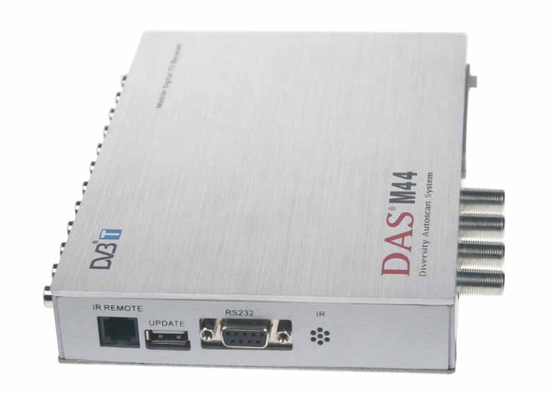 TV тунер за прием на цифрово телевизионно излъчване DVB-T с функция DIVERSITY AUTOSCAN - DAS. Системата DAS е сърцето на този DVB-T телевизионен тунер. Обикновените DVB-T тунери са базирани на обикновени домашни приемници, които осигуряват достатъчно качество на изображението само когато са неподвижни. В подвижно превозно средство силата и посоката на приетия сигнал постоянно се променят. Затова системата DAS чрез 4 тунера извършва постоянно автоматично търсене на най-силния наличен сигнал, което гарантира възможно най-добро качество на изображението на приетата станция. Ако са налични няколко сигнала на дадена станция, системата избира най-силния от тях. Търсенето на най-силния сигнал се извършва автоматично и зрителят може да гледа избраната станция без прекъсвания. Благодарение на четирите вградени тунера системата може спокойно да приема цифрова телевизия и при движение със скорост до 230 km/h. В комплекта са включени дистанционно управление, външен инфрачервен приемник и свързваща кабелна инсталация. Менюто на тунера е изцяло на чешки език!