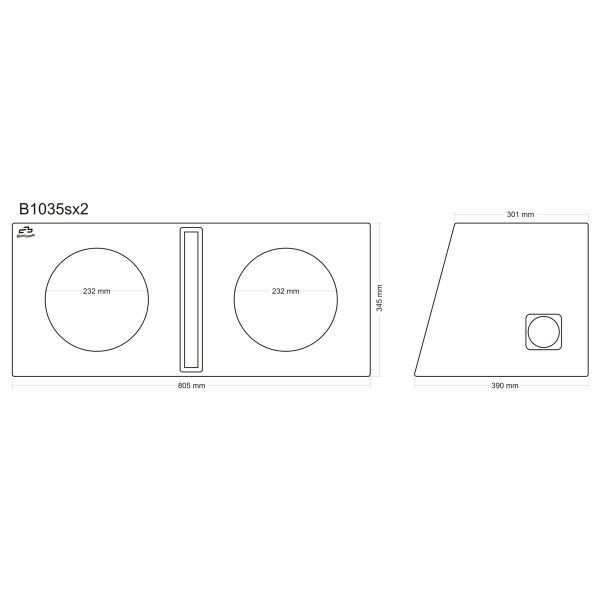 | Размер на отвора за субуферОтвор за съответната диаметрална категория субуфери. За 300 mm субуфер отворът обикновено е около 28,3 см. Монтажните диаметри на субуферите обикновено са стандартизирани, така че няма нужда от промени. | 2 x 25 cm (10\") |