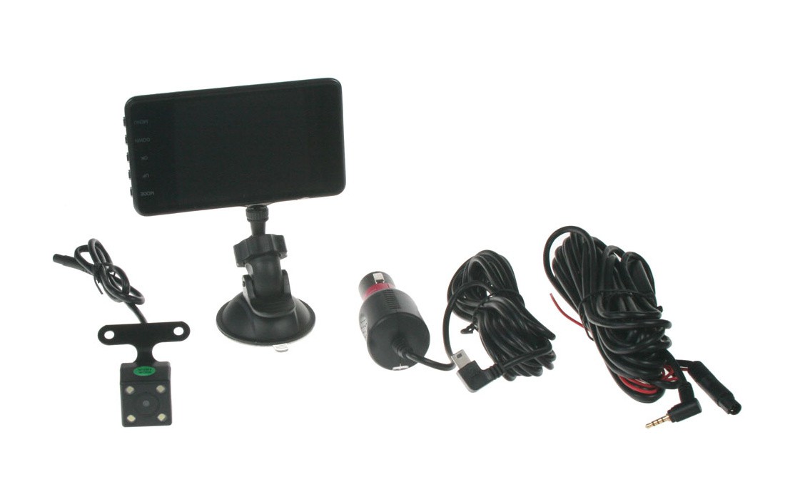 - съдържание на опаковката: камера, шарнирна стойка с вендуза за стъкло, задна камера със стойка, USB кабел, автомобилно зарядно 12/24V