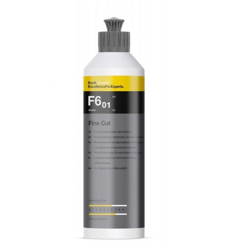 Висококачествена полираща паста за машинно полиране от най-ново поколение в уникално качество с алуминиев оксид. Интелигентната гранулация осигурява много бързо безостатъчно премахване на драскотини, възникнали в миялни линии или при грубо миене. Придава на лака траен и дълбок блясък. Може да премахне следи от шлайфане със шкурка с грубост P2500. Паста Fine Cut F6.01 е следователно най-подходящото решение за перфектно полиране на средно до силно обезцветени лакове. Отлично решение за полиране на лакове, устойчиви на надраскване.Основни характеристики