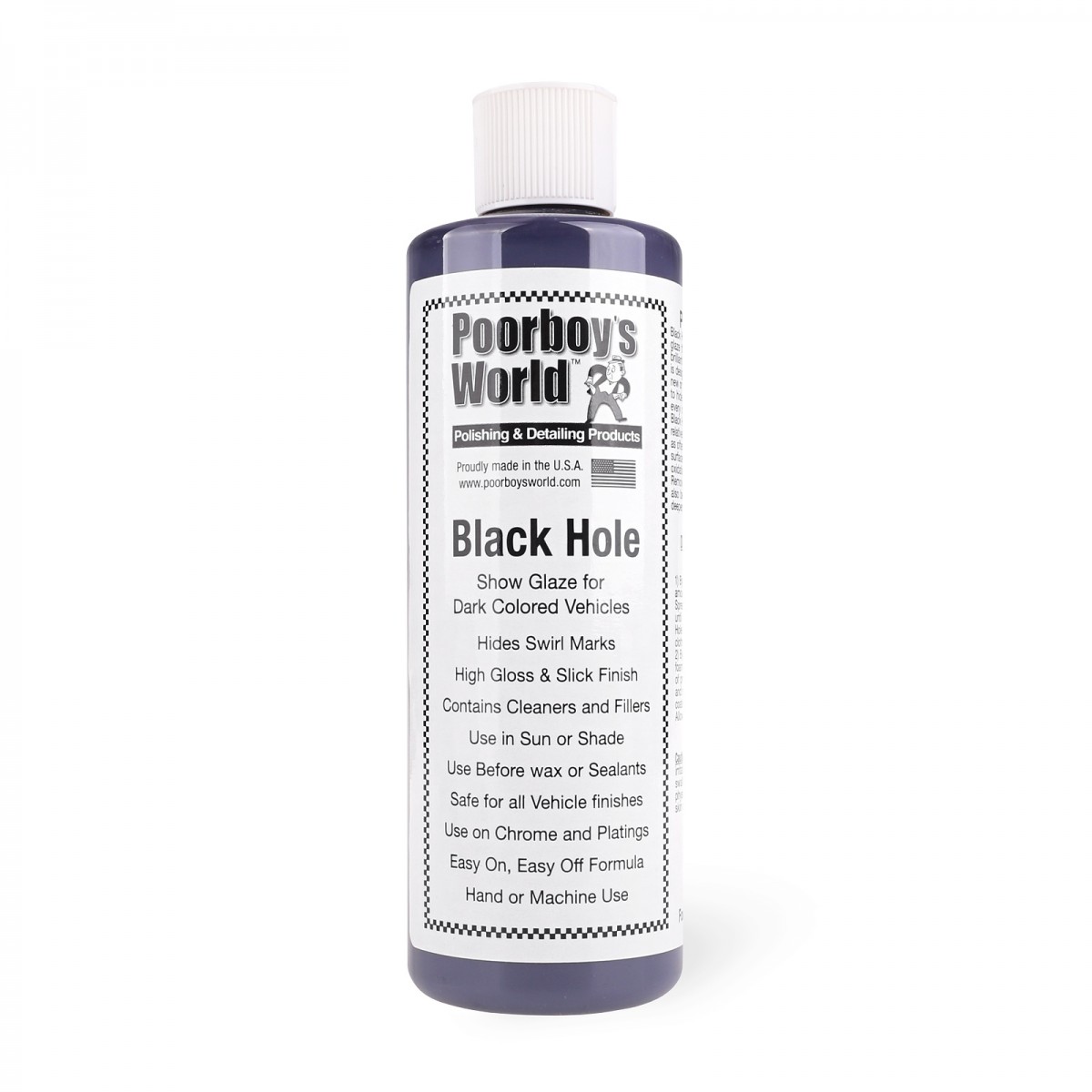 Black Hole е лесно приложим глейз за тъмни лакове - най-продаваният продукт на Poorboy's в света. Помага да се извлече максимума от тъмните цветове и спомага за маскиране на леки холограми, драскотини и цветови несъвършенства. Black Hole е предназначен за детайлъри, автомобилни ентусиасти и собственици на изложбени автомобили, които искат да имат на разположение най-добрия и най-дълбокия блясък. Може да се нанася толкова често, колкото е необходимо. Може да бъде допълнен с восък или sealant, или да се остави само така върху изложбени автомобили. Black Hole може да се нанася ръчно или машинно. Може да го нанасяте както на слънце, така и на сянка.Основни характеристики
